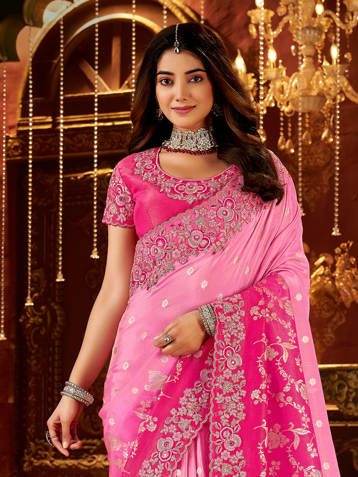 Featuring rich shaded tones, this rani pink soft silk saree is detailed with embroidery, sequins, mirror work, stone, zardosi, and zari work. Completed with an unstitched blouse piece, it is perfect for weddings and festive celebrations.