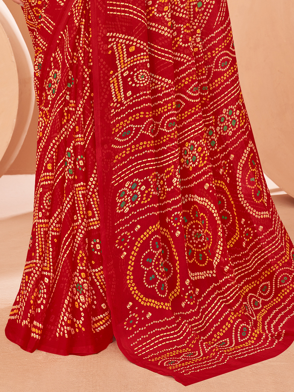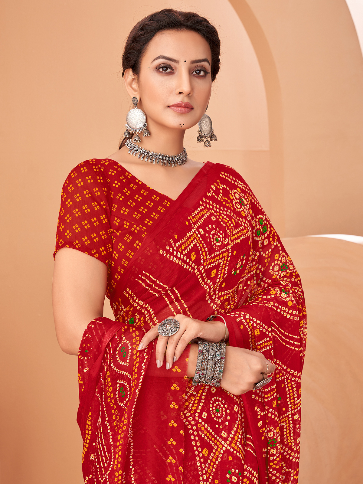 Crafted in soft chiffon, this red saree displays intricate bandhani prints for a classic ethnic appeal. Flowing and lightweight, it drapes beautifully for comfort and elegance. Paired with an unstitched blouse piece, it is ideal for festive gatherings, puja rituals, and casual celebrations, adding a timeless, traditional charm to your wardrobe.