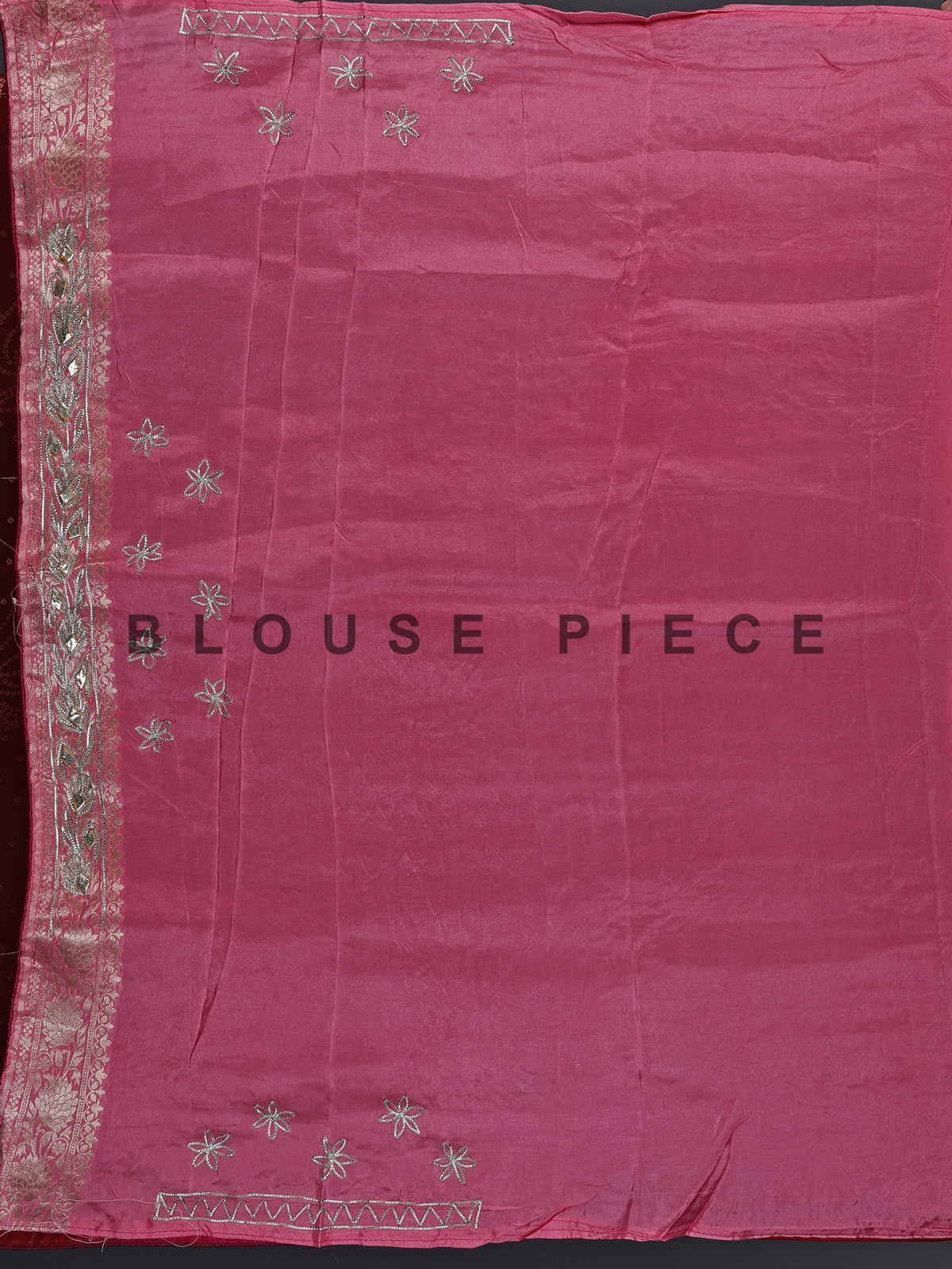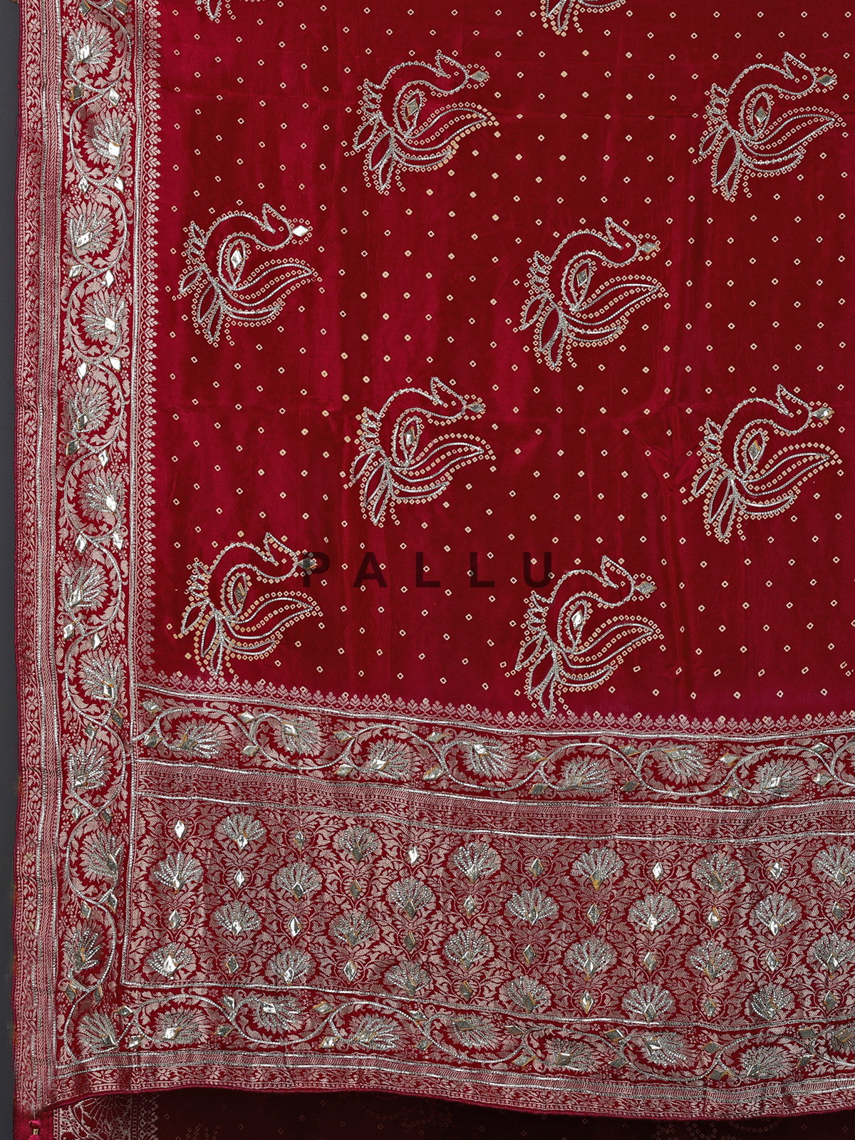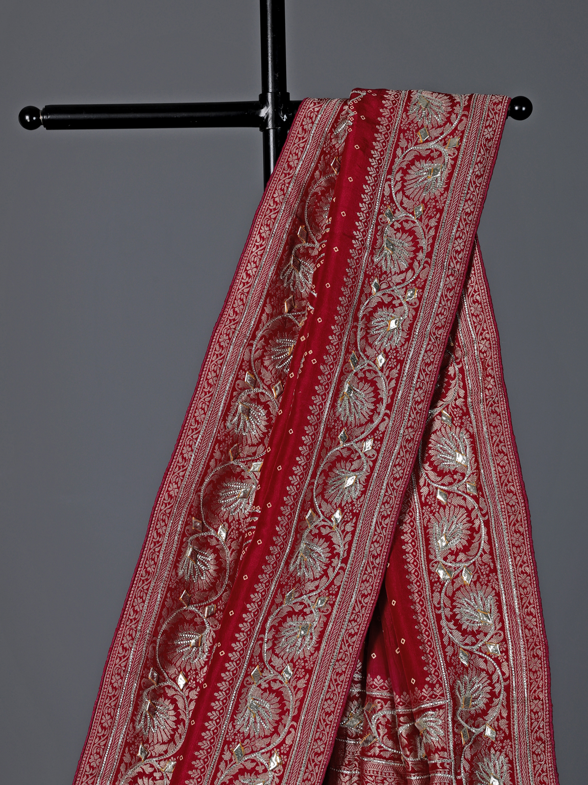 Wrapped in timeless tradition red bandhej silk saree. Radiates festive vibrance with its intricate printed patterns. Adorned with delicate gota and zari work. It reflects graceful craftsmanship. Perfect for weddings, sangeet and puja celebrations. It comes with an unstitched blouse piece for a customized, elegant finish.