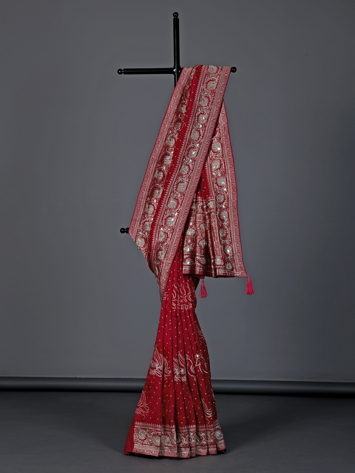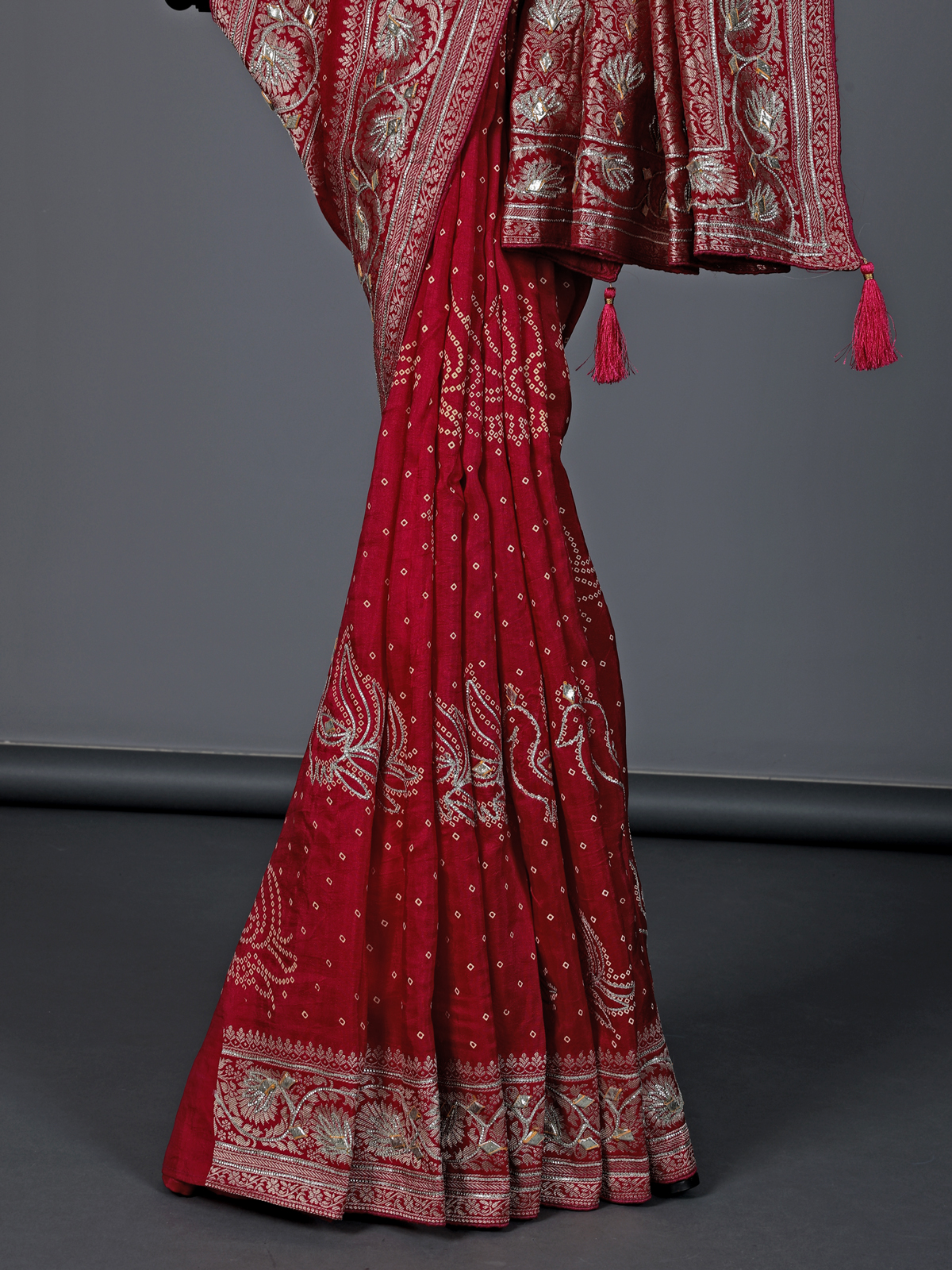 Red Bandhej Silk Gota And Zari Festive Saree Ensemble