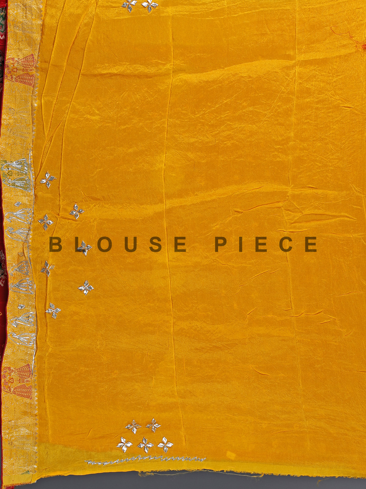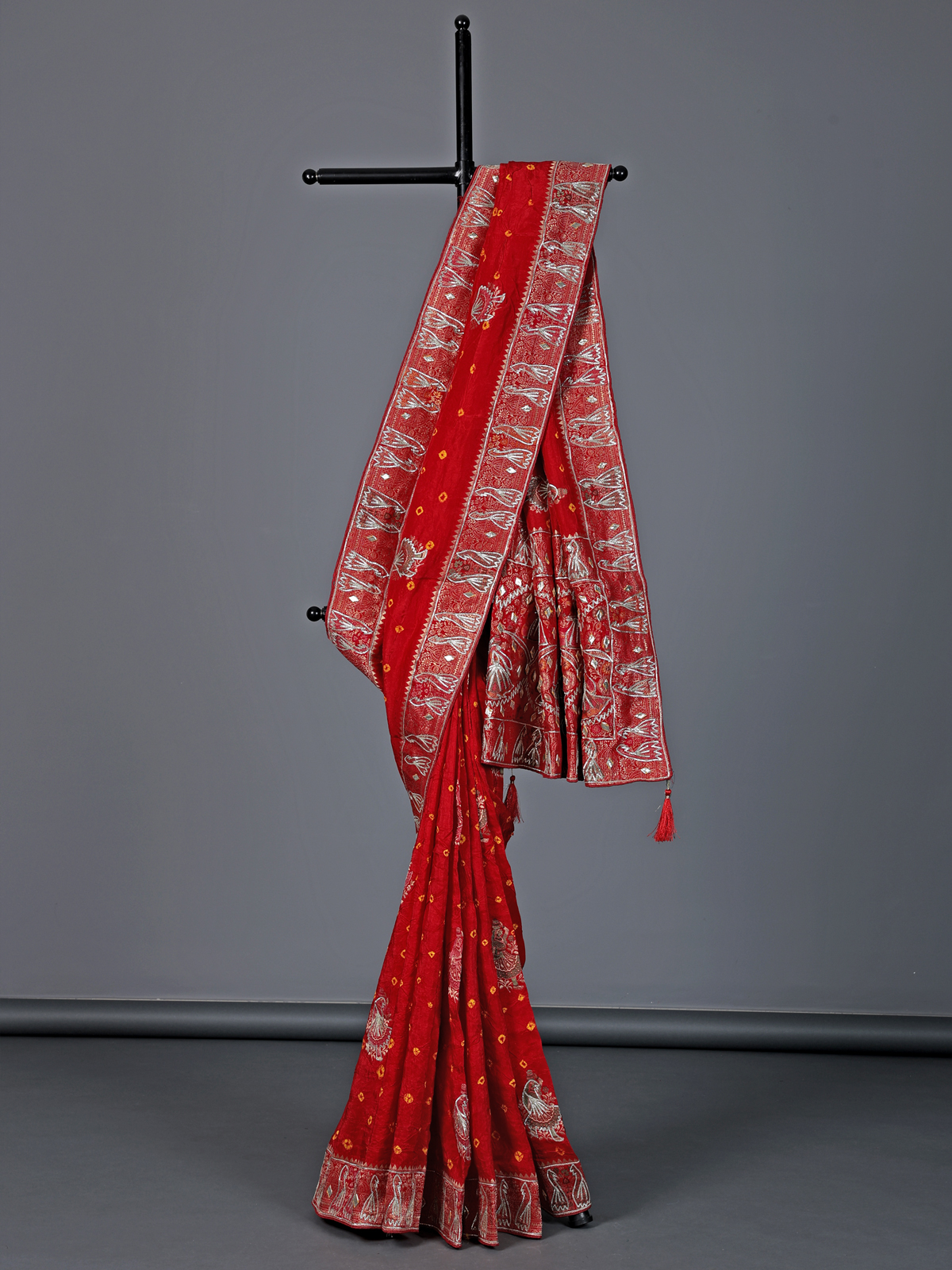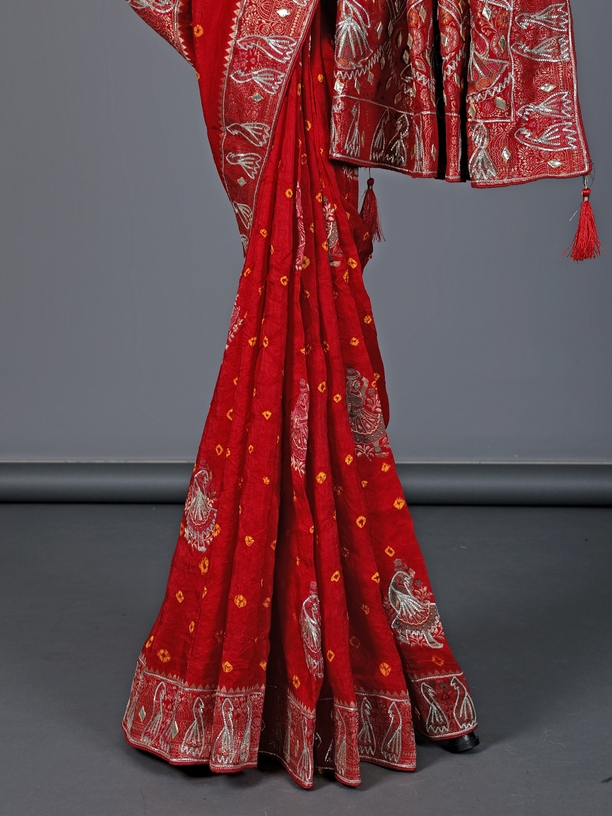 Vibrant and radiant red bandhej silk saree reflects timeless festive charm. The traditional print combined with gota and zari detailing adds graceful shimmer. Perfect for weddings and sangeet occasions. It comes with an unstitched blouse piece for a refined and personalized ensemble.