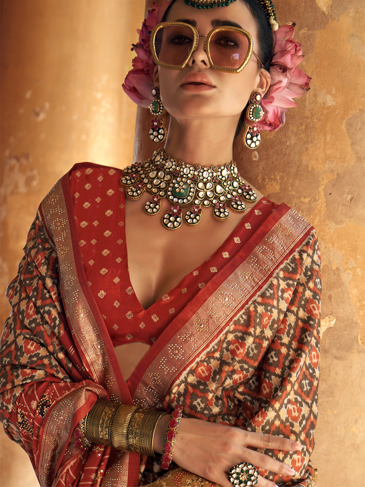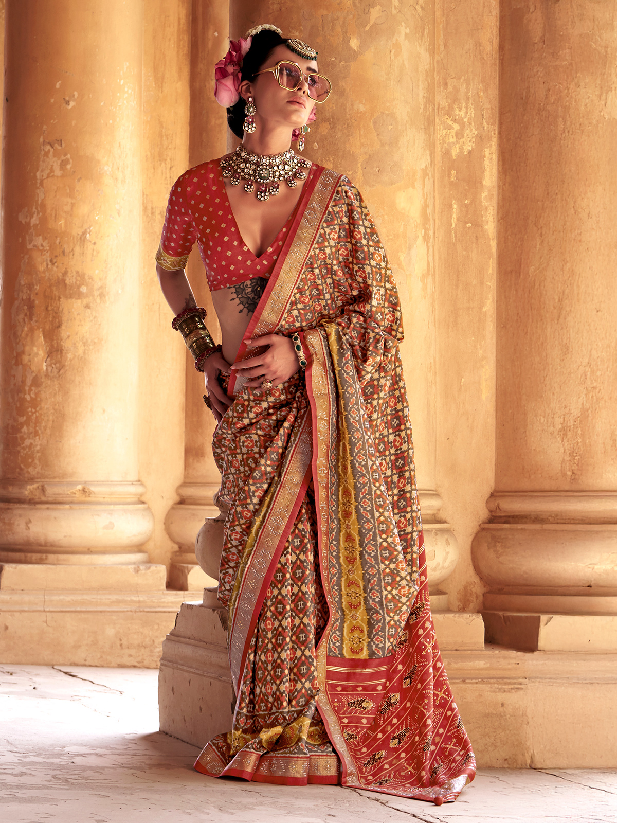 This red and beige patola silk saree features vibrant printed artistry enriched with stone and zari highlights. Its luxurious texture and traditional charm make it perfect for festive gatherings and weddings. The elegant drape adds grace, and it comes with an unstitched blouse for personalised tailoring.