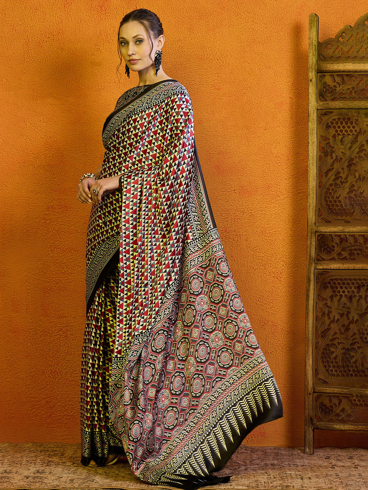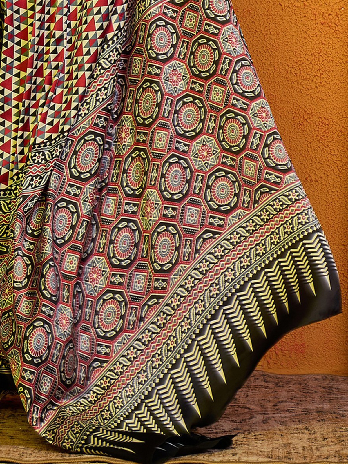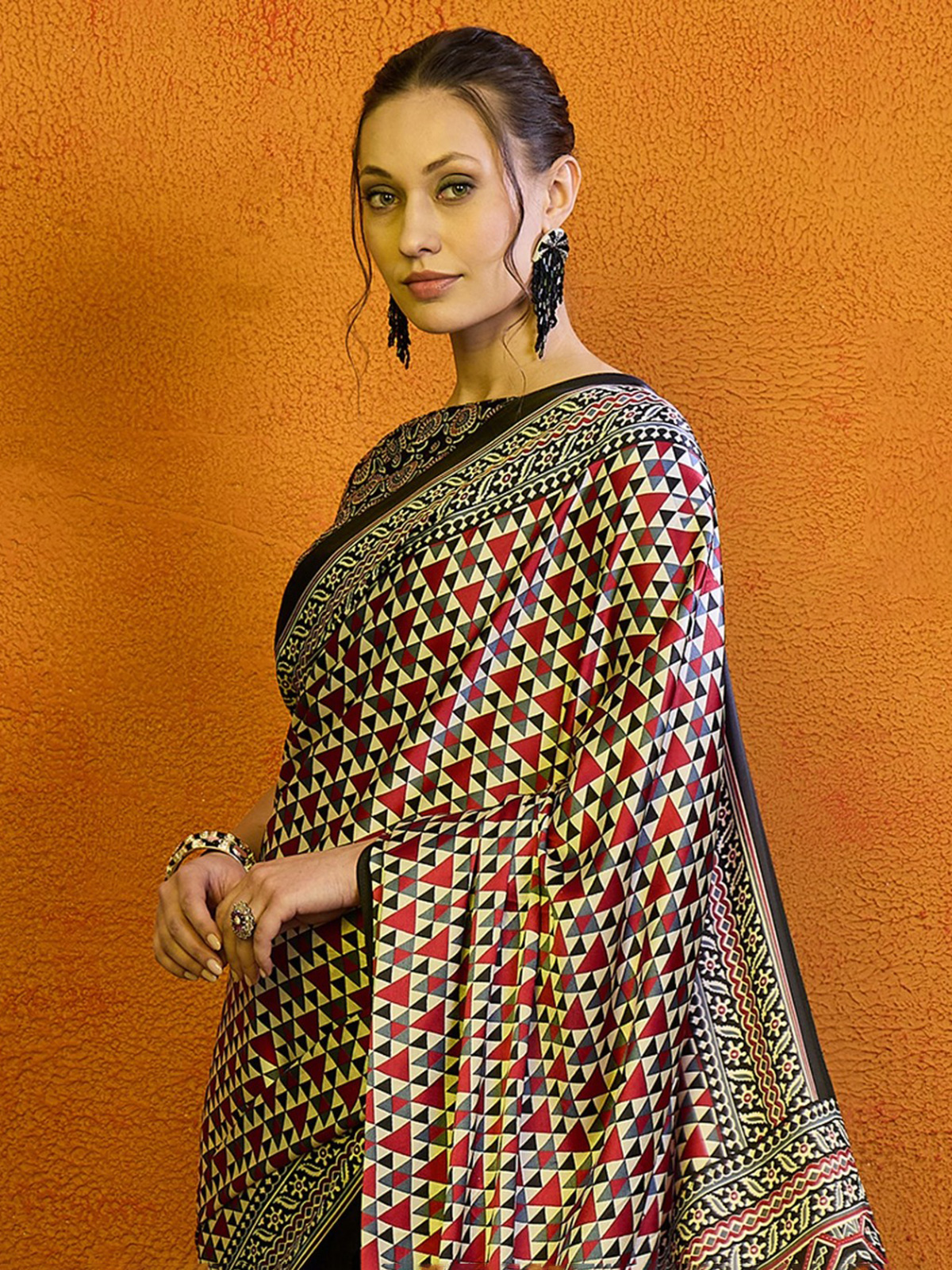 Drape yourself in elegance with this rich red bhagalpuri silk saree. Featuring an attractive print pattern, it offers a perfect mix of tradition and trend. Comes with an unstitched blouse piece.