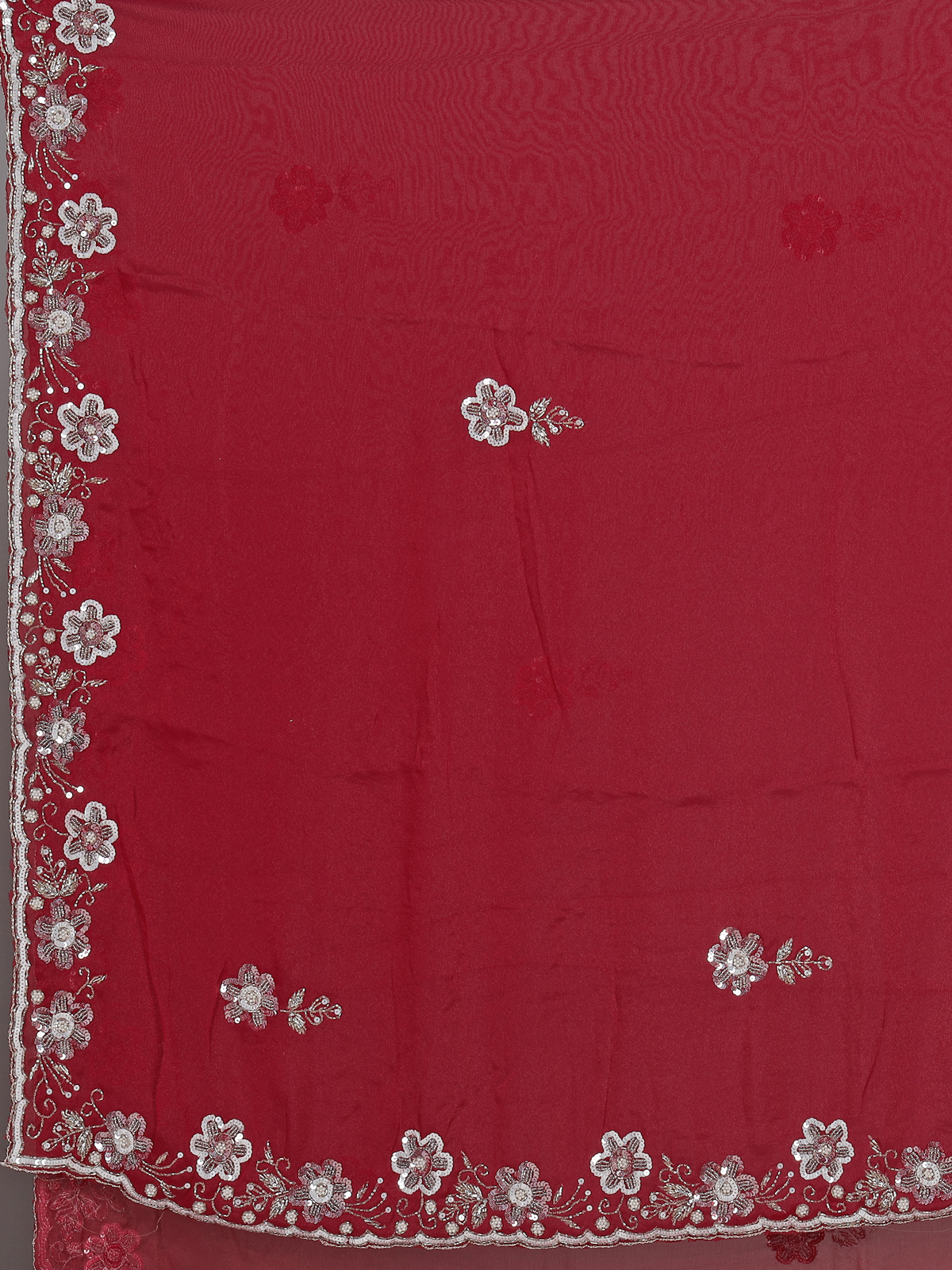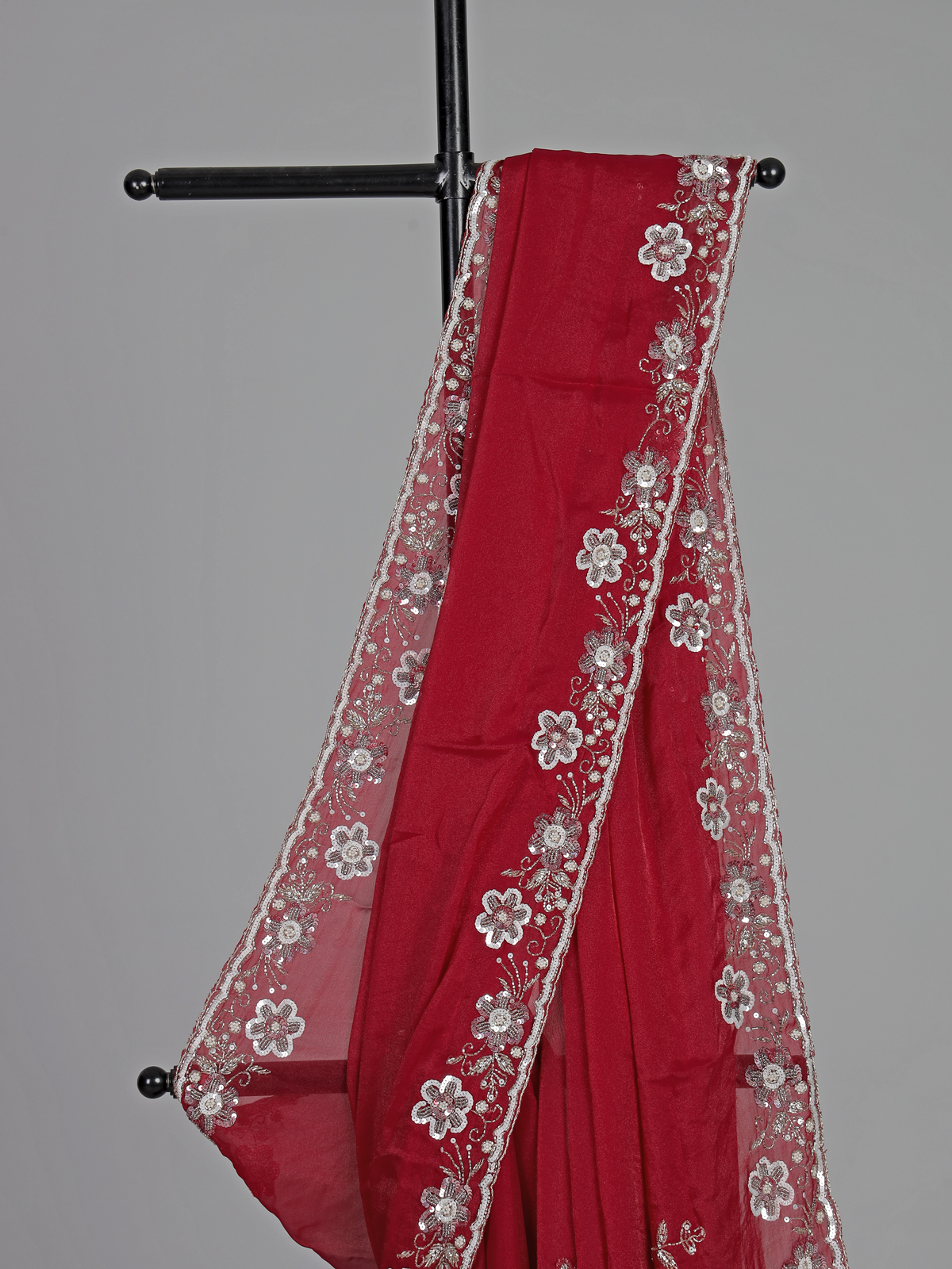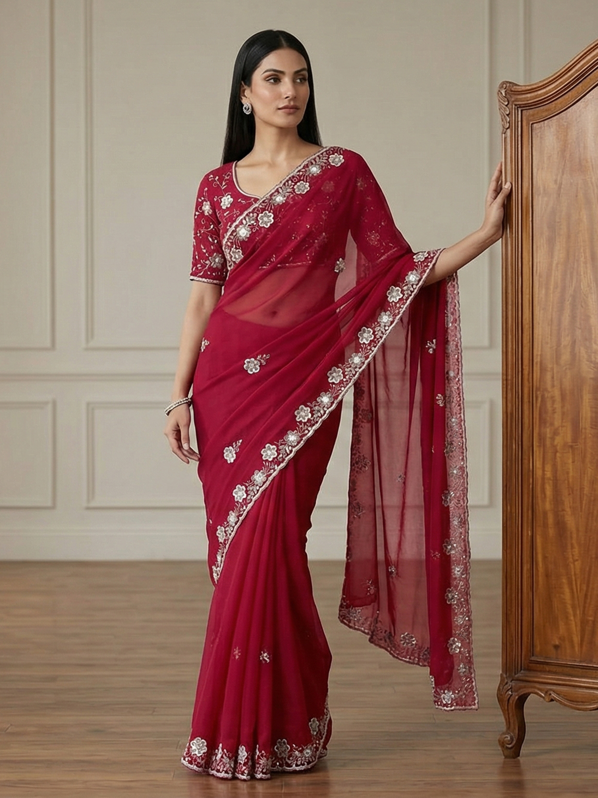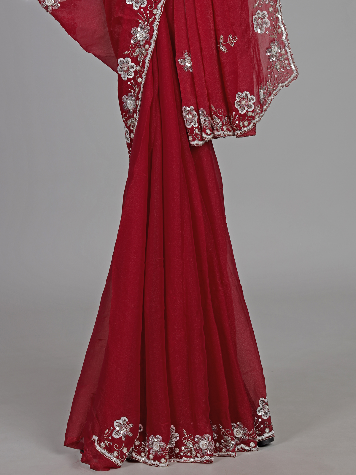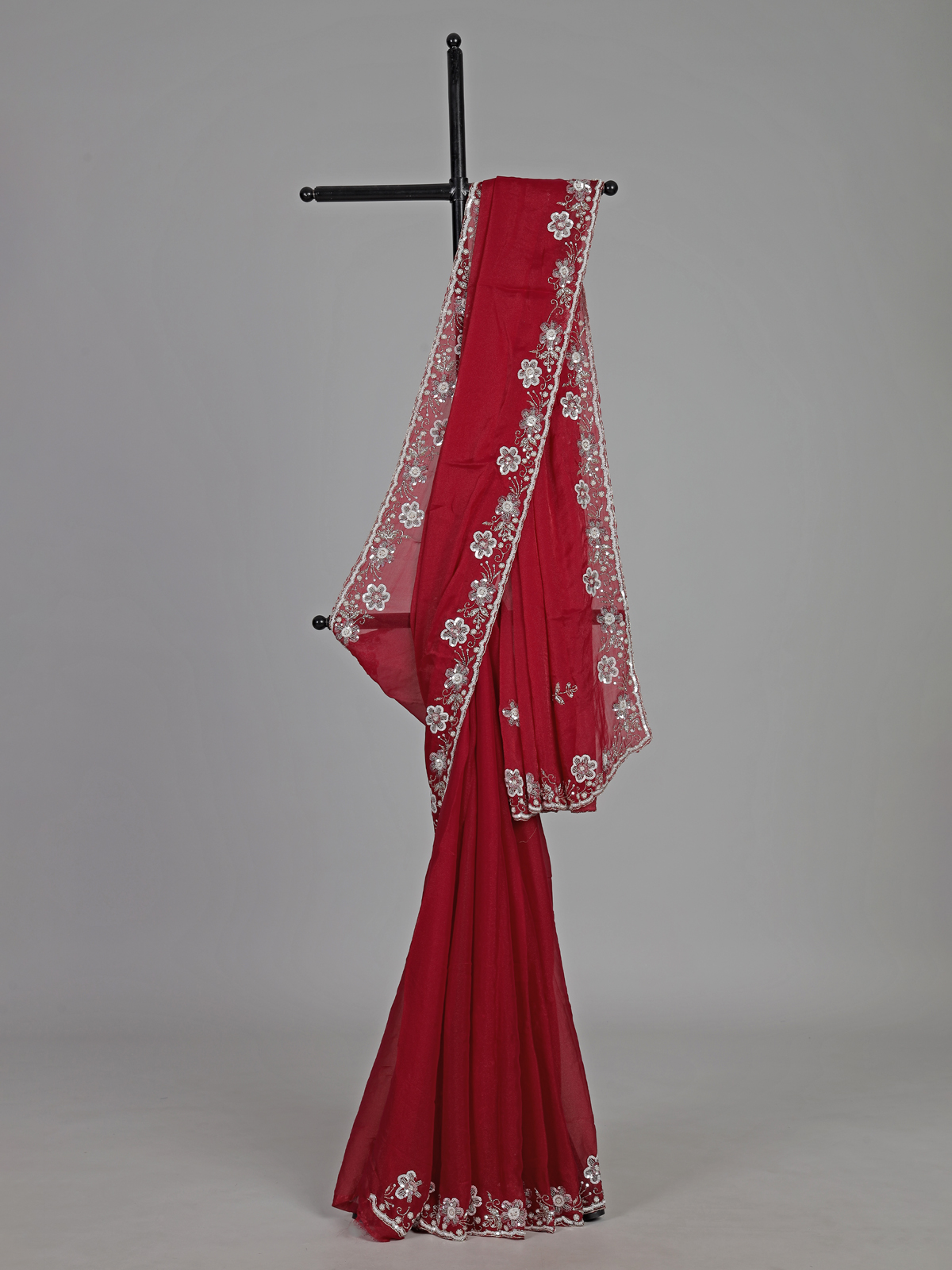 Red Chiffon Pearl Embellished Festive Designer Saree