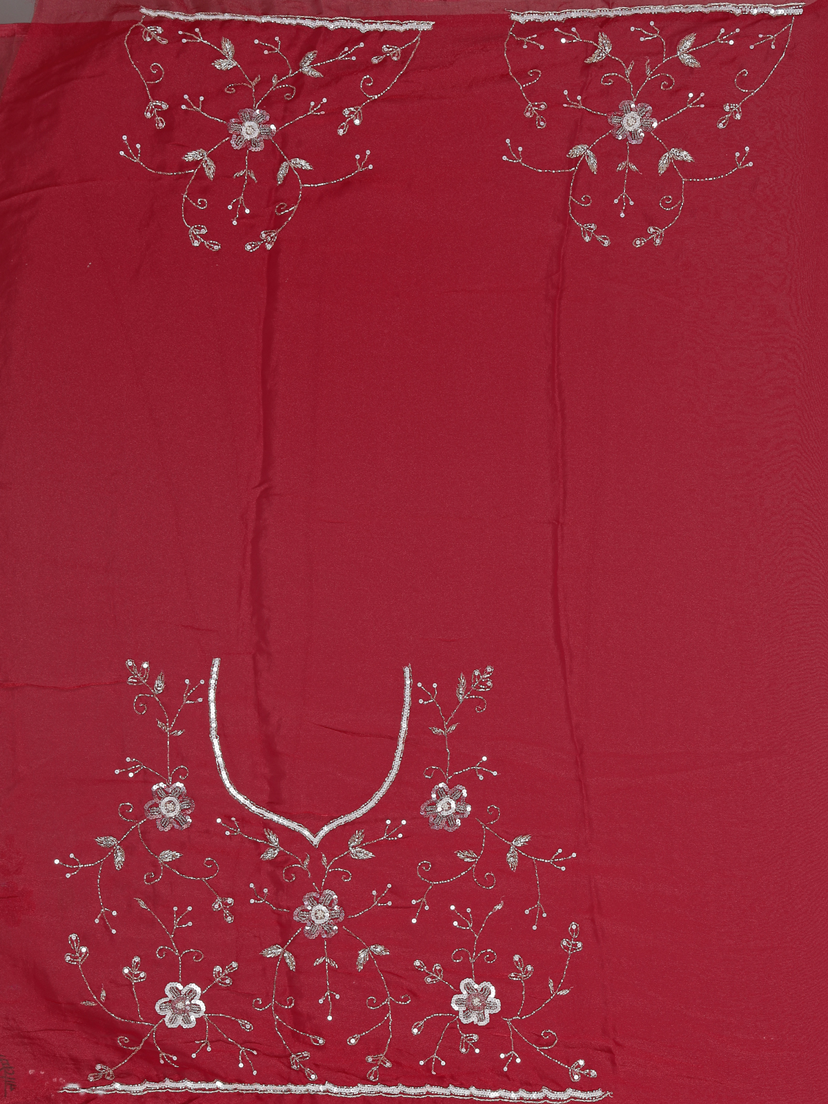 Bold red define this chiffon saree designed for striking festive elegance. Adorned with cutdana, sequins and pearl embellishments. It radiates rich brilliance. The lightweight drape flows gracefully, enhancing its charm. Perfect for weddings, receptions and parties. It includes an unstitched blouse piece for a complete and refined ethnic look.