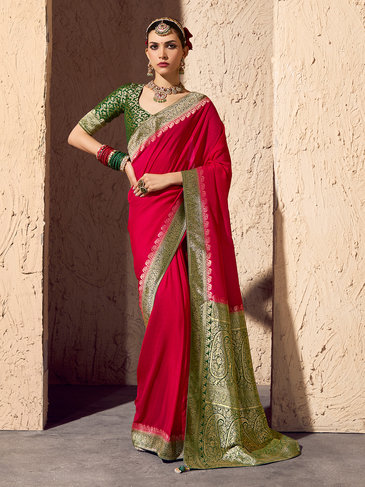 Designed in bold red crepe georgette saree is highlighted with traditional zari work for a striking ethnic look. Paired with a contrast unstitched blouse piece, it is perfect for weddings, festive wear and grand reception occasions.