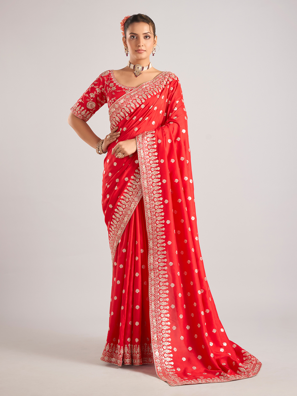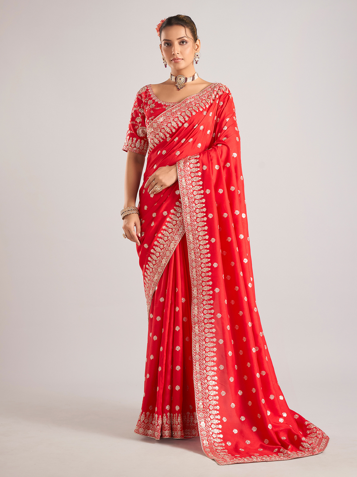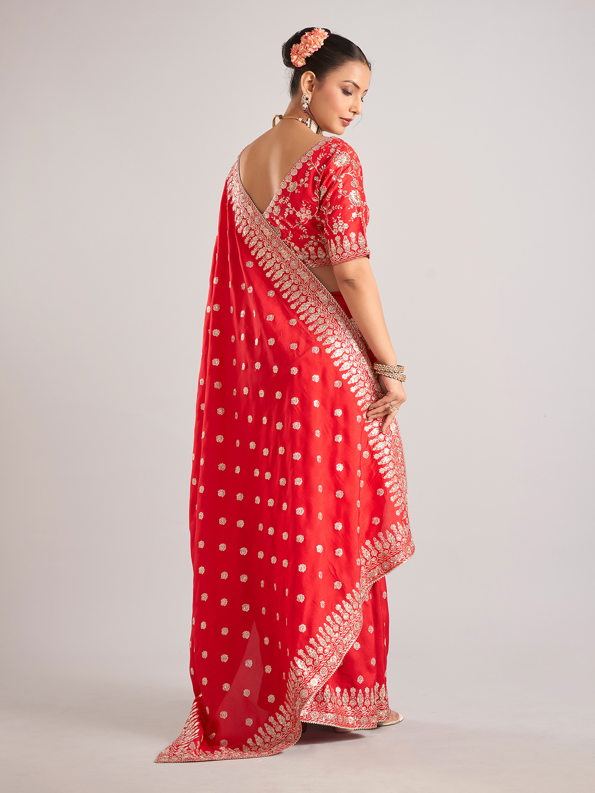 Make a statement in this red pure dola silk saree with detailed work in beads, resham, sequins, and zardosi. Complete with a ready-made blouse, it's perfect for festive celebrations and weddings.