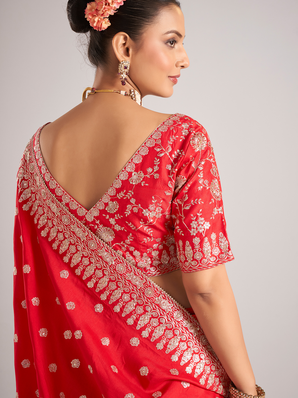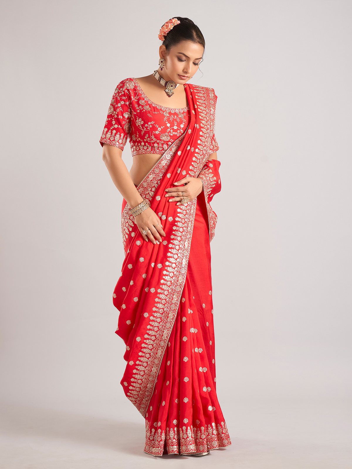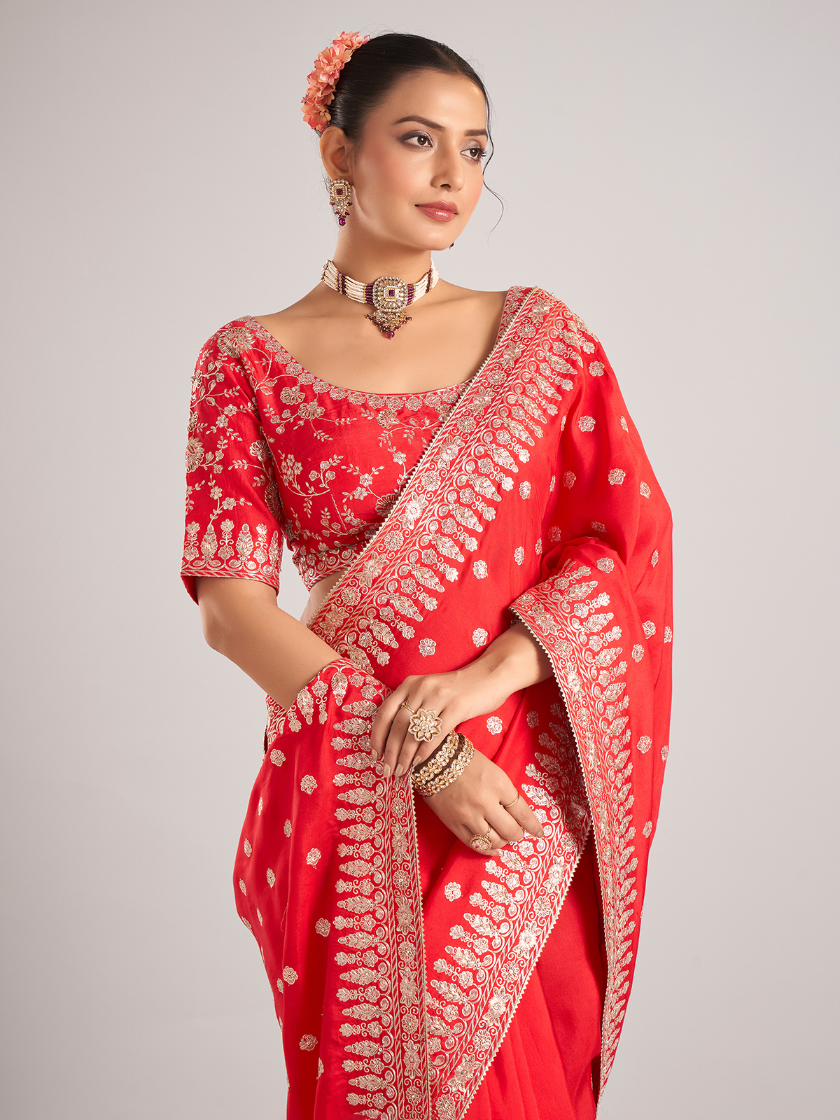 Make a statement in this red pure dola silk saree with detailed work in beads, resham, sequins, and zardosi. Complete with a ready-made blouse, it's perfect for festive celebrations and weddings.