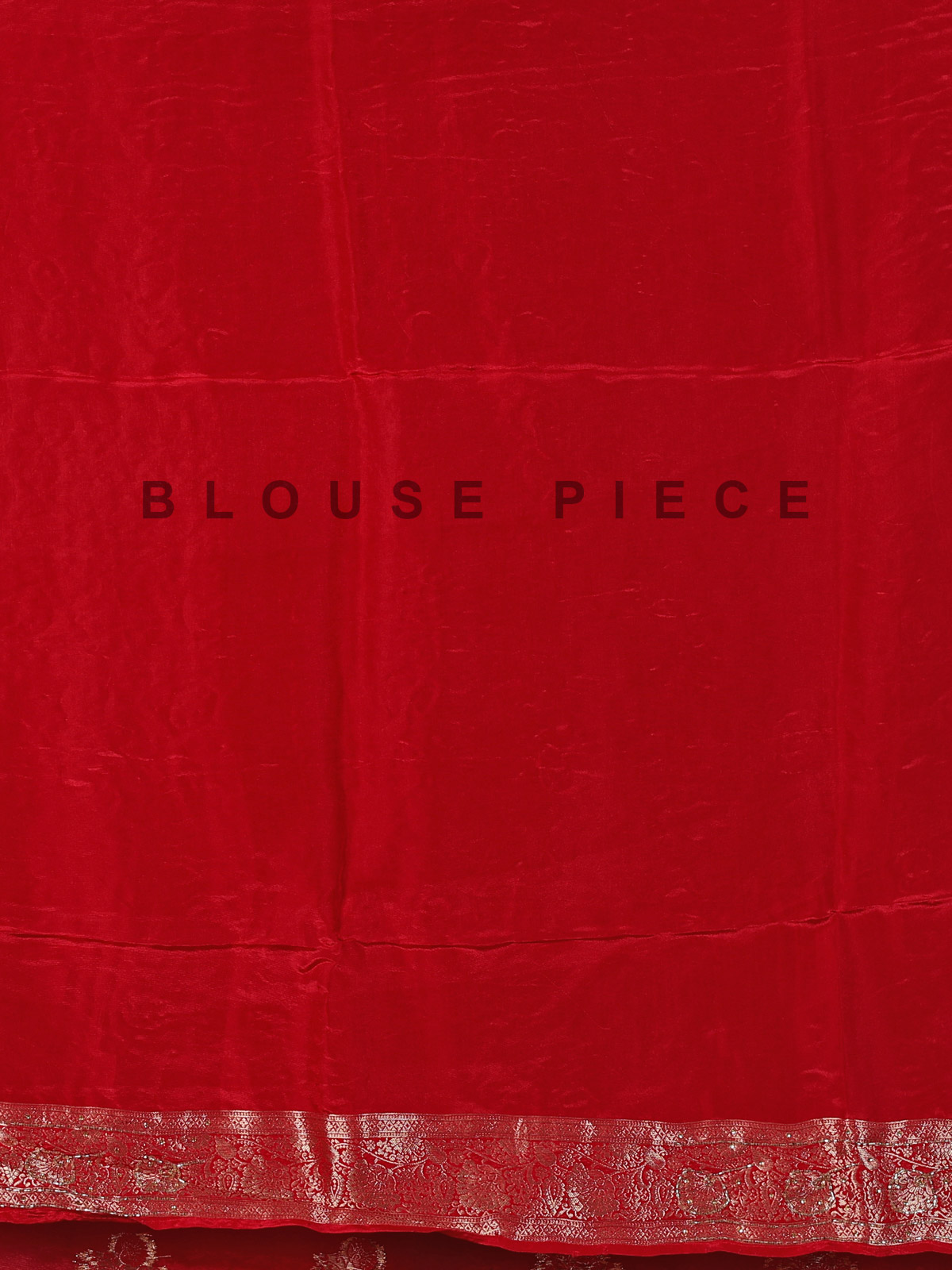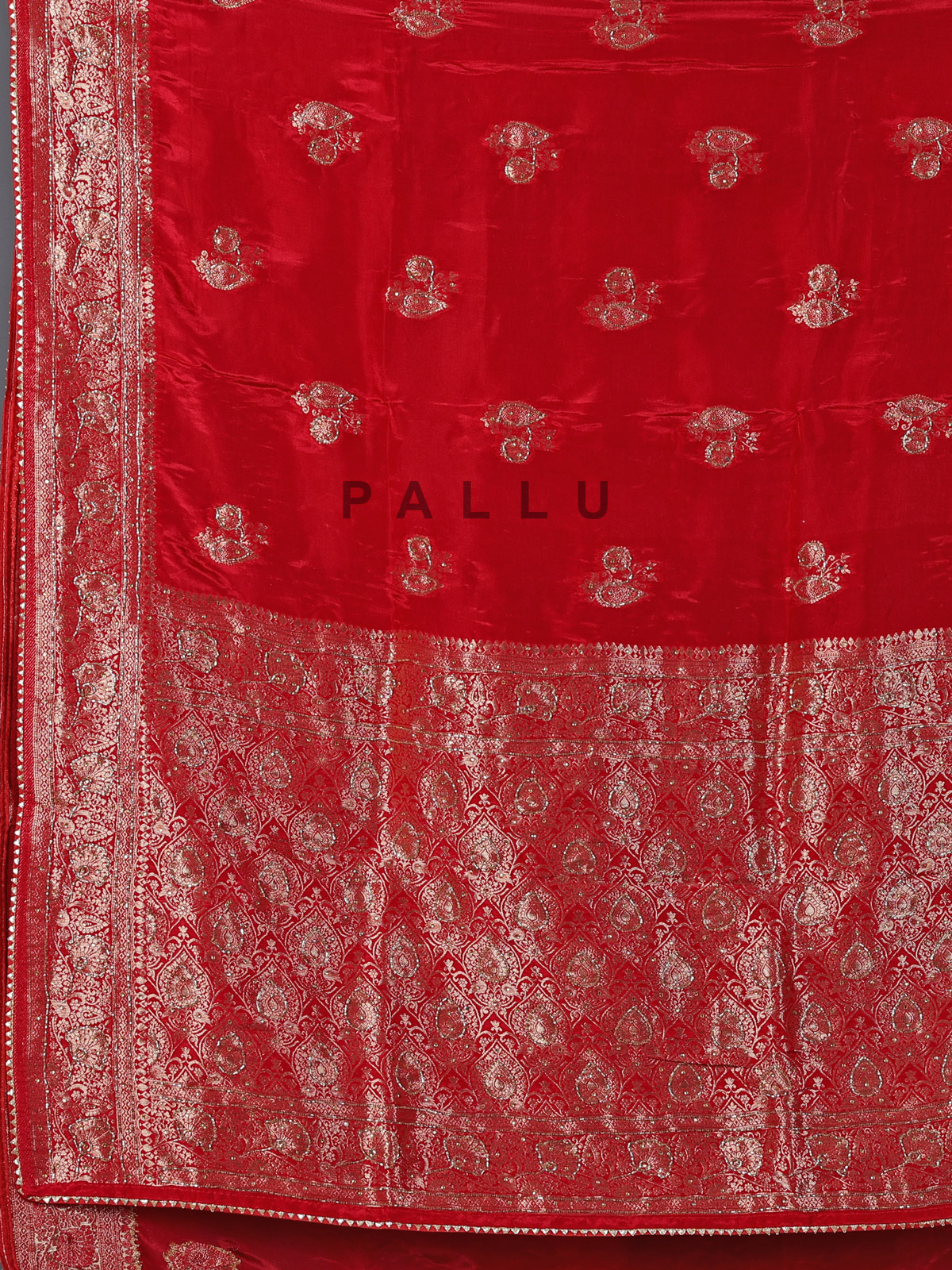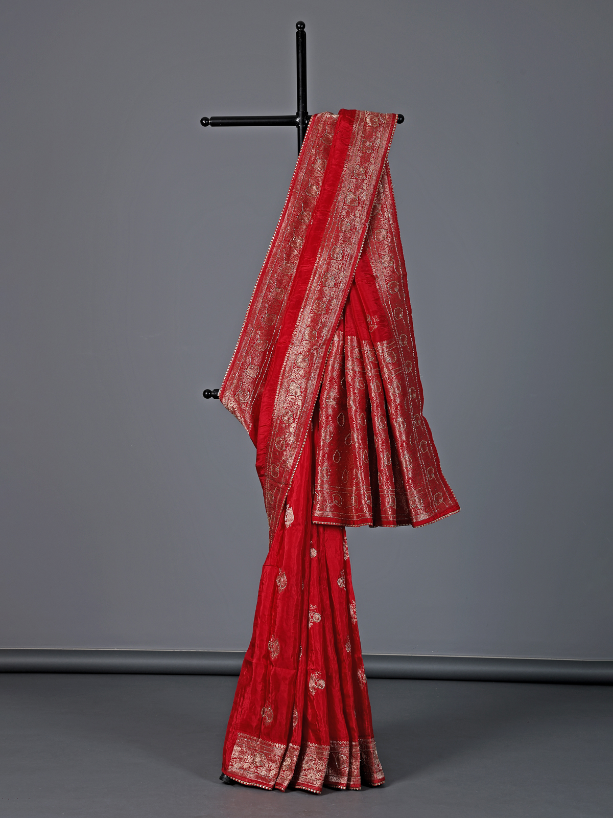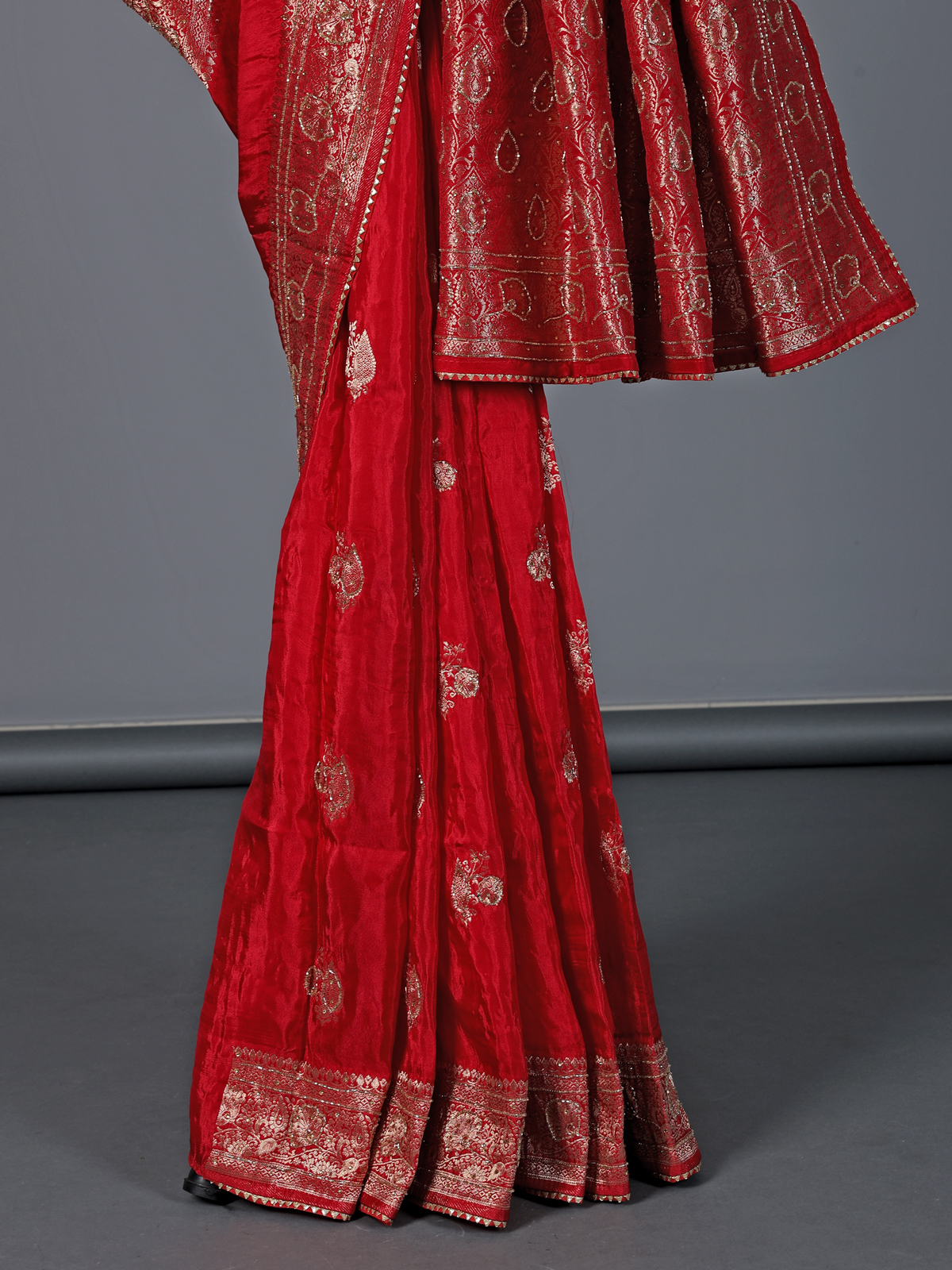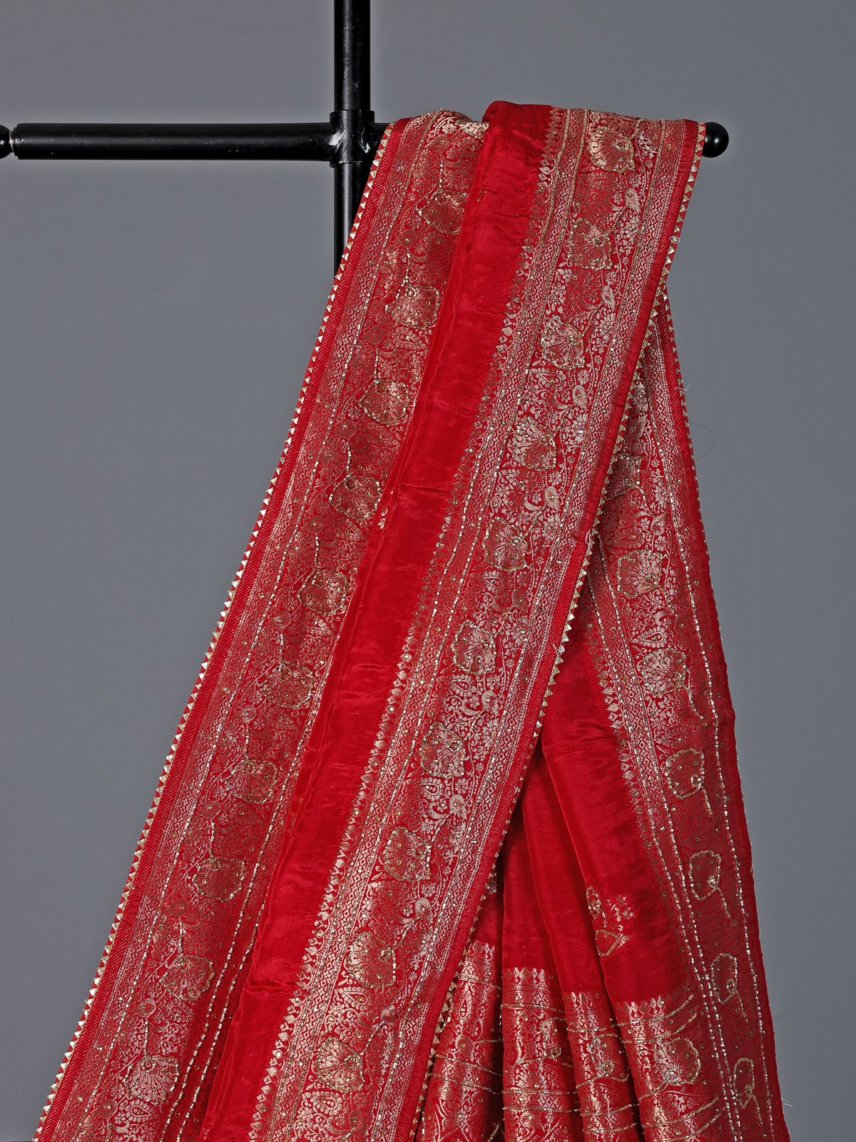 Radiant and elegant, this red dola silk saree is perfect for celebratory moments. Embellished with cutdana, stone, zari and gota work, it shines with festive brilliance. The luxurious fabric flows effortlessly, creating a flattering silhouette. Ideal for weddings and receptions, it comes with an unstitched blouse piece for versatile styling.