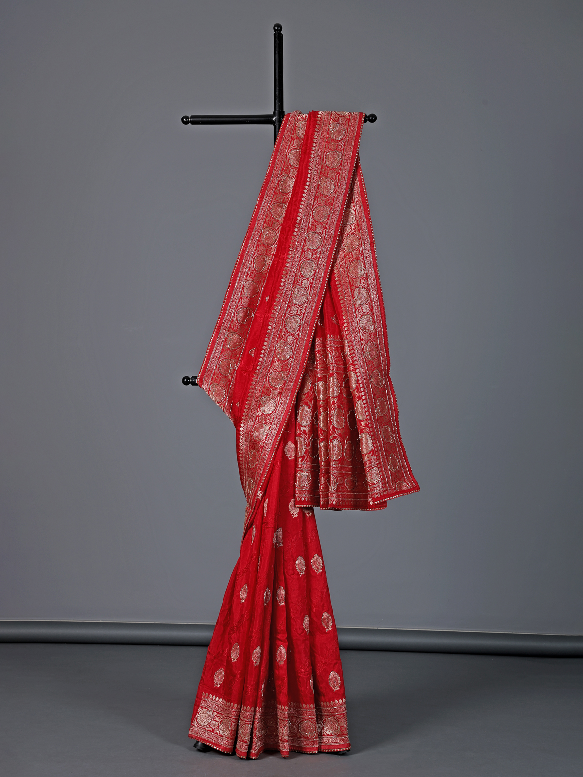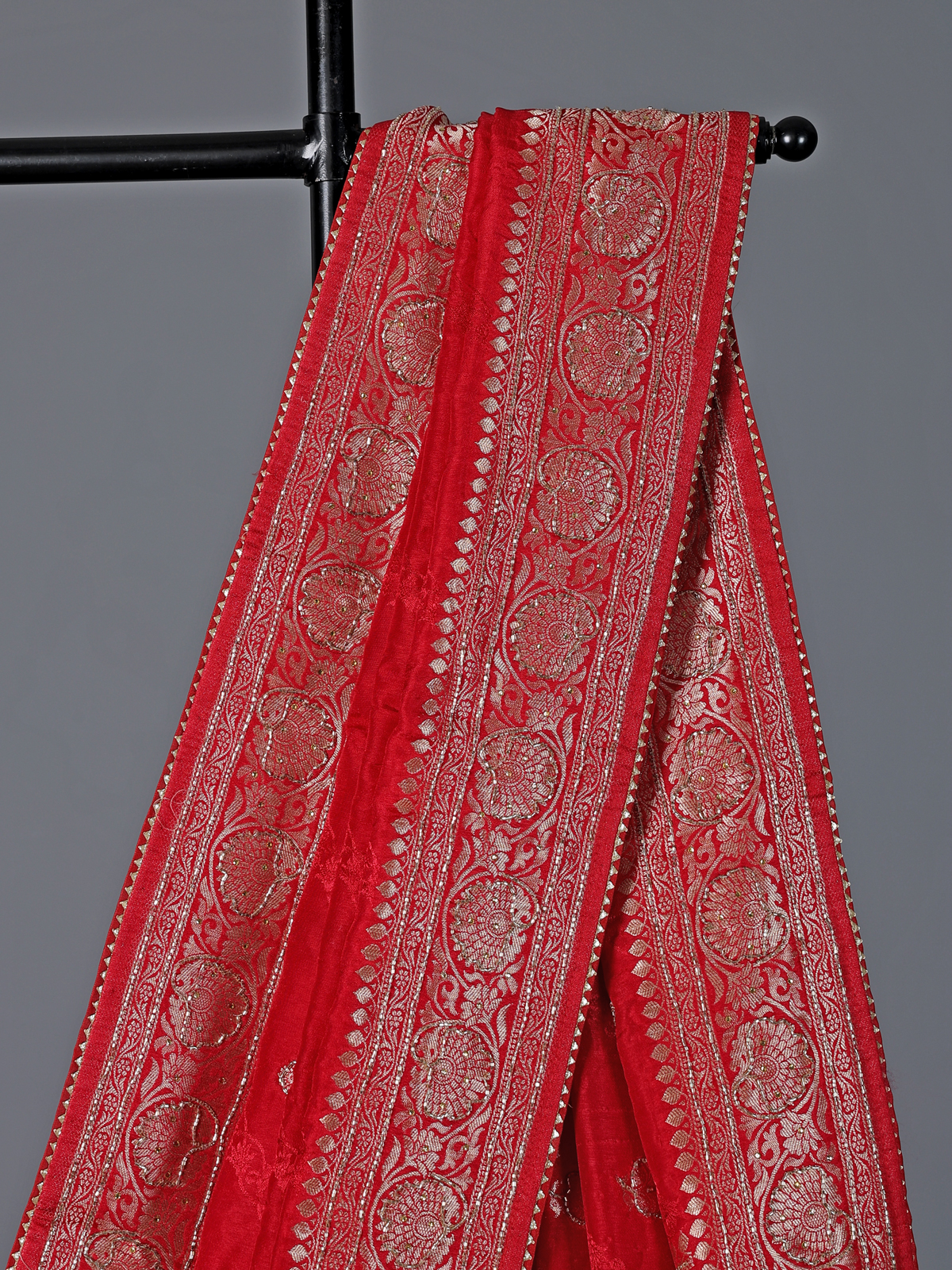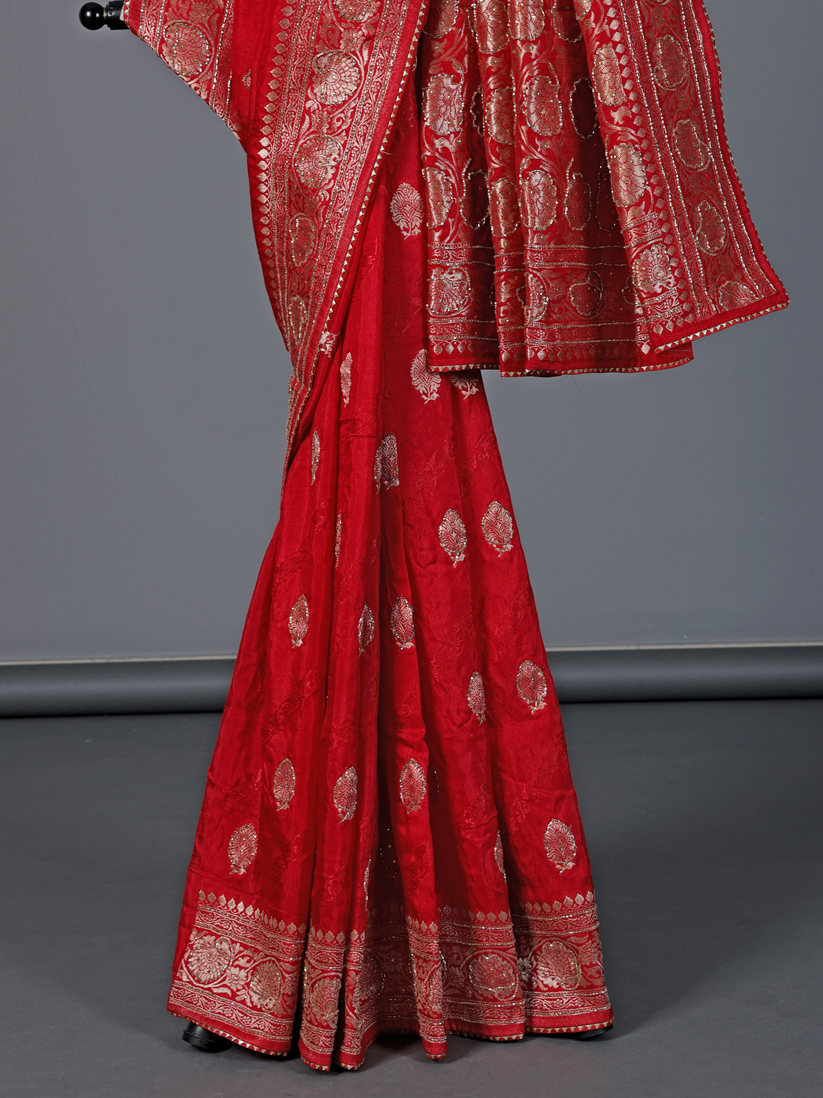 Refined and classic, this red dola silk saree embodies timeless festive beauty. Embellished with cutdana, stone, zari and gota work, it adds a radiant glow to your presence. The smooth fabric drapes effortlessly, enhancing elegance. Ideal for weddings and receptions, it comes with an unstitched blouse piece for personalized styling.
