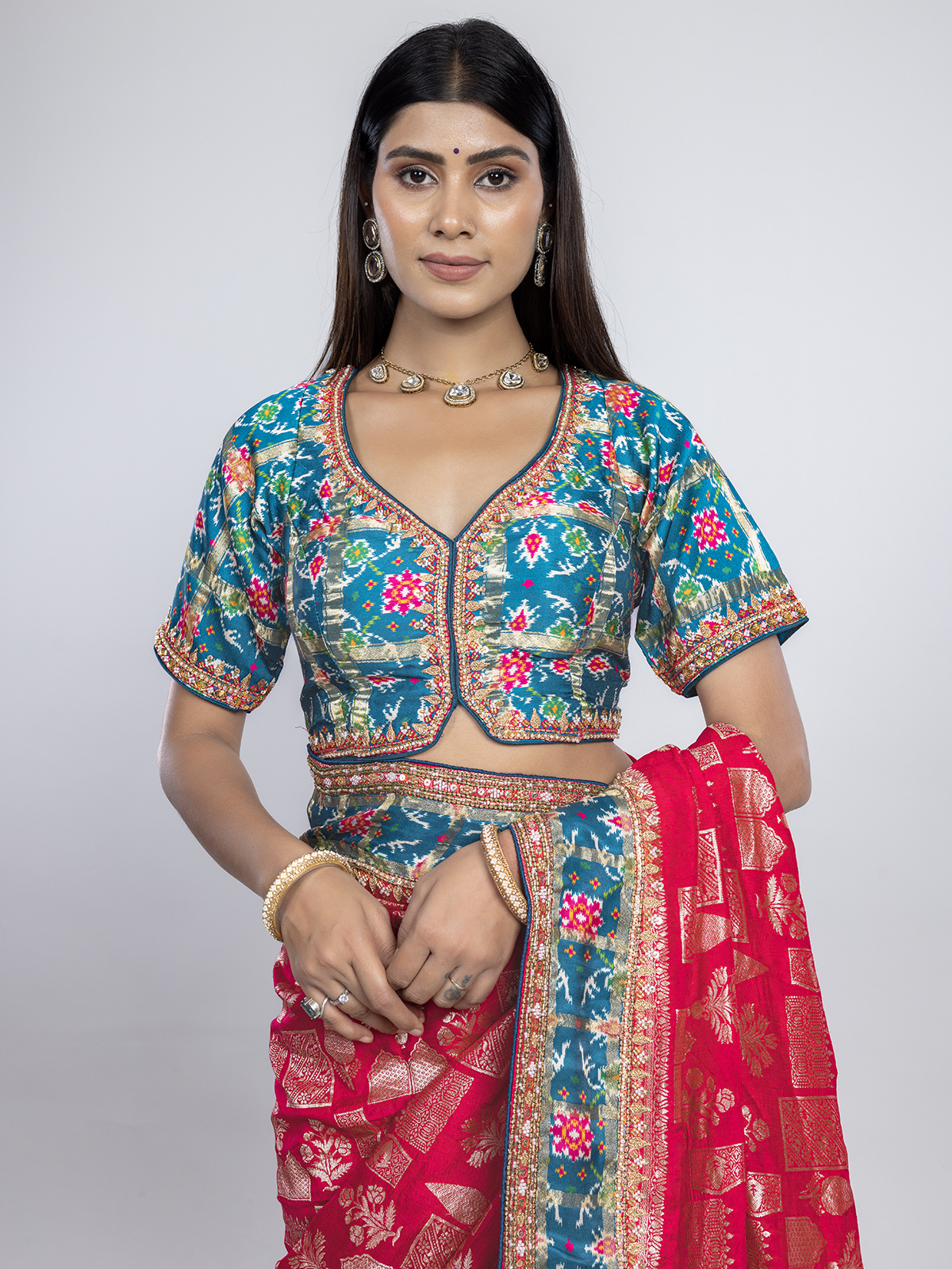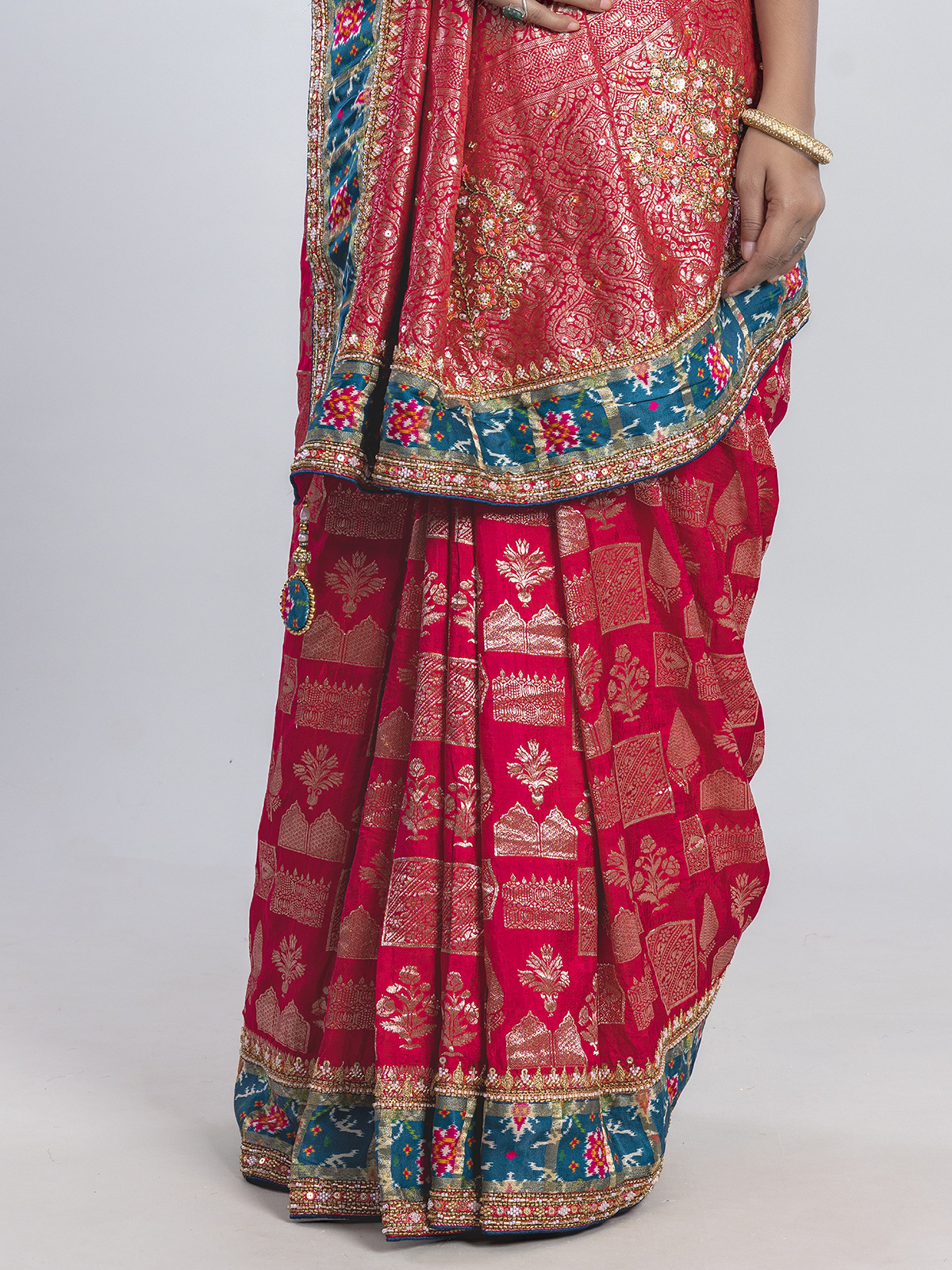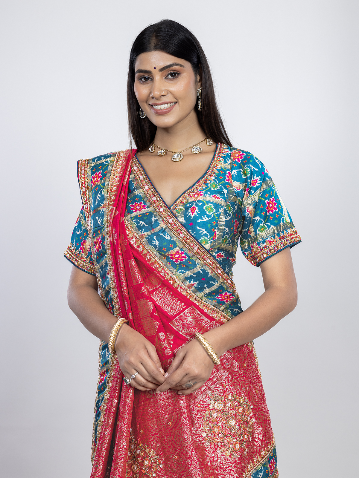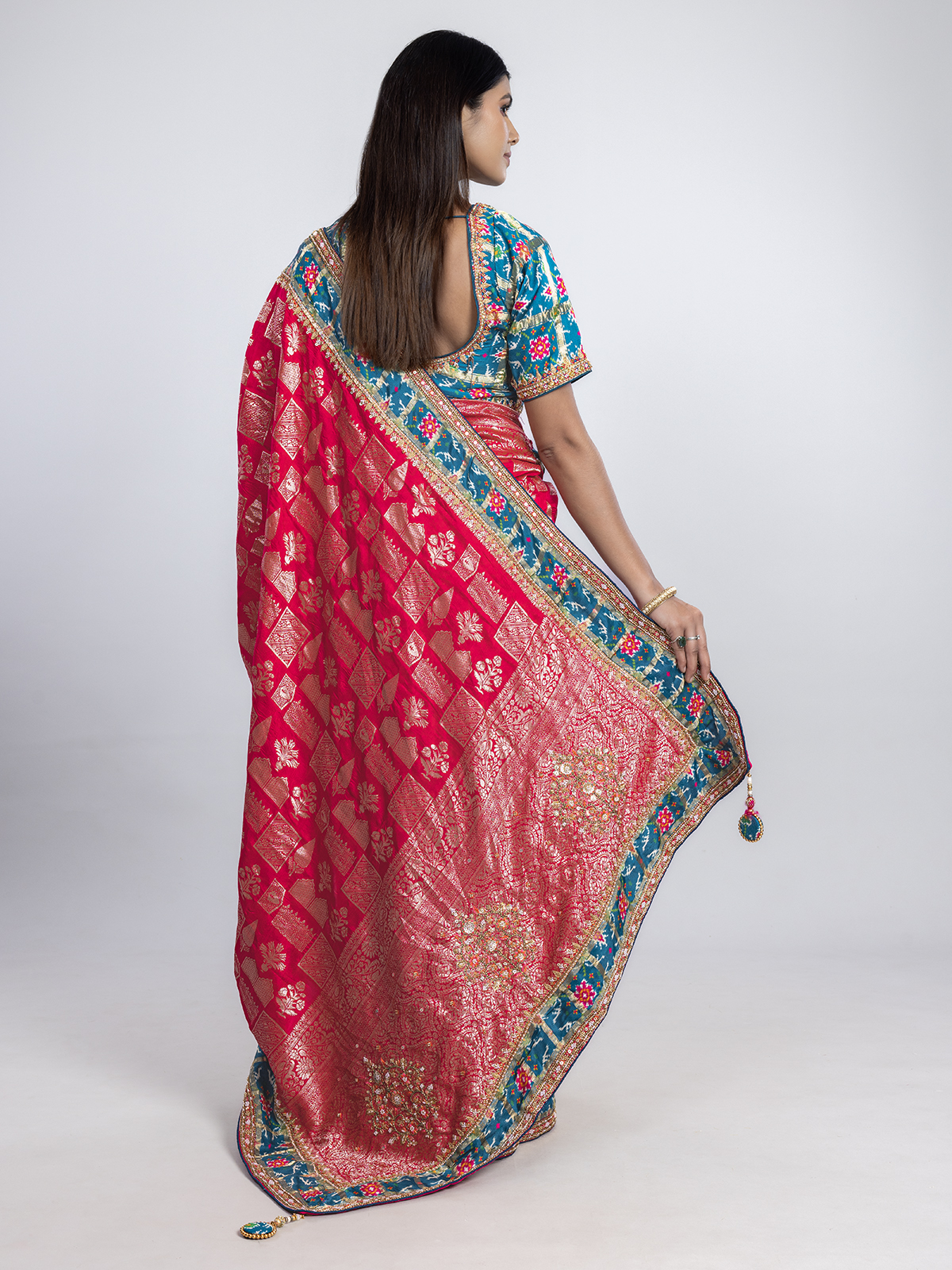 This fiery red dola silk saree dazzles with cutdana, beads, resham, and sequins, radiating festive brilliance. A blue patola border enriches its vibrance, while a contrasting blue readymade blouse adds royal depth. Perfect for weddings, it symbolizes celebration and artistry steeped in cultural magnificence.