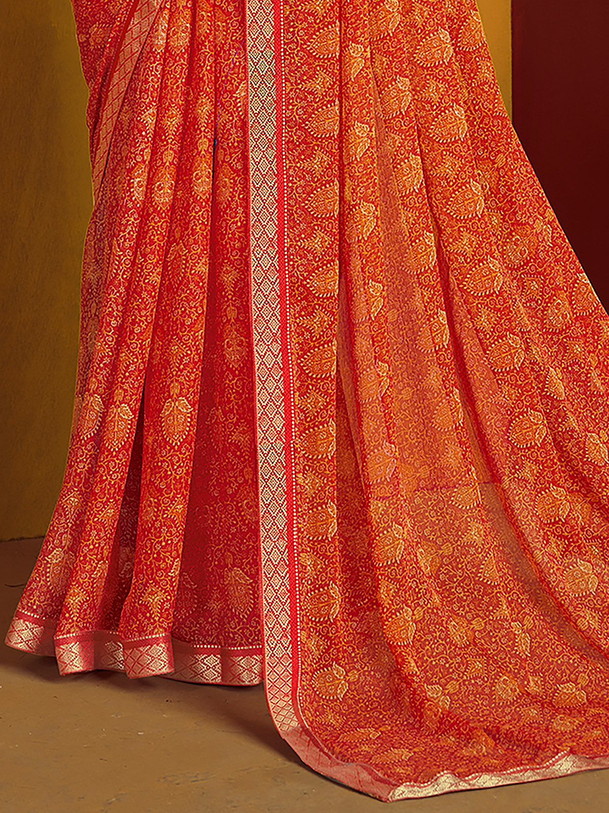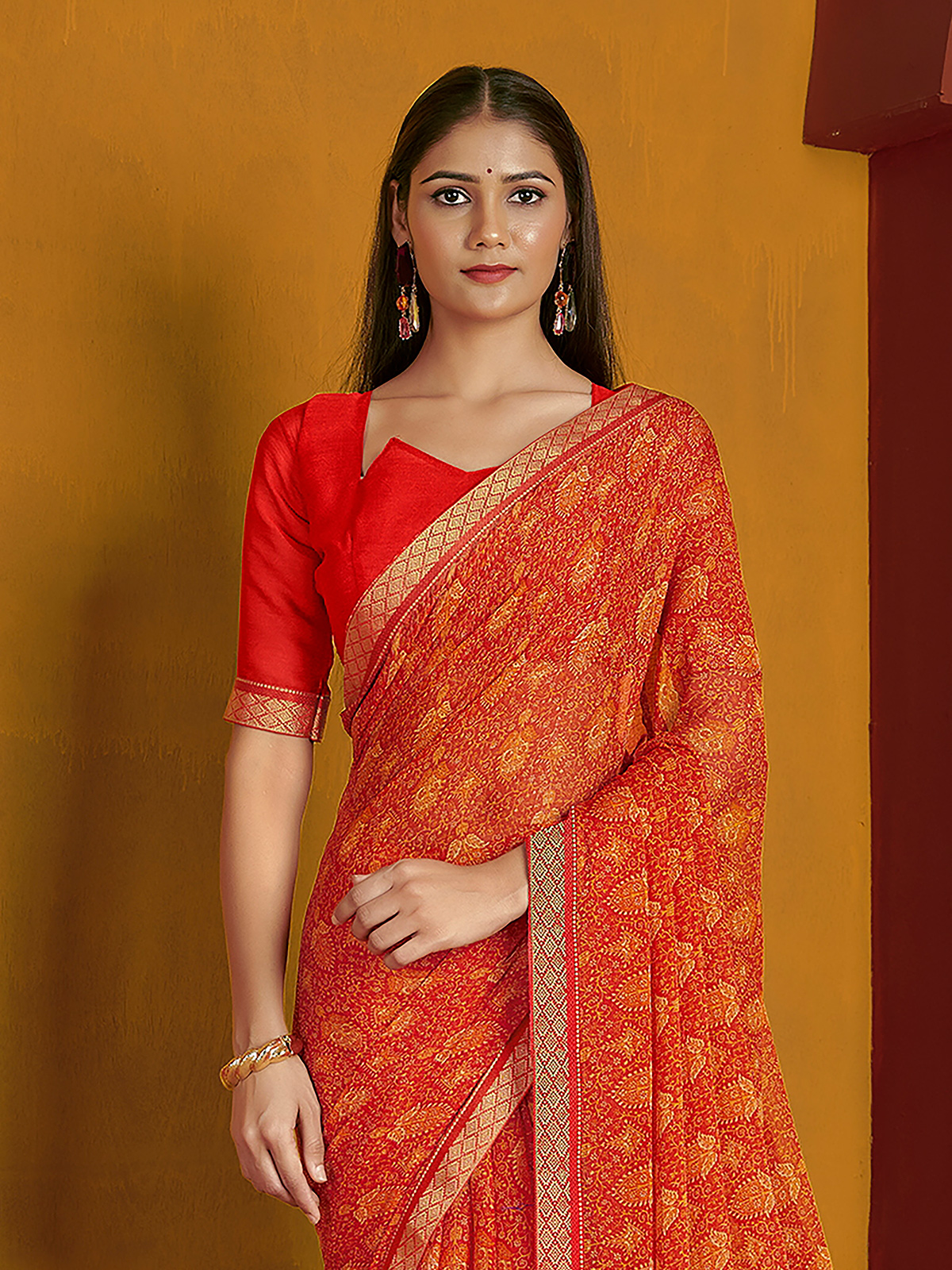 This classic red chiffon saree is adorned with beautiful printed motifs, finished with elegant lace detailing and a zari-work border for festive charm. The lightweight fabric offers fluid movement and comfort. Paired with an unstitched blouse piece, it makes a graceful choice for festive occasions, puja functions and casual wear.
