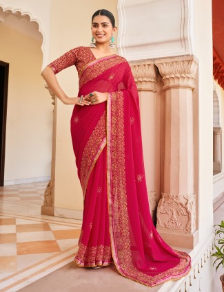 Must drap this red georgette saree in your next pary and festive celebration. It is got a beautifully printed border with lace detailing and comes with an unstitched blouse with same print pattern. Perfect for festivals or glam events.