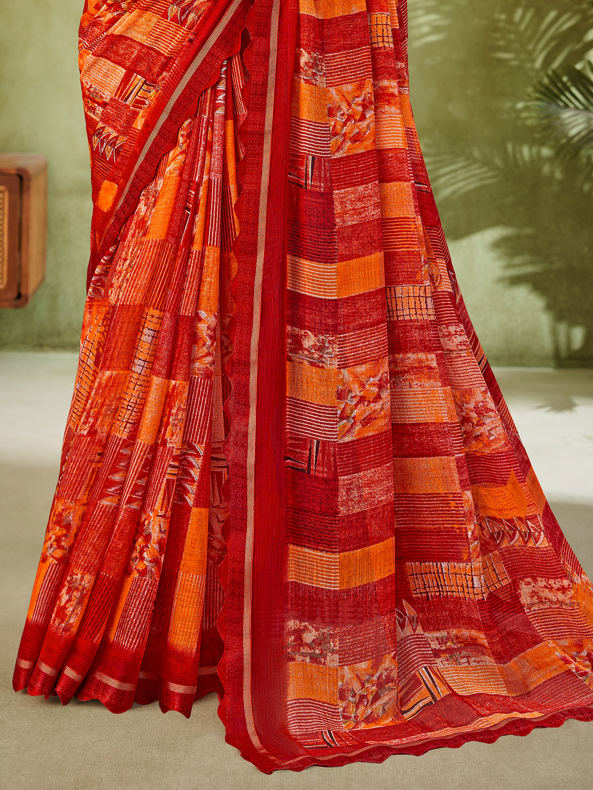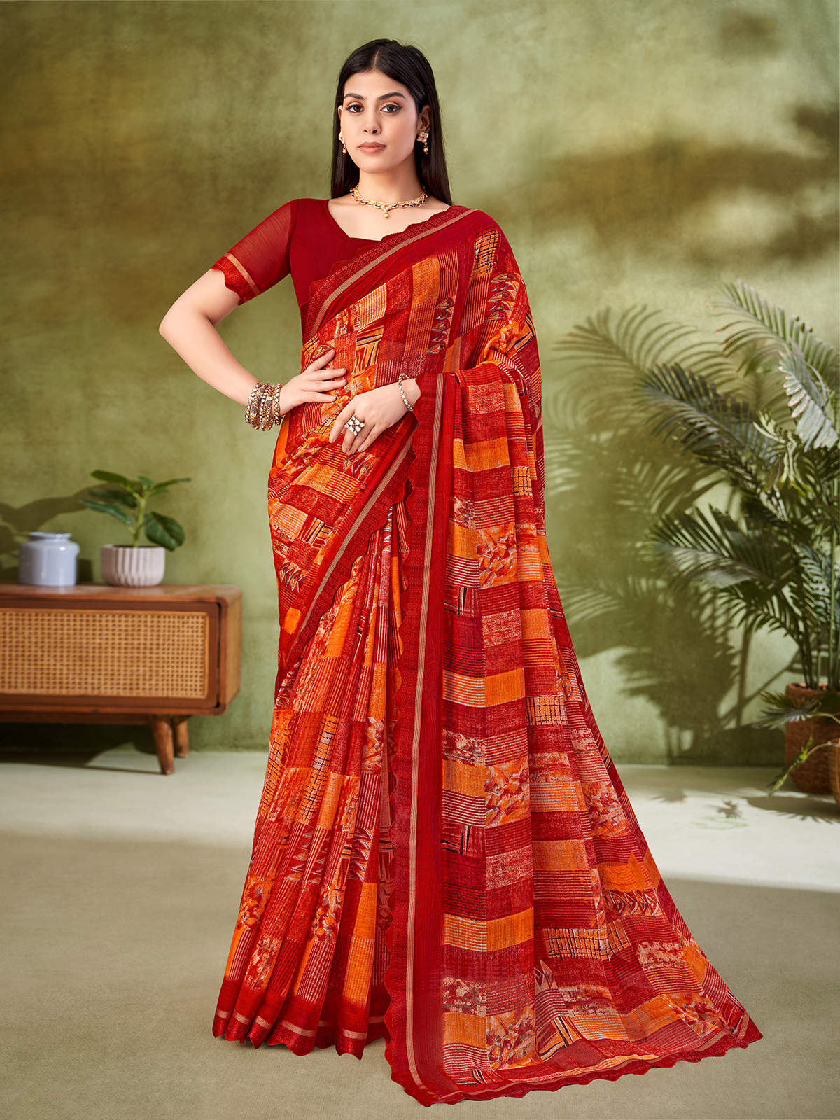 Styled in rich red tones, this georgette saree is adorned with eye-catching geometric prints and a simple lace border. Flowy and elegant, it comes with an unstitched blouse, making it ideal for casual wear, puja rituals, and festive occasions.