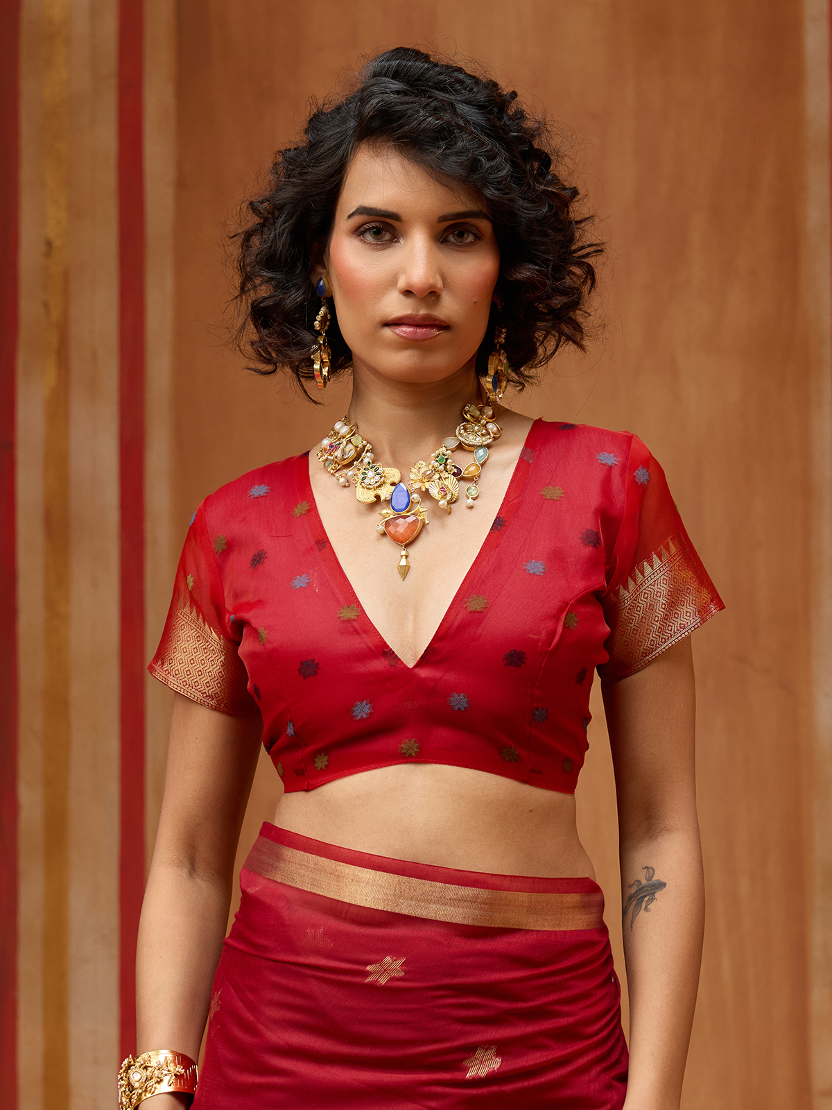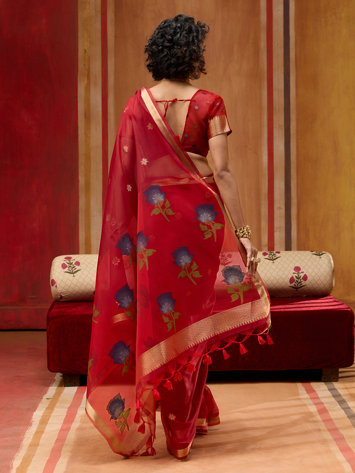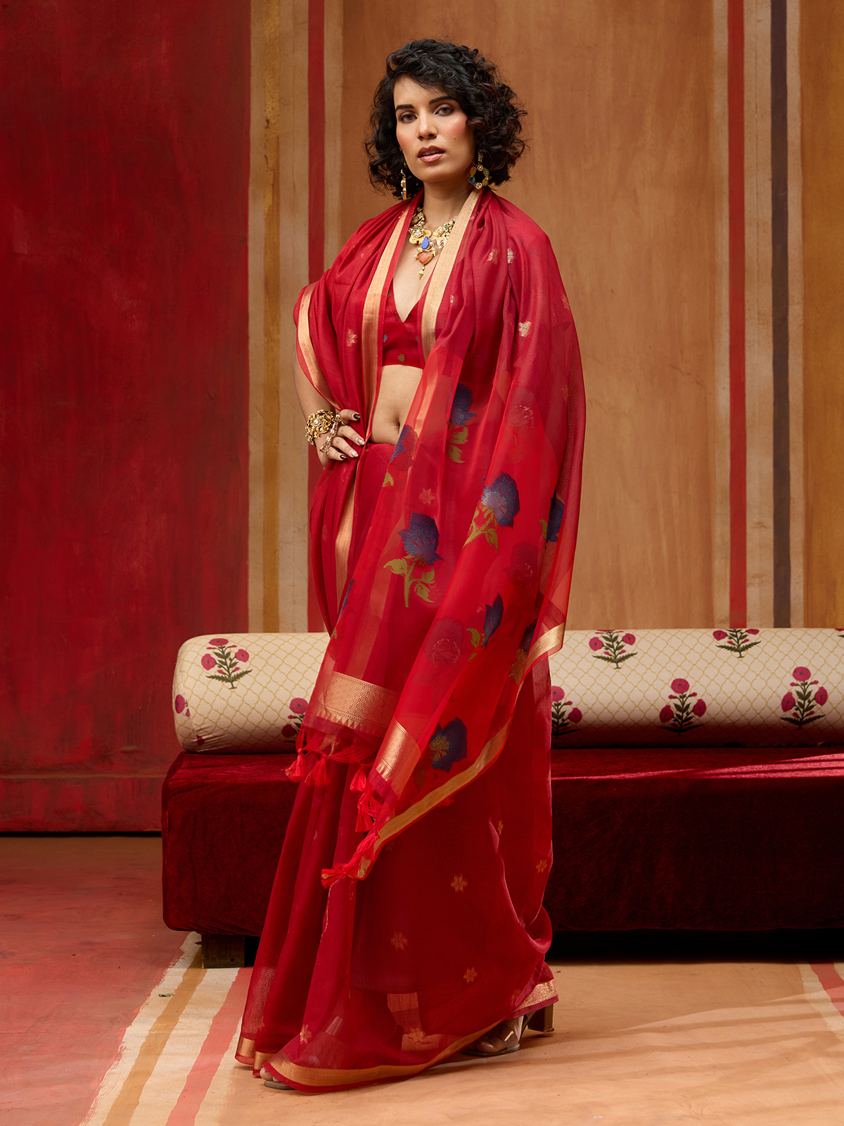 This red munga cotton organza saree features rich handloom zari weaving accented with beautiful coloured floral patterns across the drape. Lightweight and graceful, it creates an elegant festive look ideal for partywear and sangeet functions. The saree comes with a matching unstitched blouse for customized stitching and refined styling.