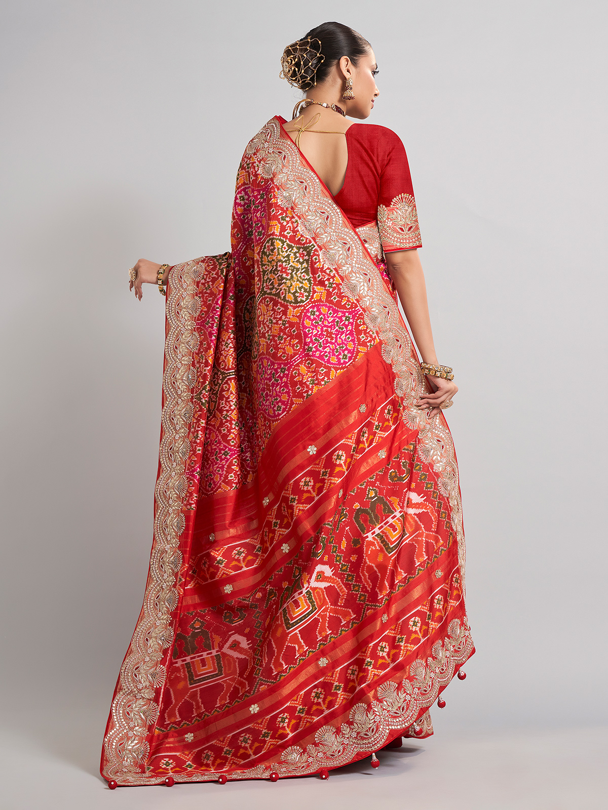 Rich in cultural elegance, this red Hyderabadi patola silk saree features meticulous zardosi, gota, pearls, and bead embellishments. An ideal choice for pujas and festive events, it includes an unstitched blouse piece.