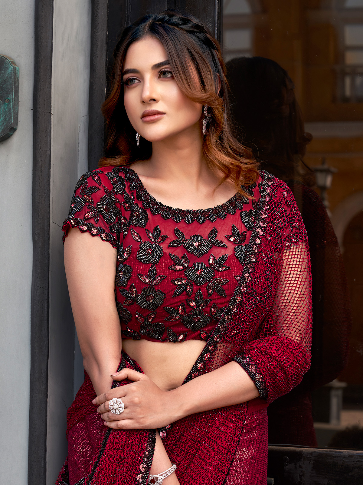 Bright in tone and rich in detail, this red soft net saree is highlighted with delicate cutdana, beads and light sequin accents. Its airy drape and gentle sparkle make it a graceful pick for weddings, parties, or festive wear. Comes with a stitched blouse for quick, ready to wear ease.