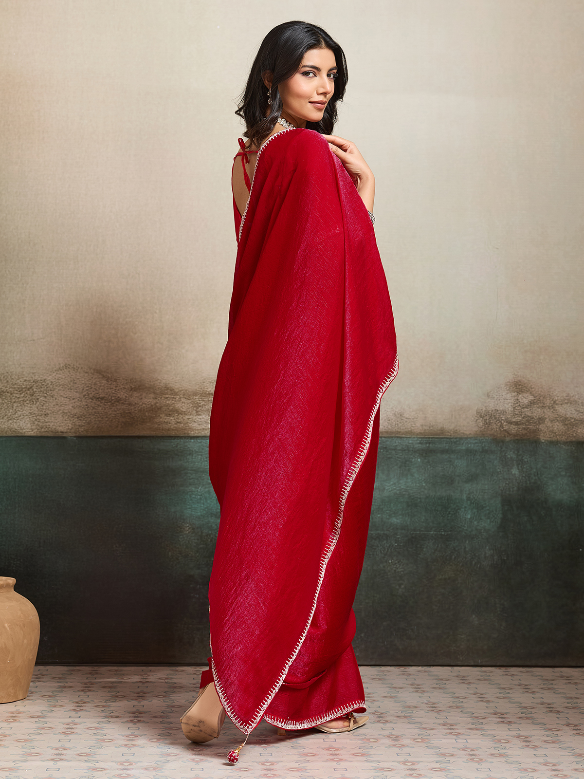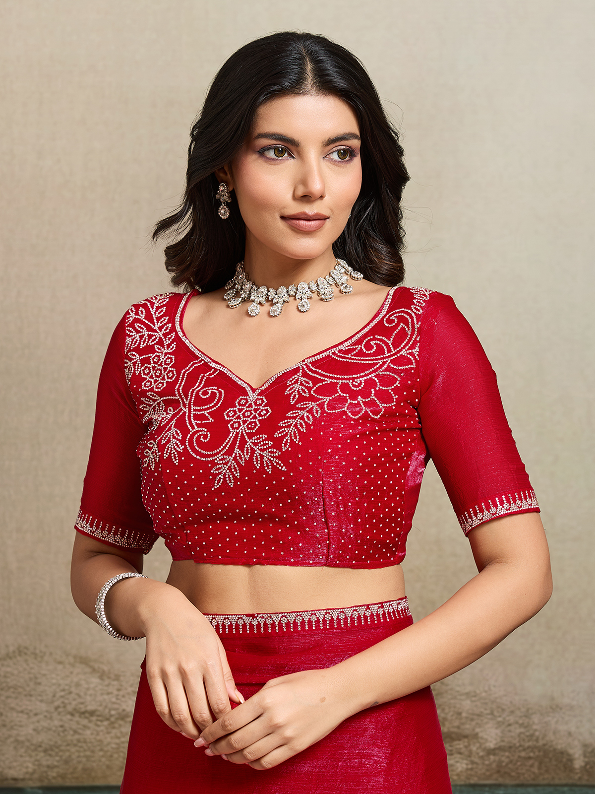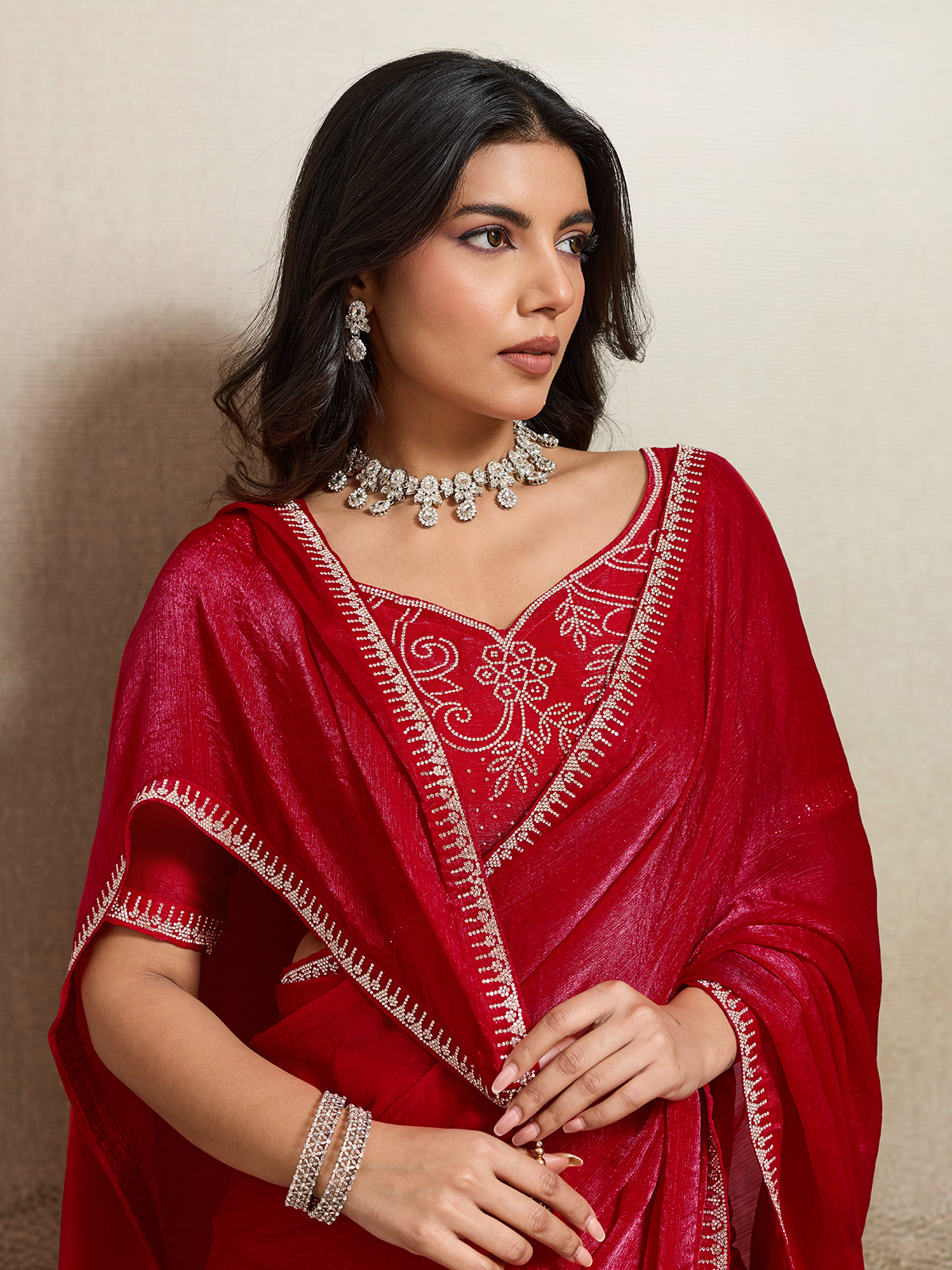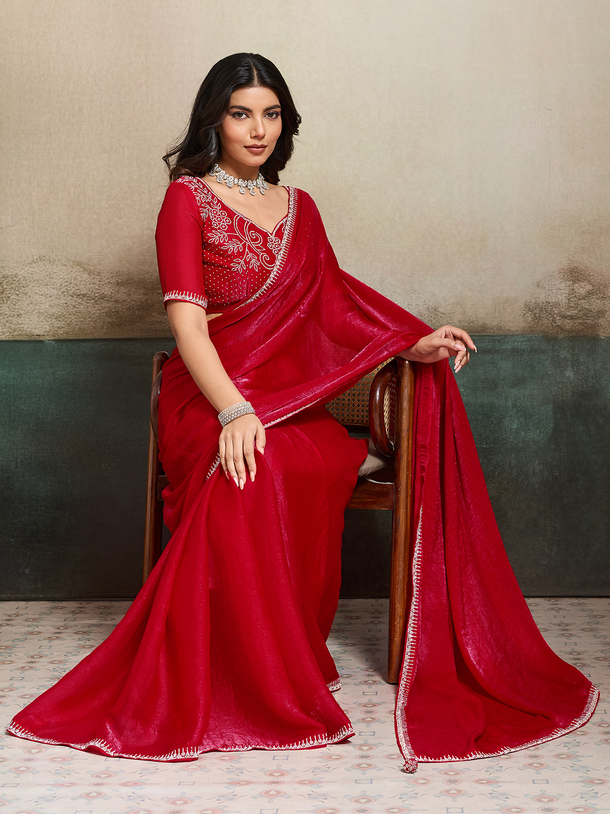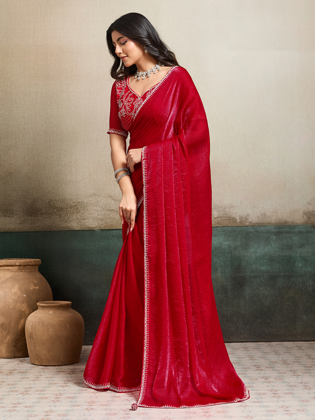 Make a bold festive statement in this red Fandy chiffon saree, known for its vibrant charm and fluid silhouette. Adorned with elegant stone embellishments across the border and blouse, it glows with celebratory brilliance. Perfect for festivals, parties, and weddings, it comes with a beautifully matched unstitched blouse piece.