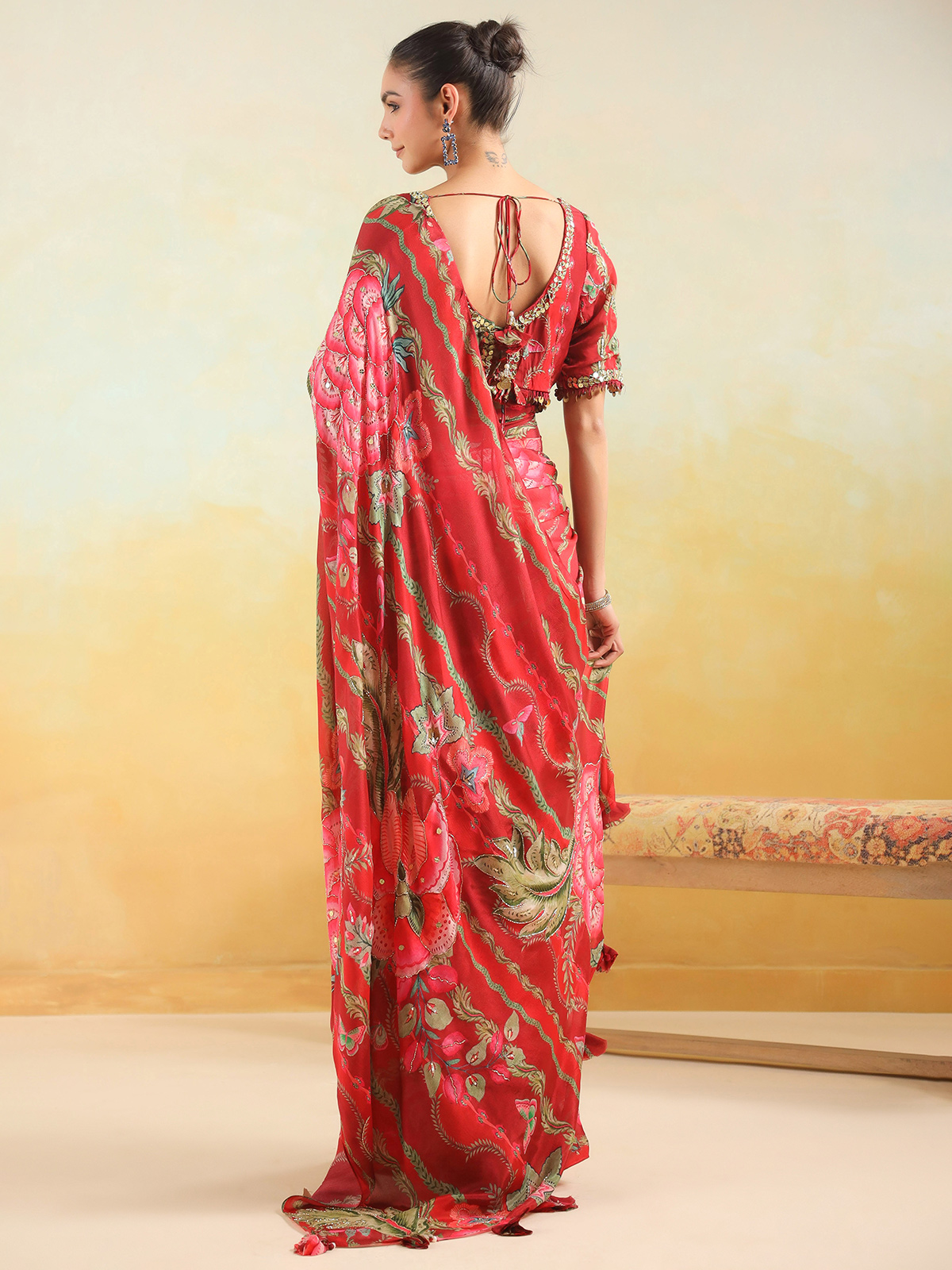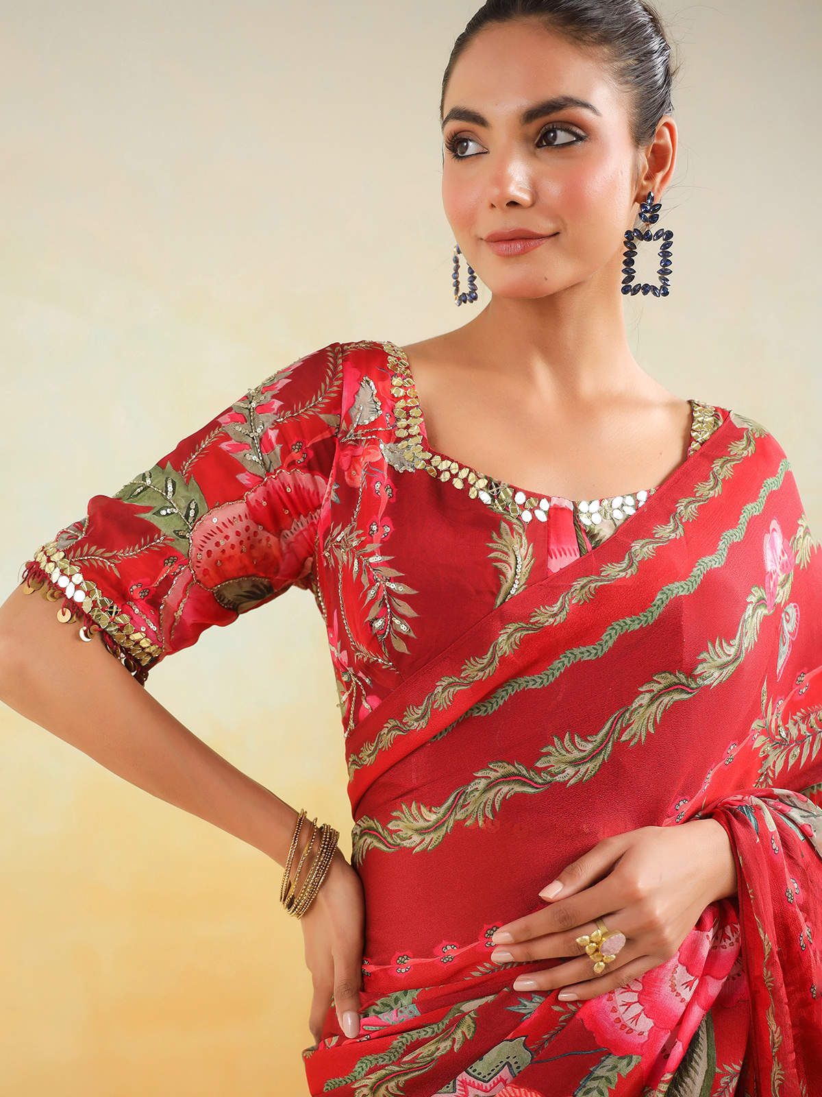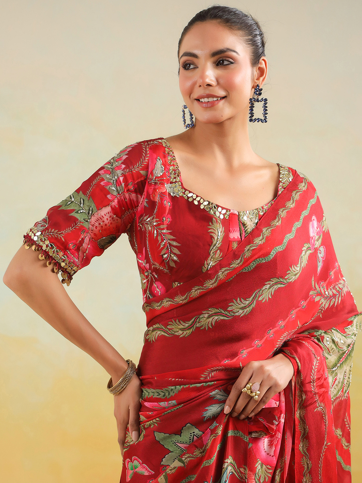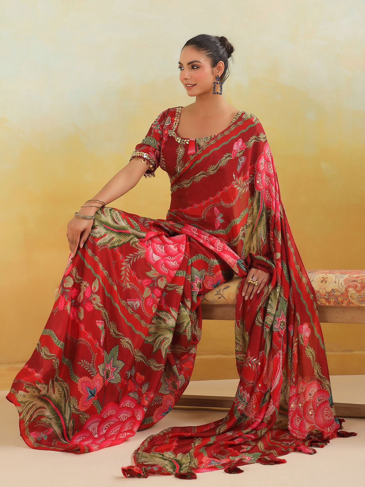 This eye-catching red saree, made from satin silk, features beautiful mirror, cutdana, sequins, and coin embellishments. An ideal choice for festive events, and it includes a ready-made blouse.