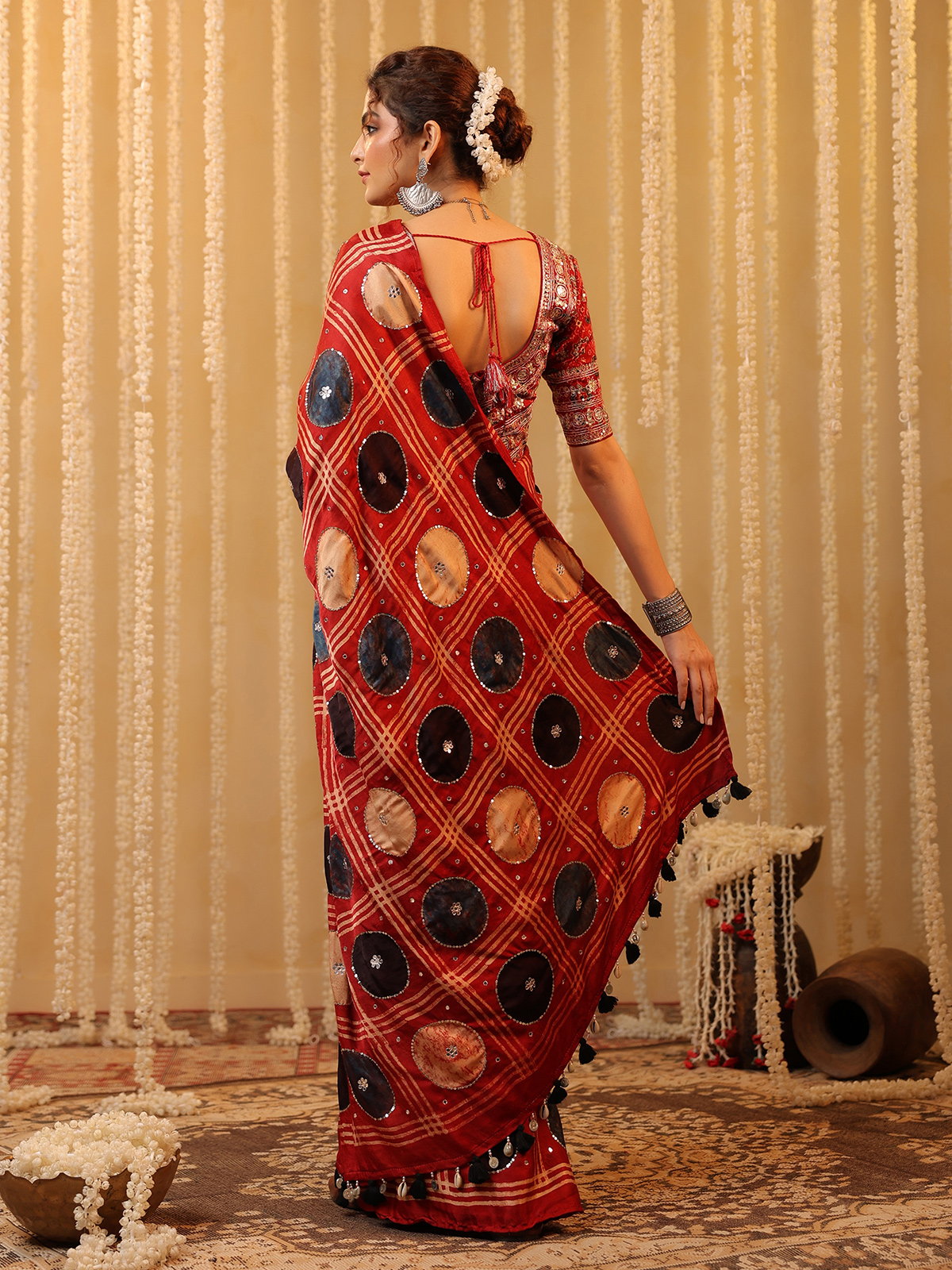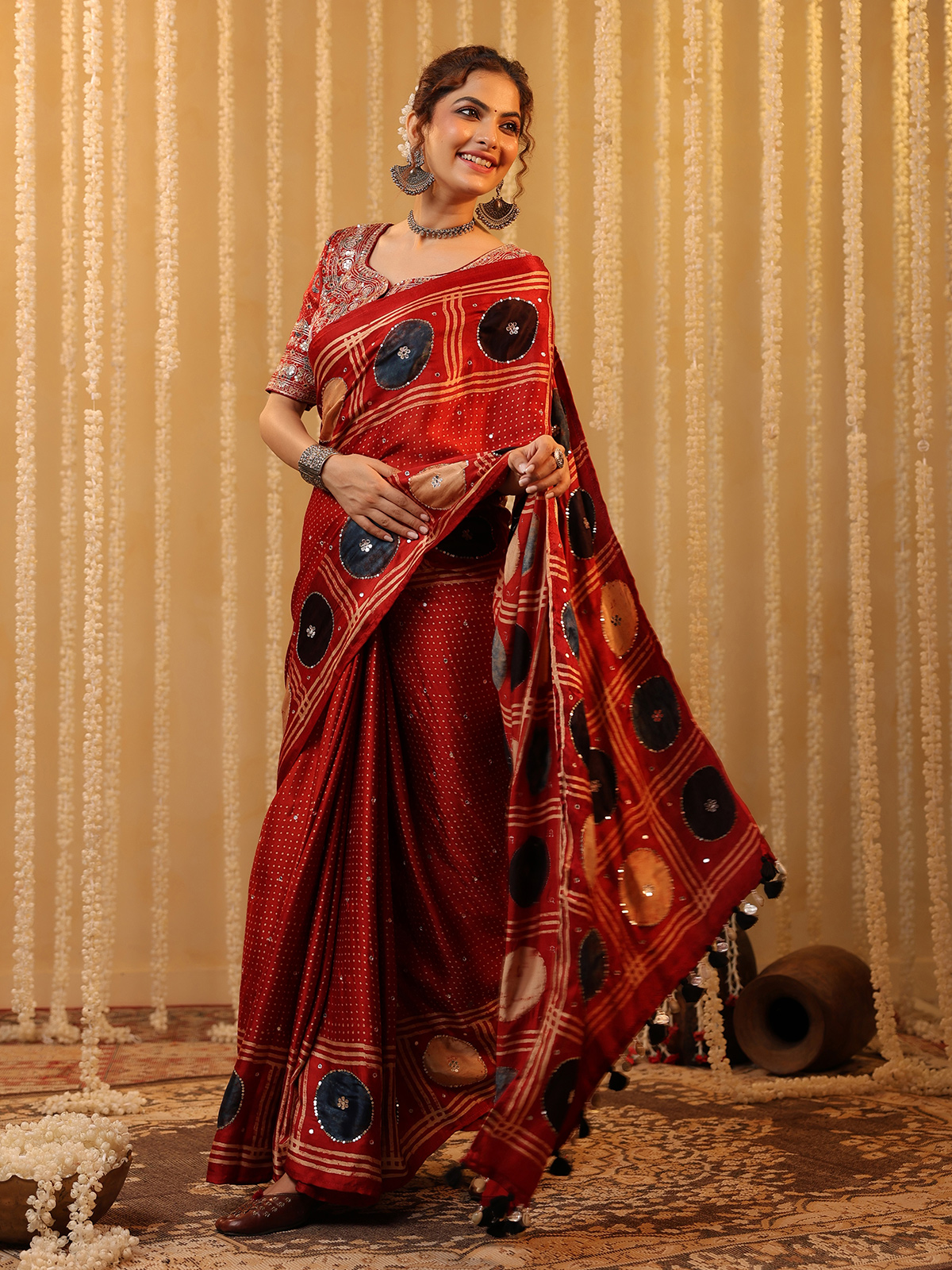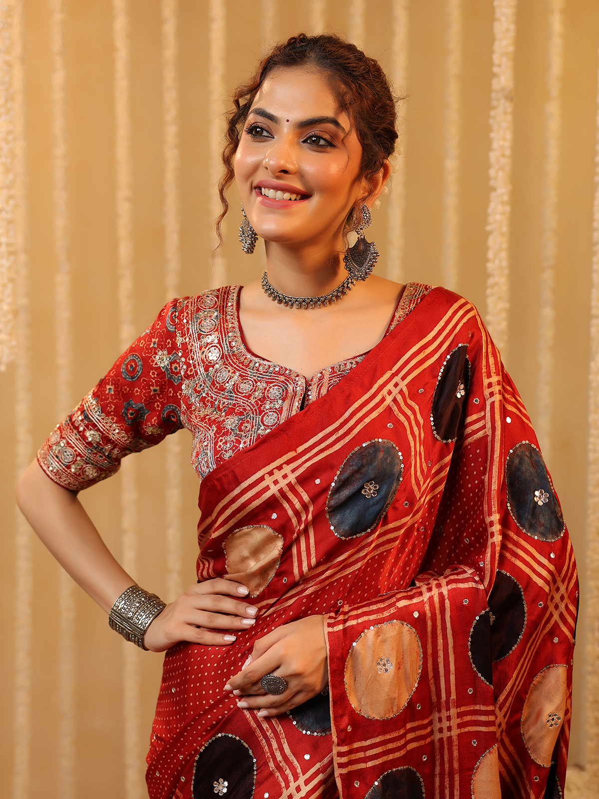Radiant red cotton silk printed saree shines with resham, sequins, beads, cowrie shells, and mirror work, glowing with festive grandeur. A readymade blouse completes its charm, making it ideal for vibrant gatherings. Each fold celebrates artistry, blending tradition with luminous beauty.