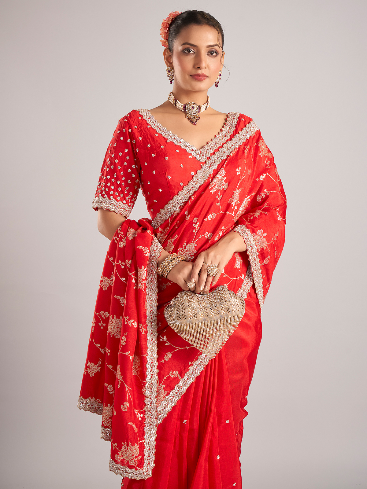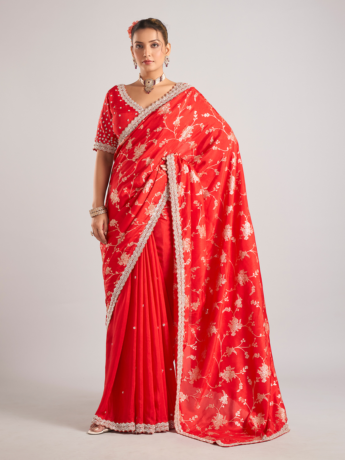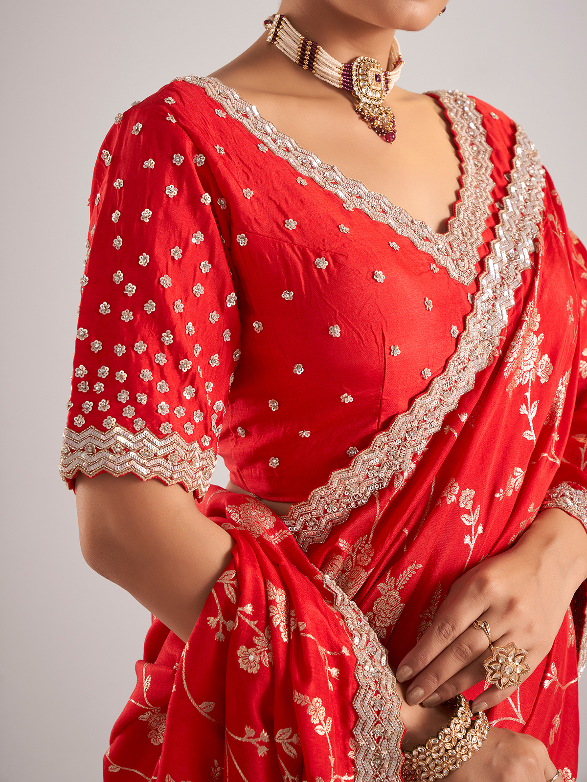 This red pure dola silk saree features an ornate blend of cutdana, sequins, stone and zari work. A regal choice for wedding functions and festivals, it comes with a ready made blouse.