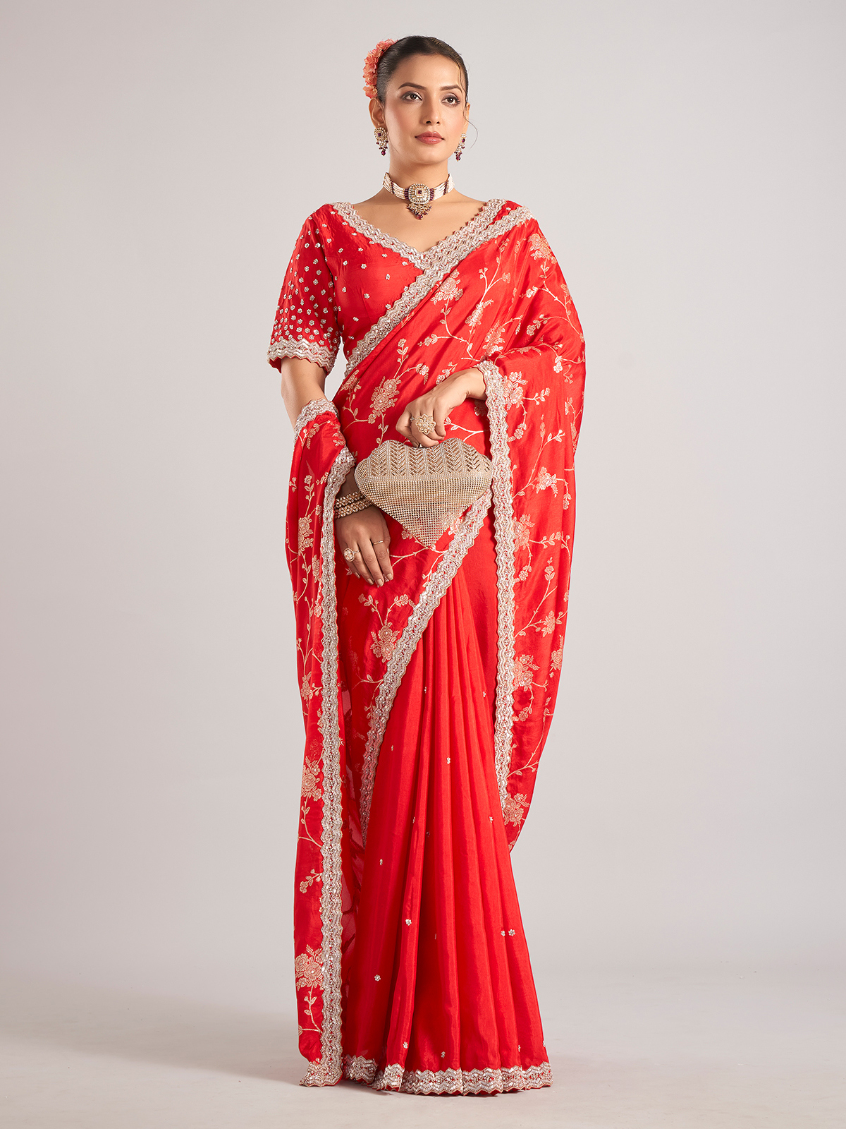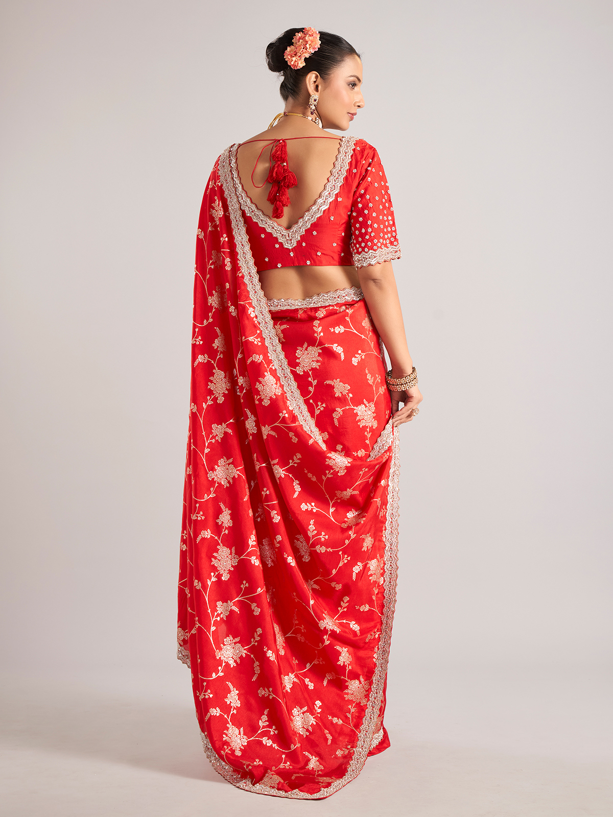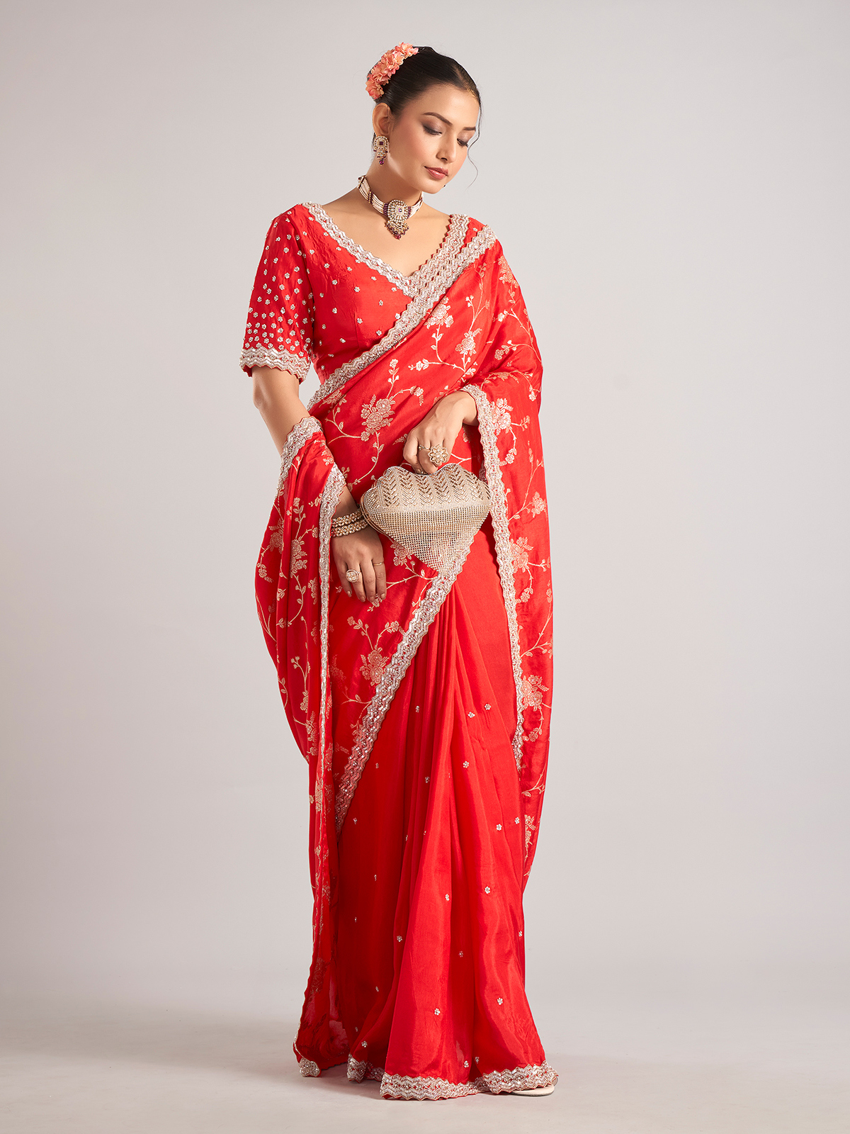 This red pure dola silk saree features an ornate blend of cutdana, sequins, stone and zari work. A regal choice for wedding functions and festivals, it comes with a ready made blouse.