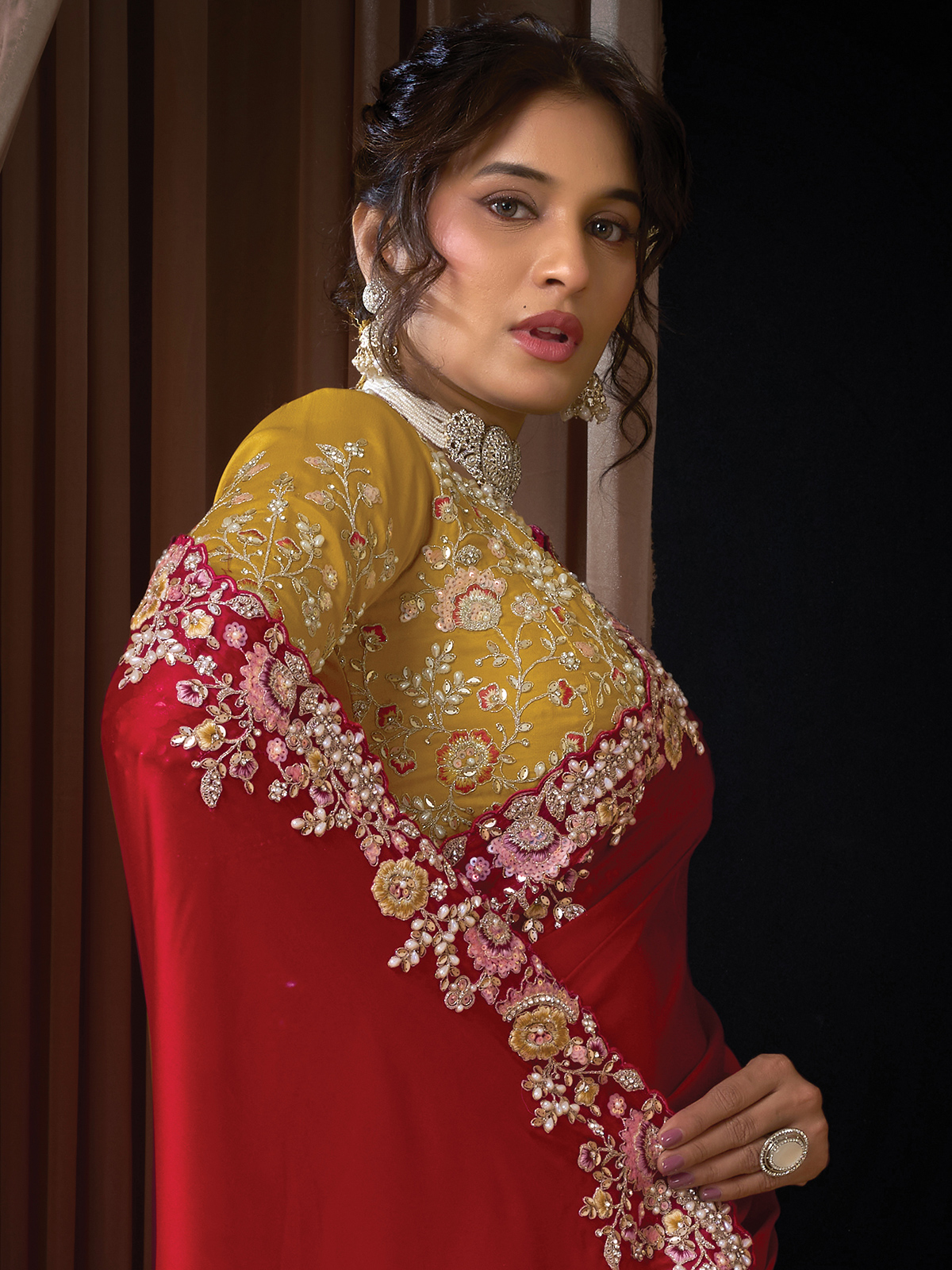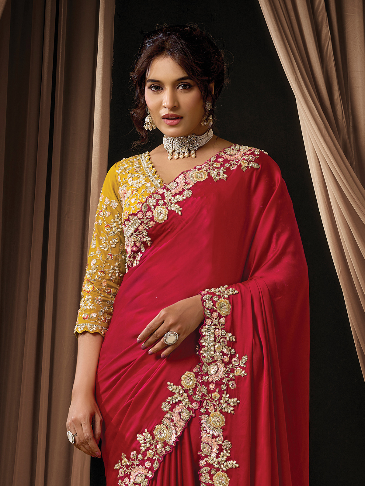 Celebrating timeless luxury for women who love bold elegance, this red satin silk saree radiates regal appeal. Adorned with resham, sequins, diamond accents, and pearl embellishments, it offers a dazzling yet graceful look. Perfect for festivals, receptions, and weddings, it includes an unstitched blouse with rich detailing.
