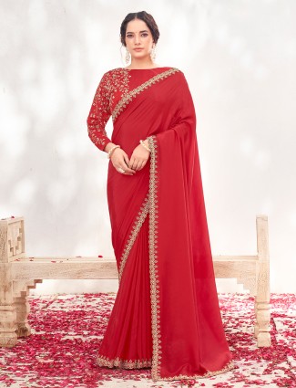 Red Satin Silk Saree With Stones Zari Embellishment