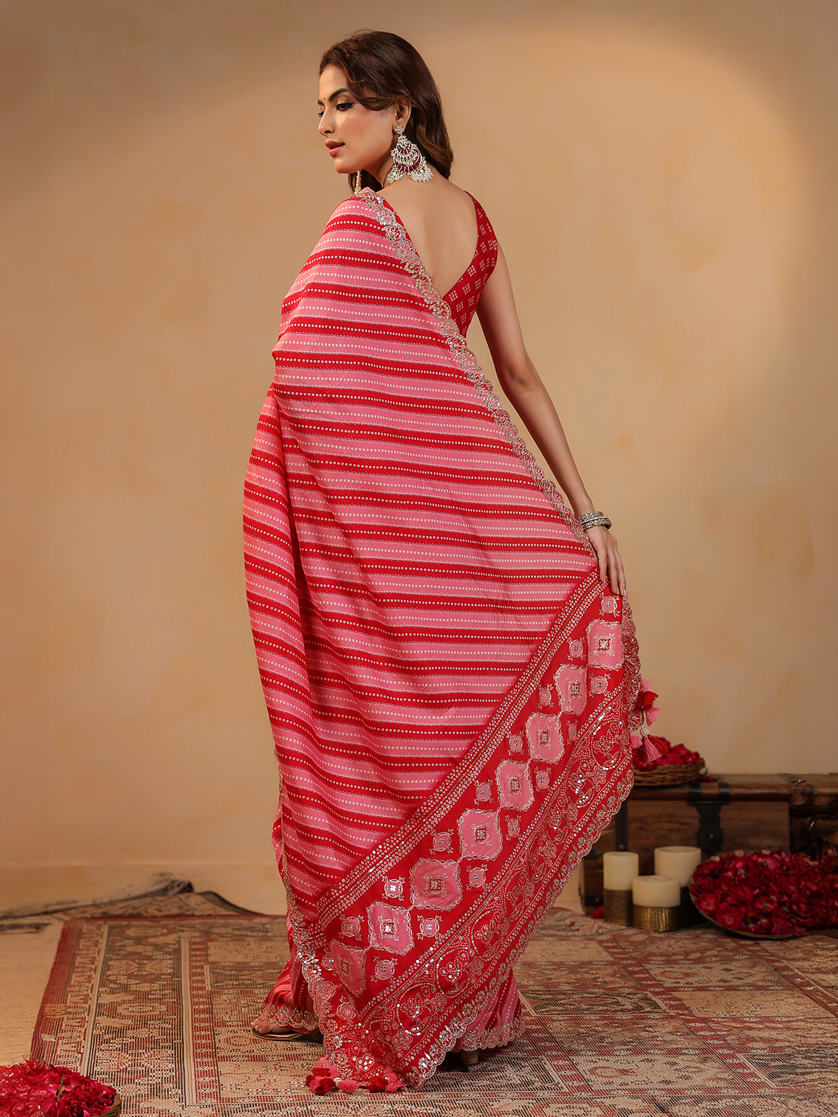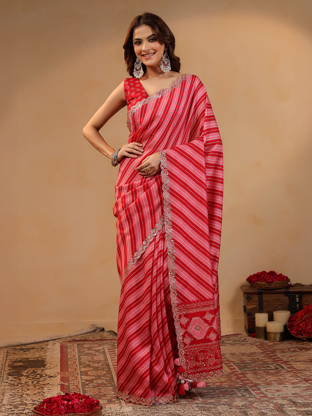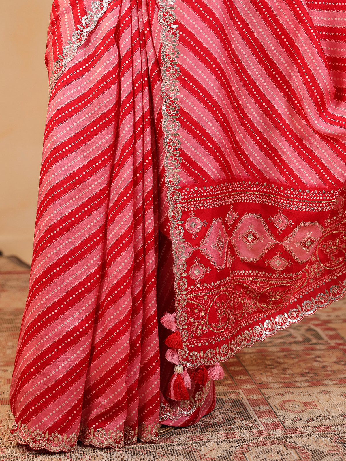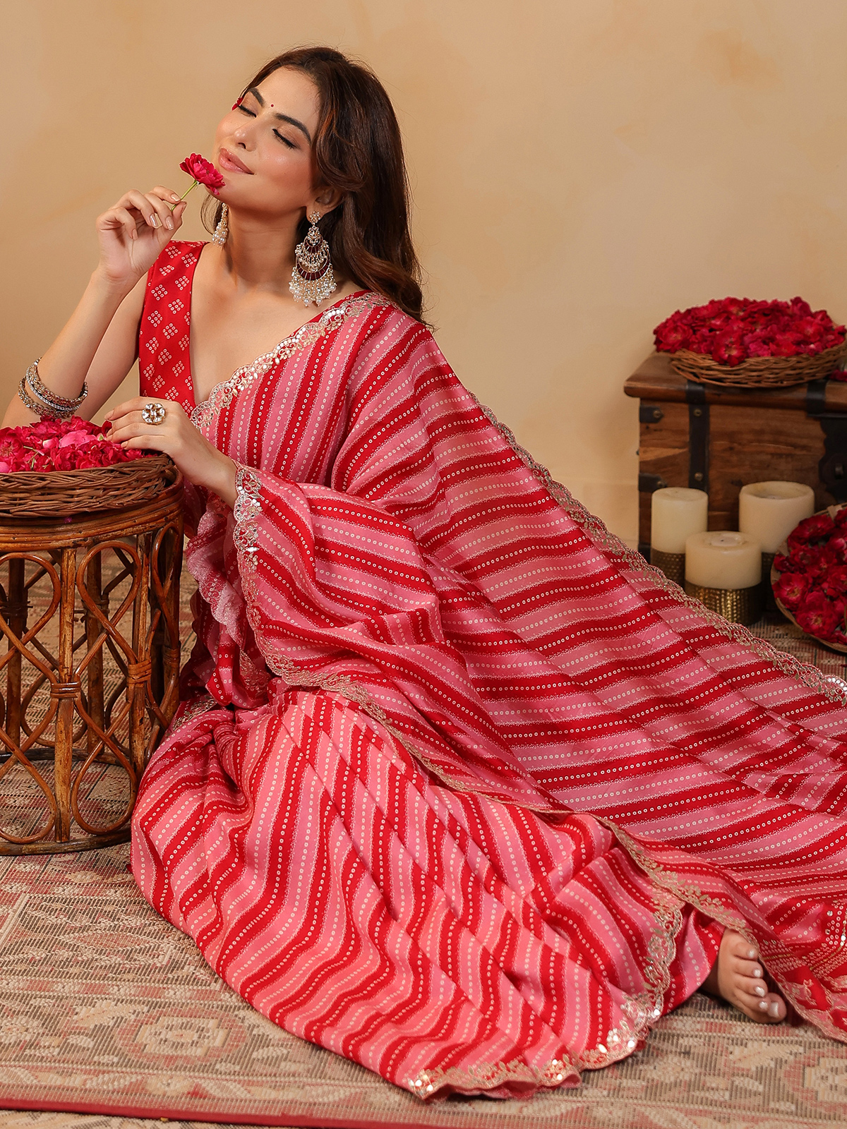 Festive vibrance lights up the red silk printed saree, flowing elegantly. Aabla, resham, gota, sequins, and beads add celebratory sparkle. Comes with an unstitched blouse piece for festive occasions.