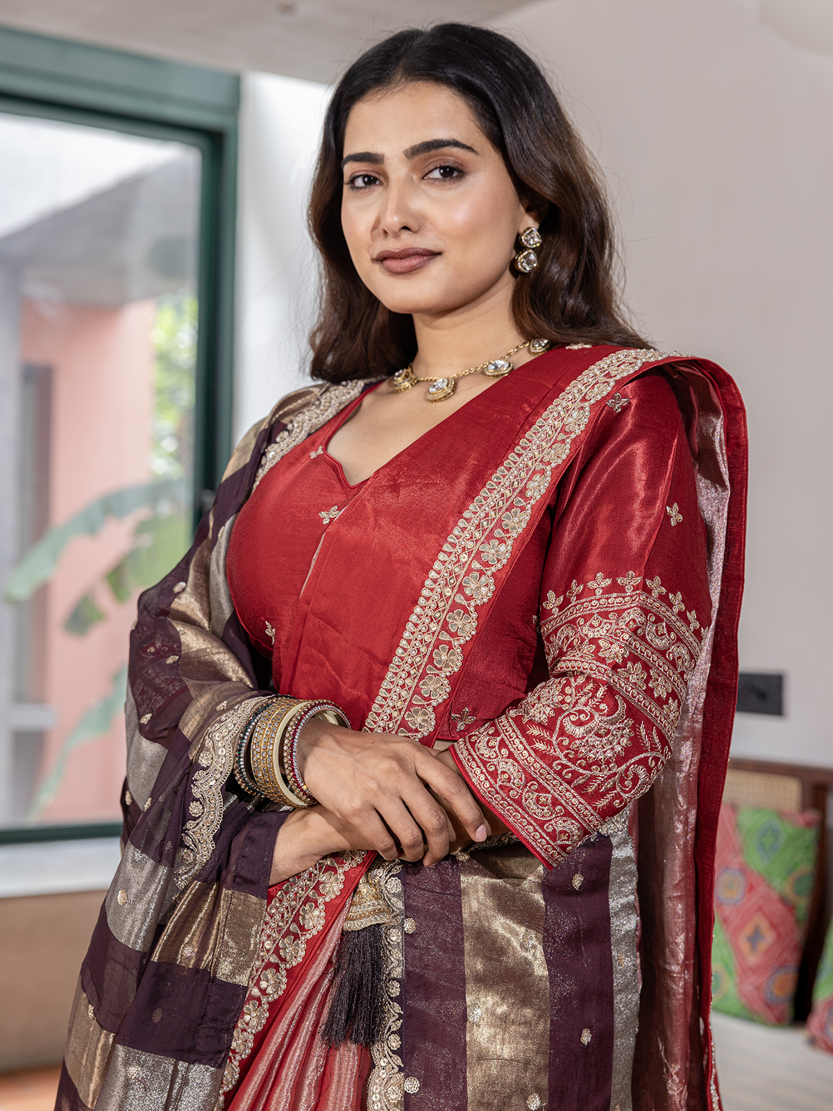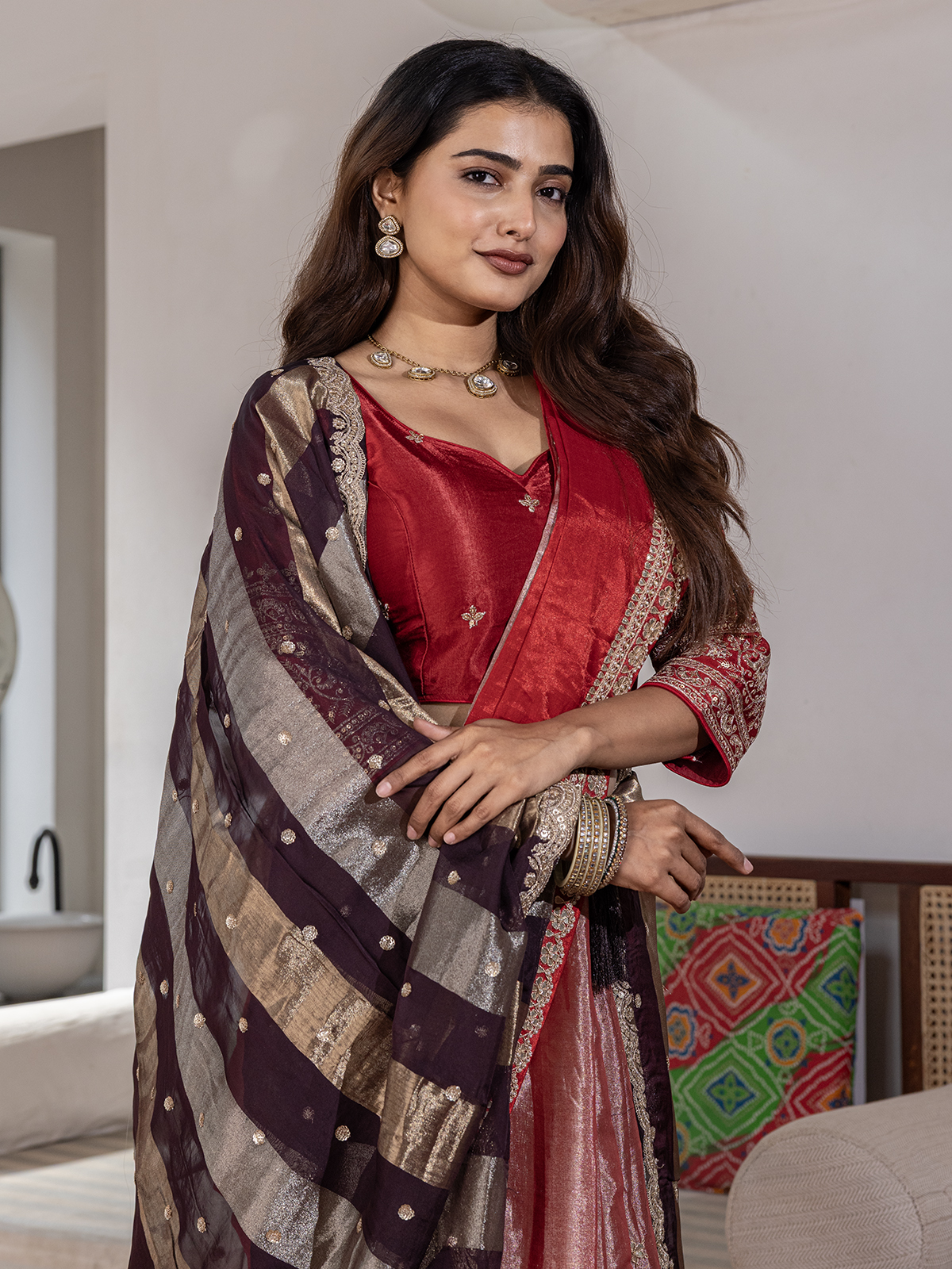 This red silk saree glows with timeless warmth, its rich hue elevated by resham, sequins, beads and gota that sparkle with graceful intensity. Paired with an unstitched blouse, it fits receptions, weddings and festive occasions. Note: the dupatta shown is used only for photoshoot styling.