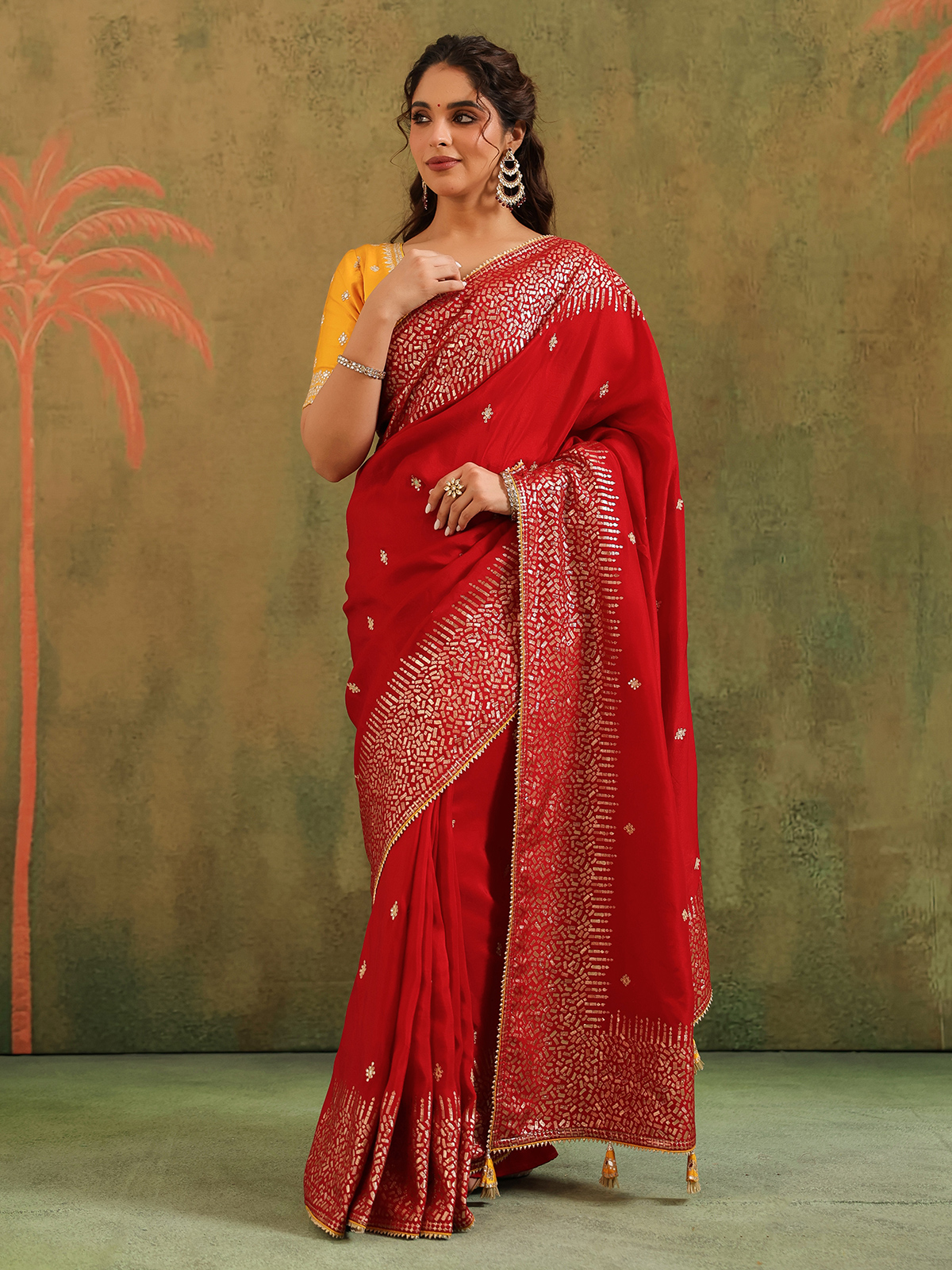 Vivid red silk radiates vibrancy, embodying the essence of festivity. Aabla, thread, and zari trace graceful patterns across its weave, gleaming like radiant sunlit motifs. Paired with a yellow unstitched blouse piece, this saree becomes a timeless choice for festive and cultural occasions.