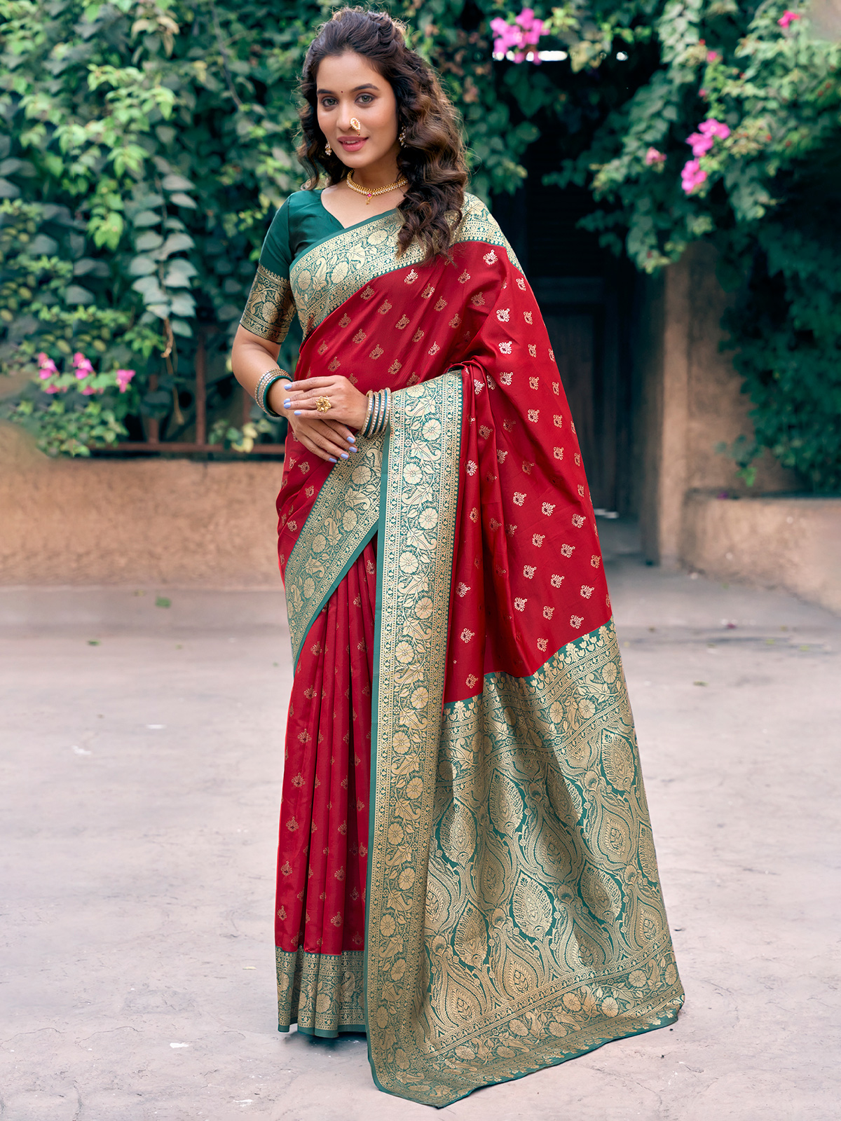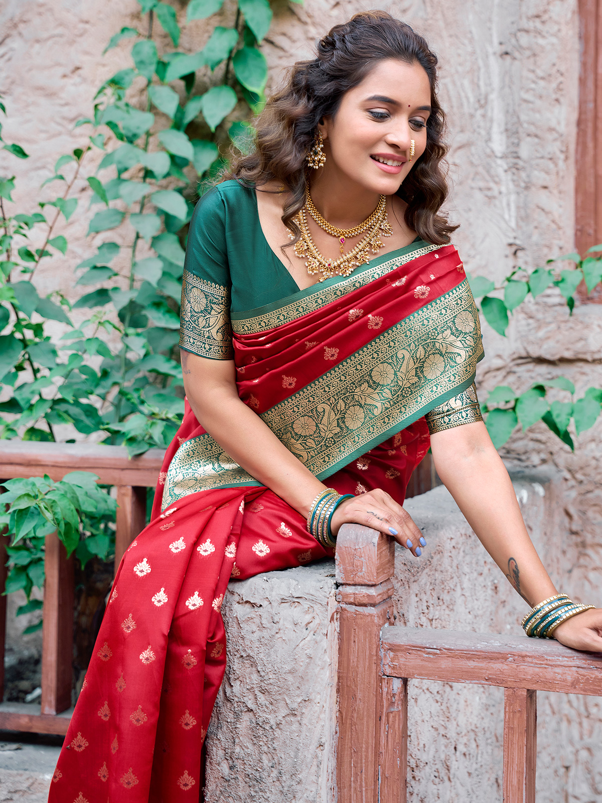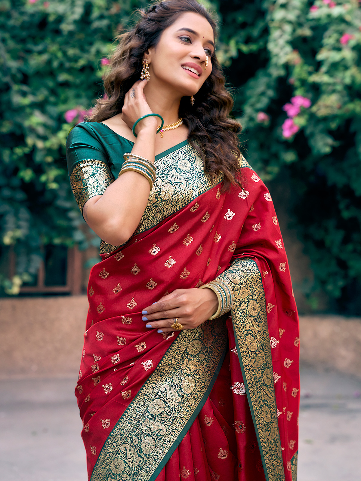 This red silk saree showcases subtle zari pattern weaving, adding gentle sheen to its smooth, elegant drape. Perfect for weddings and traditional celebrations, it offers a classic yet refined appeal. The saree includes an unstitched blouse piece for personalised tailoring.