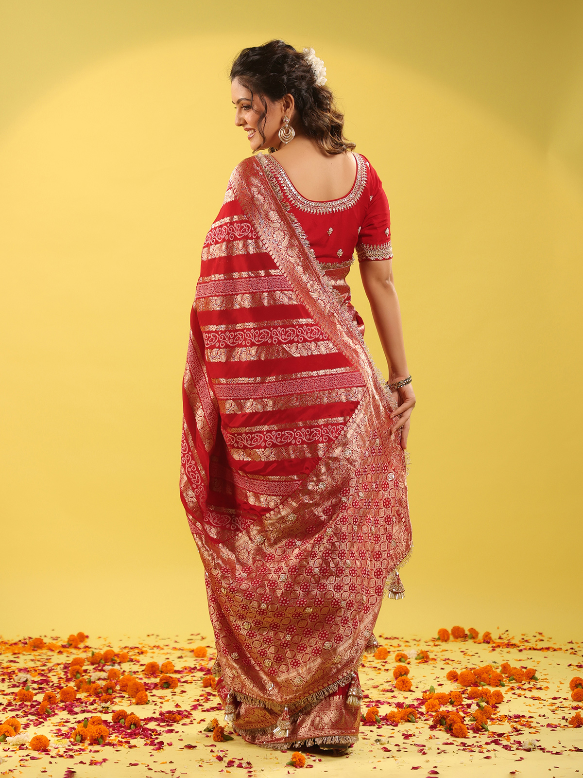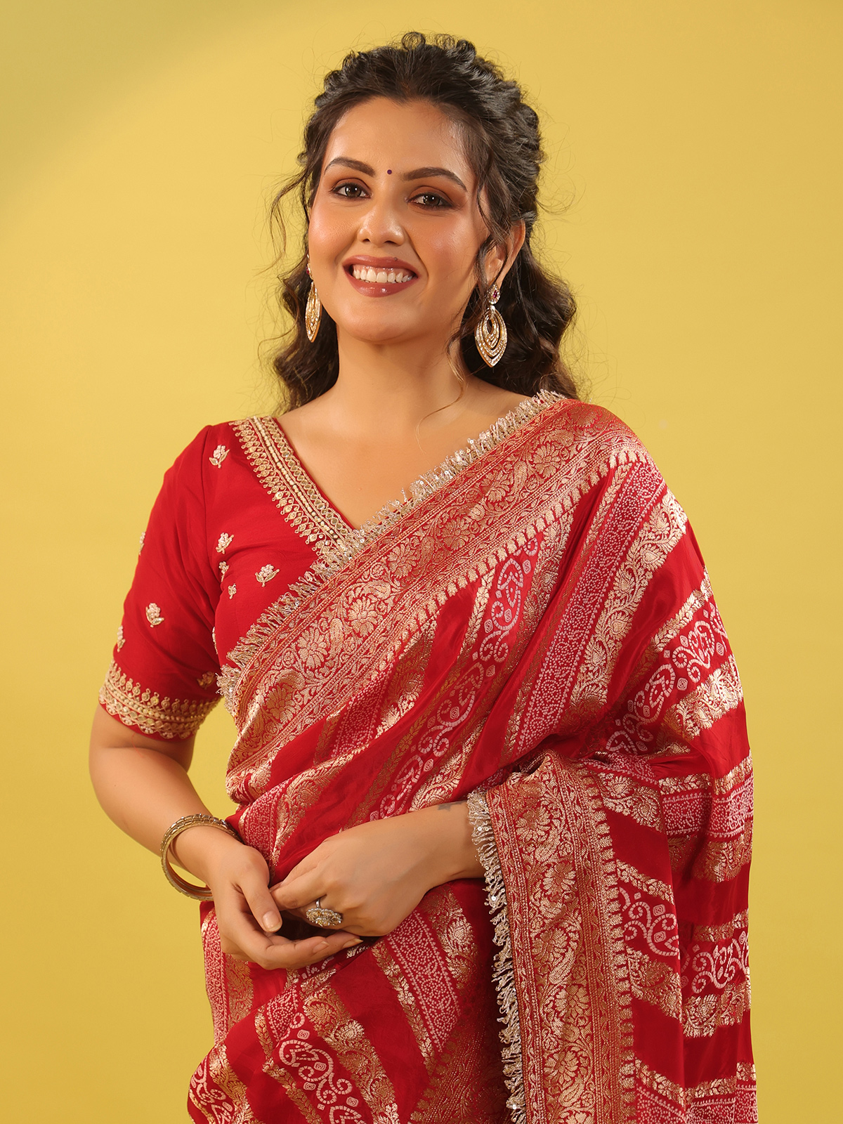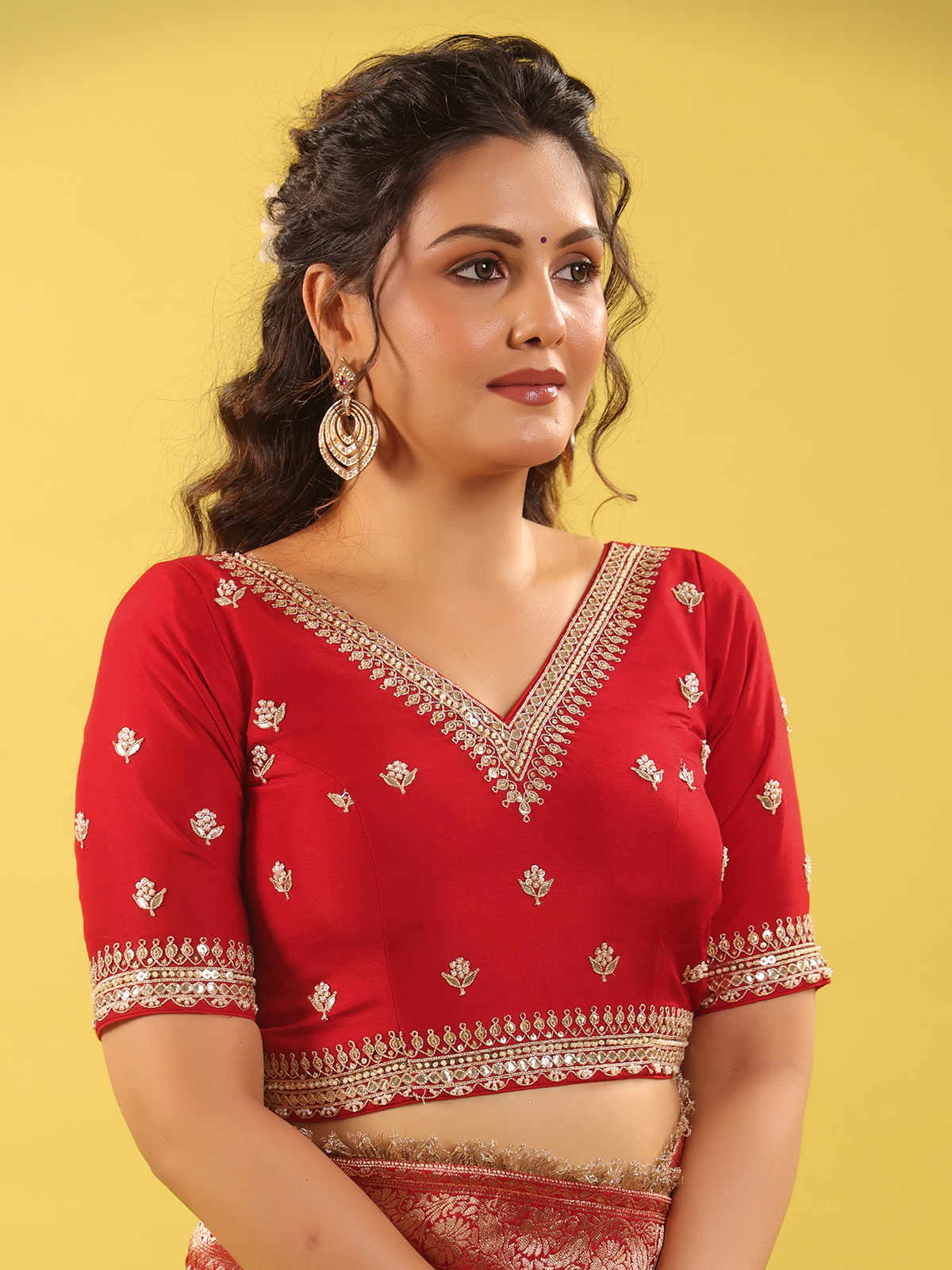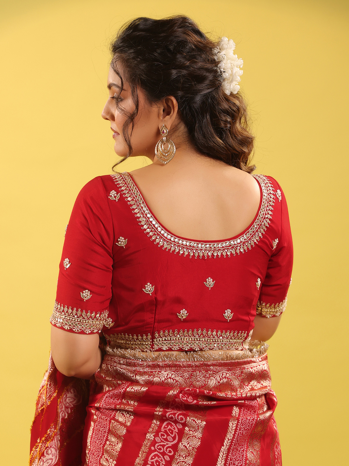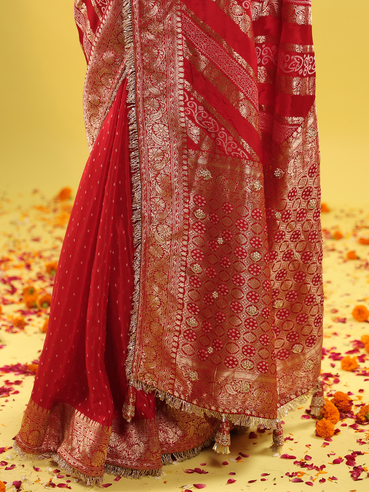 Opulent red silk sparkles luxuriously with zari, resham, beads, gota, zardosi, and sequins, capturing light at every fold. Comes with an unstitched blouse piece, curated for weddings and high-end festive celebrations.