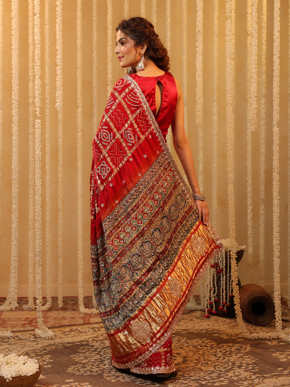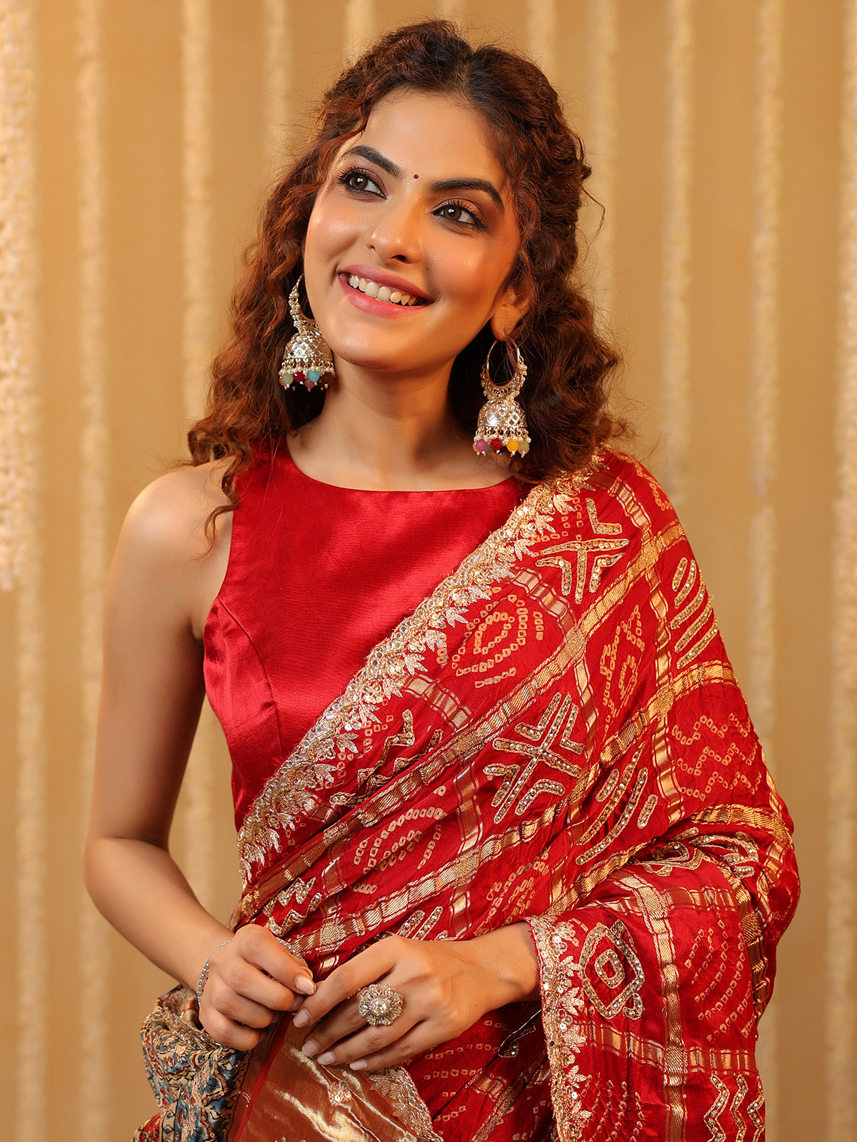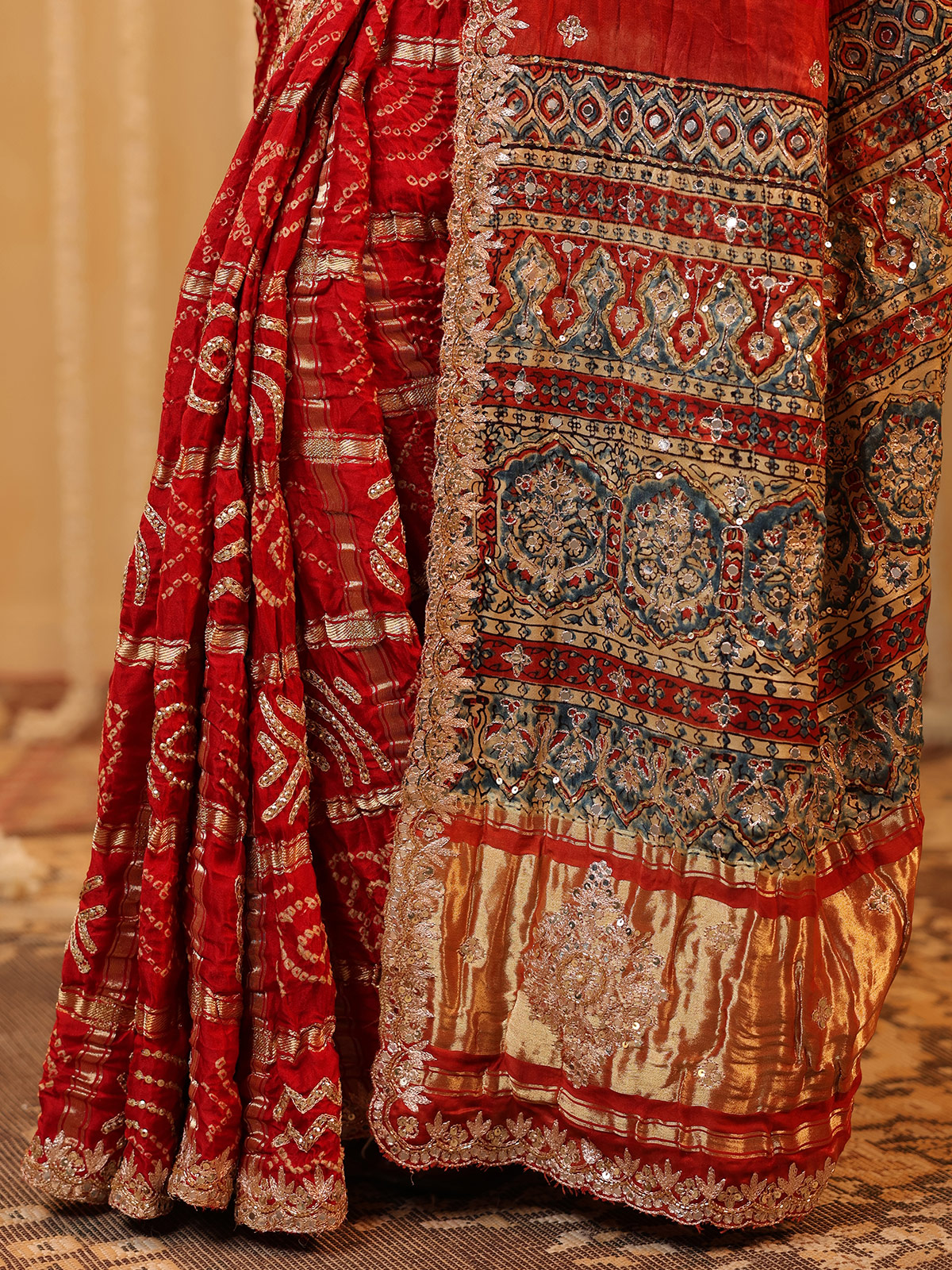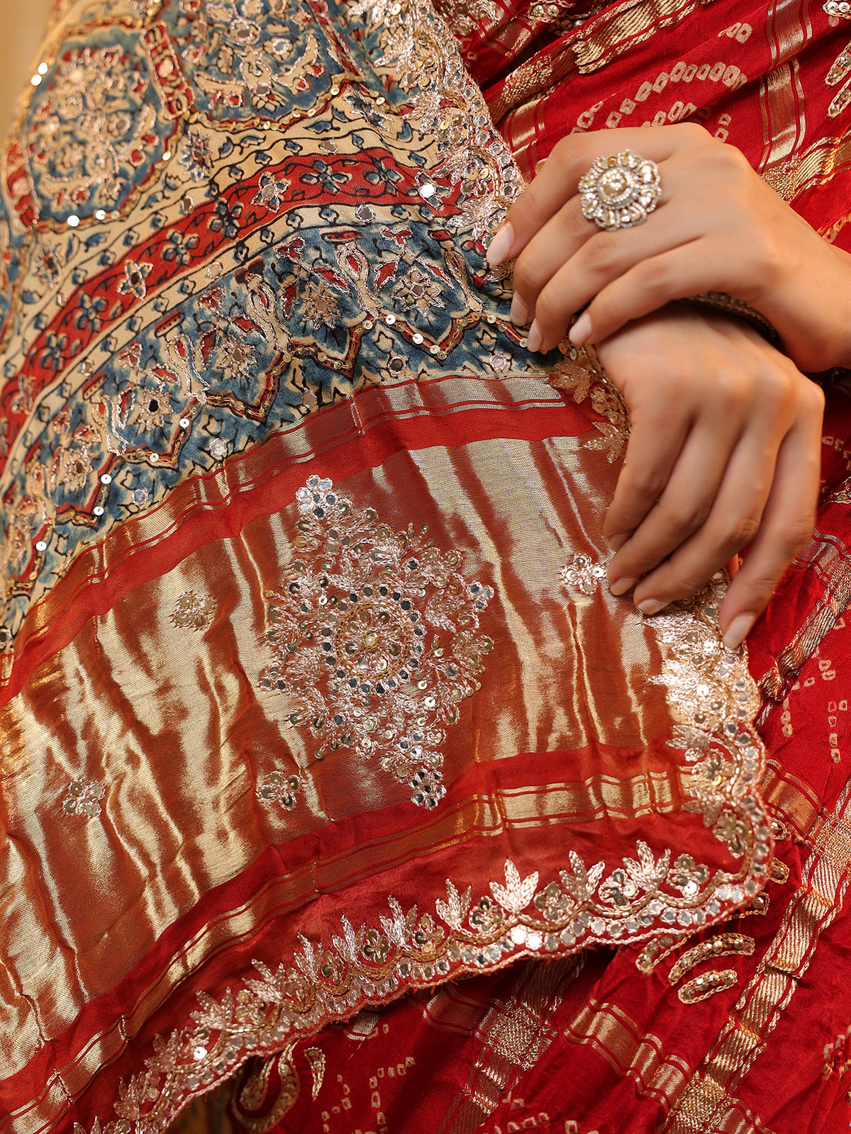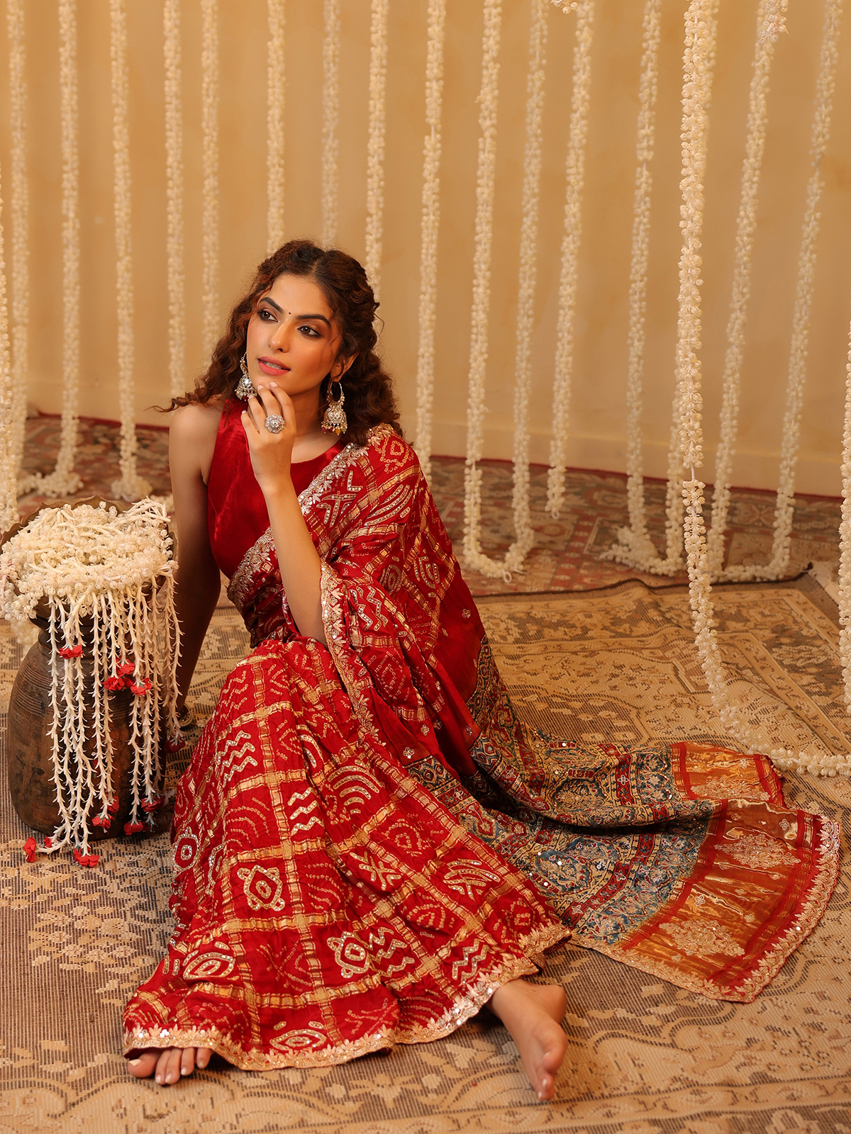 Glowing in bridal splendour, the red bandhej silk printed saree dazzles with zari, resham, sequins, cutdana, and beads work. With an unstitched blouse piece, it offers custom elegance for festive and wedding occasions. Every fold radiates cultural artistry, carrying tradition and grandeur in luminous detail.