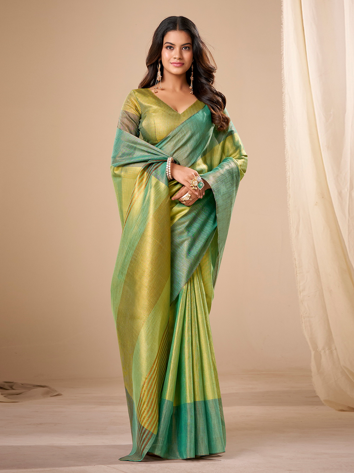 Designed in refreshing green tissue silk, this saree features classic zari work that enhances its traditional charm. Finished with an unstitched blouse piece, it drapes fluidly and shines beautifully, making it perfect for weddings, festive occasions, sangeet evenings and joyful mehndi functions.