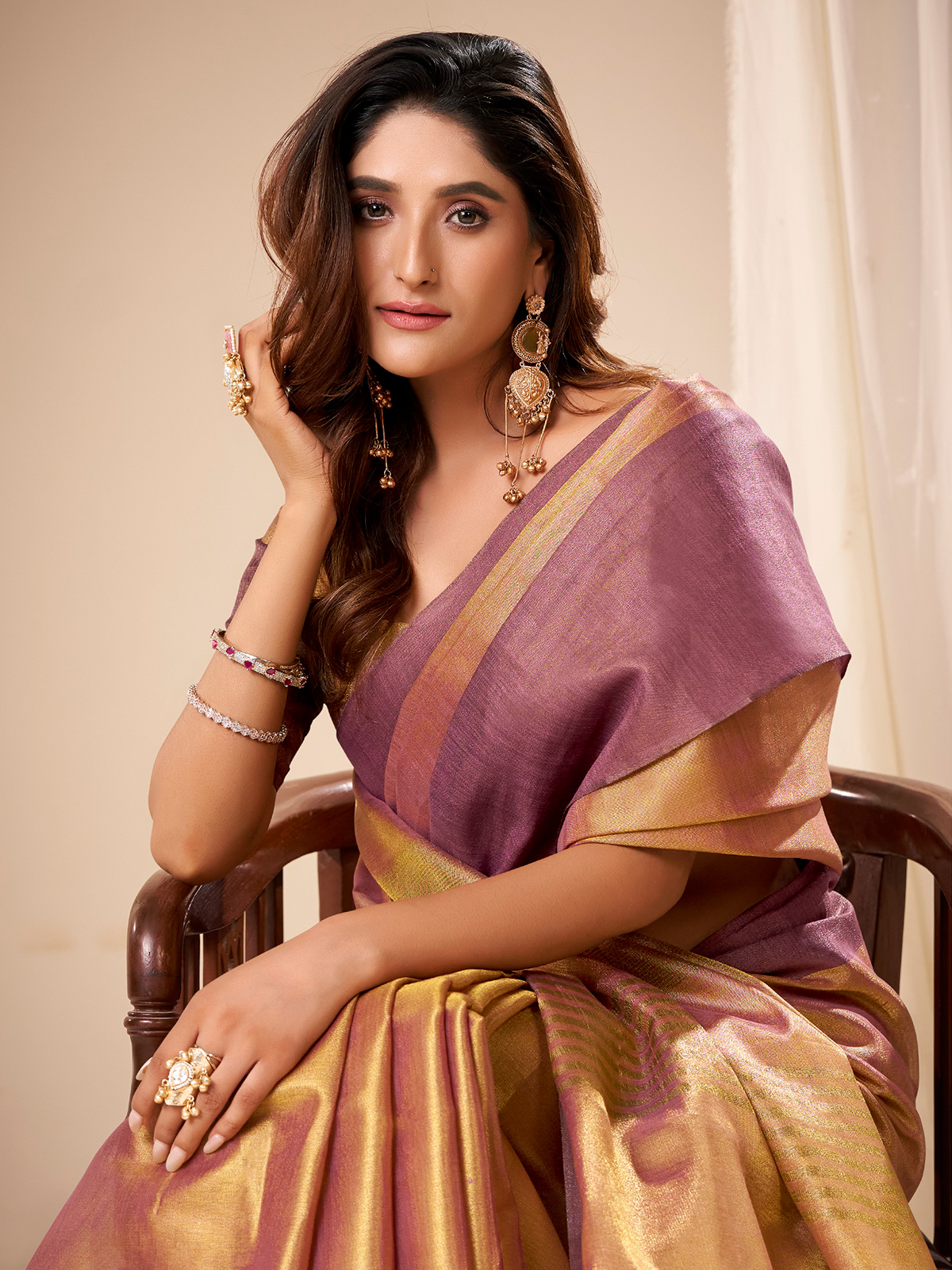 This regal gold and purple tissue silk saree showcases intricate zari work that lends a rich festive finish. Paired with an unstitched blouse piece, it drapes elegantly and exudes grandeur, making it ideal for weddings, haldi ceremonies, sangeet functions and festive occasions.
