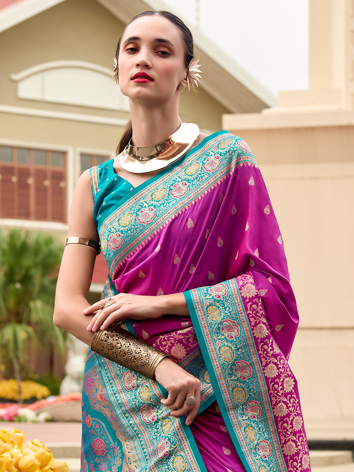 Crafted in rich purple pure soft banarasi silk, this women saree brings regal charm to festive dressing. Shimmering gold and silver zari work enhances the beautifully detailed motifs, creating a luxurious visual appeal. Paired with an unstitched blouse, it is ideal for weddings, sangeet nights, and grand traditional celebrations.