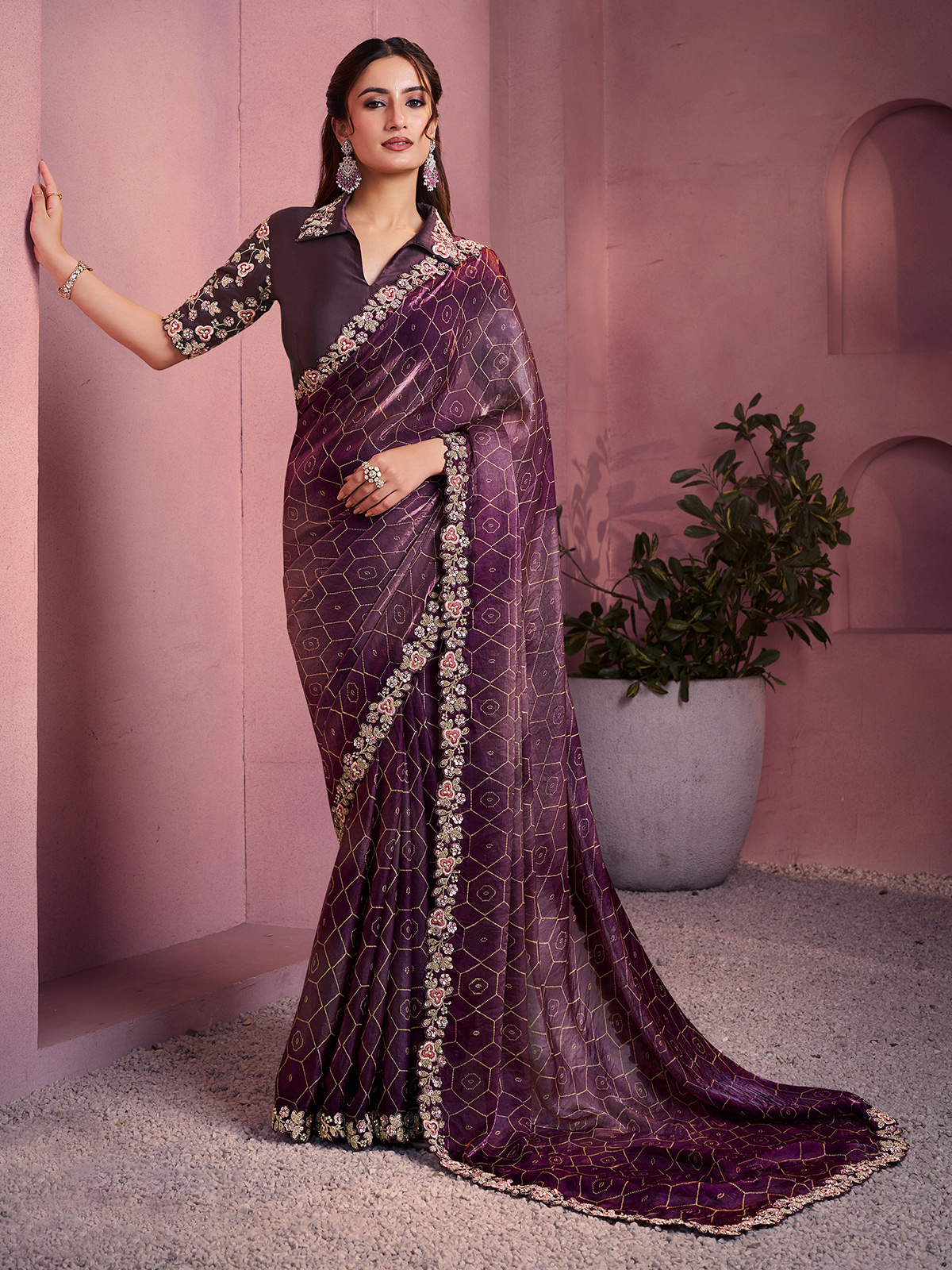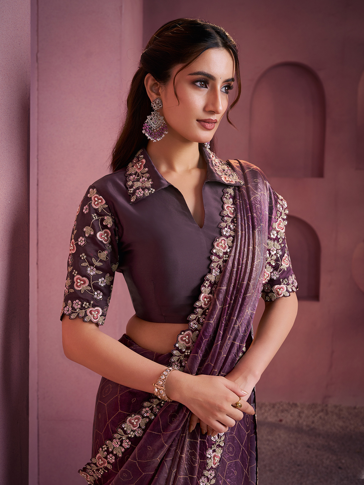 This regal wine two-tone satin silk saree showcases bandhani gajji prints adorned with thread, sequins, pearls, and diamond detailing. Its opulent sheen and graceful fall make it a timeless pick for festive and wedding occasions. Includes an unstitched blouse piece.