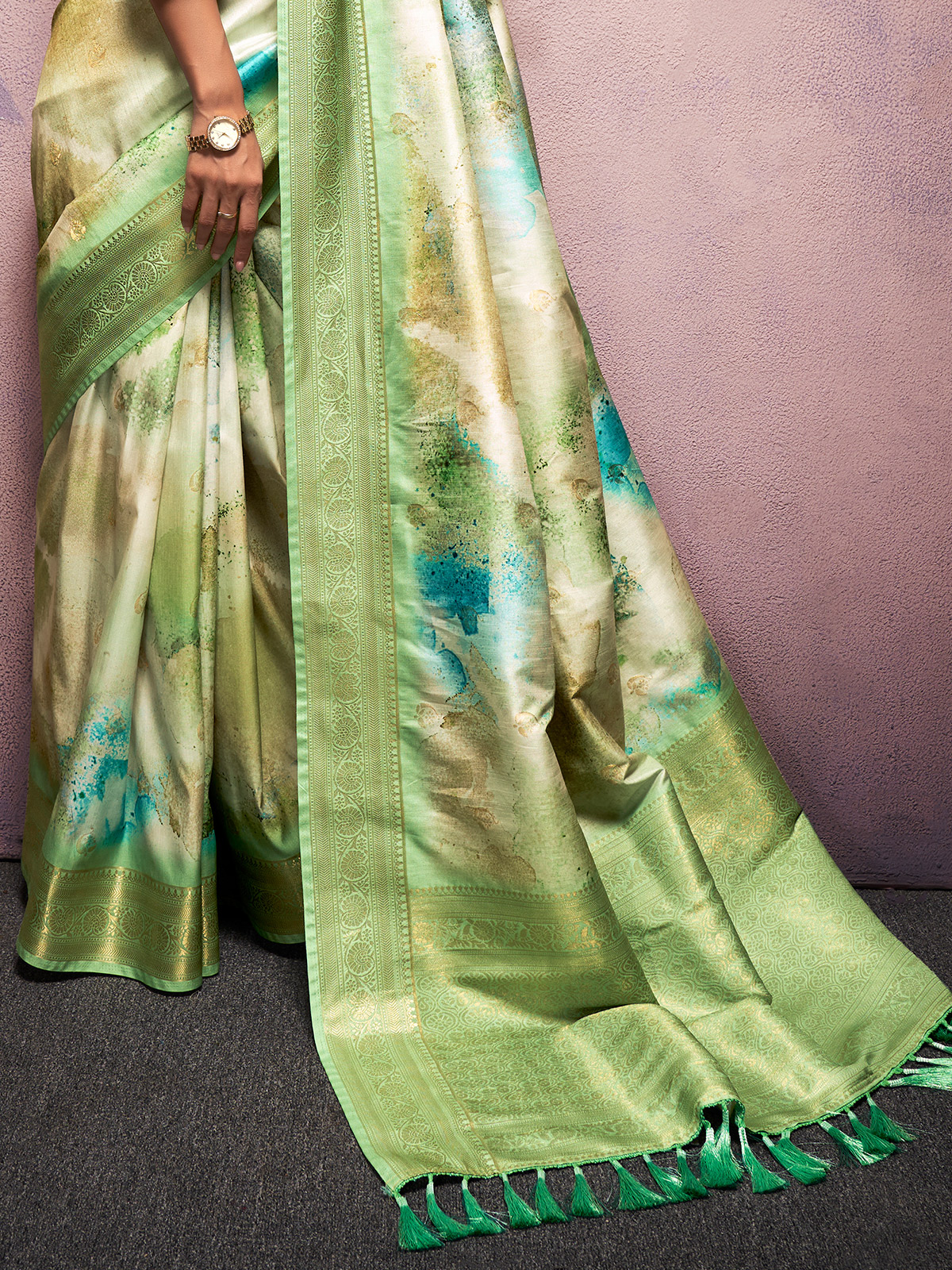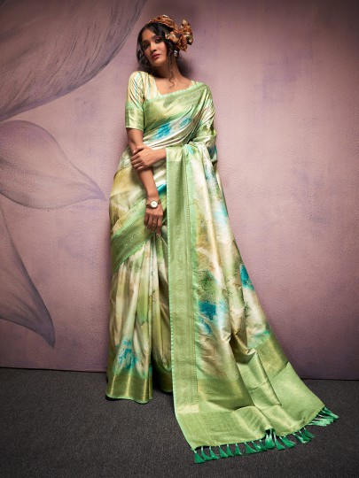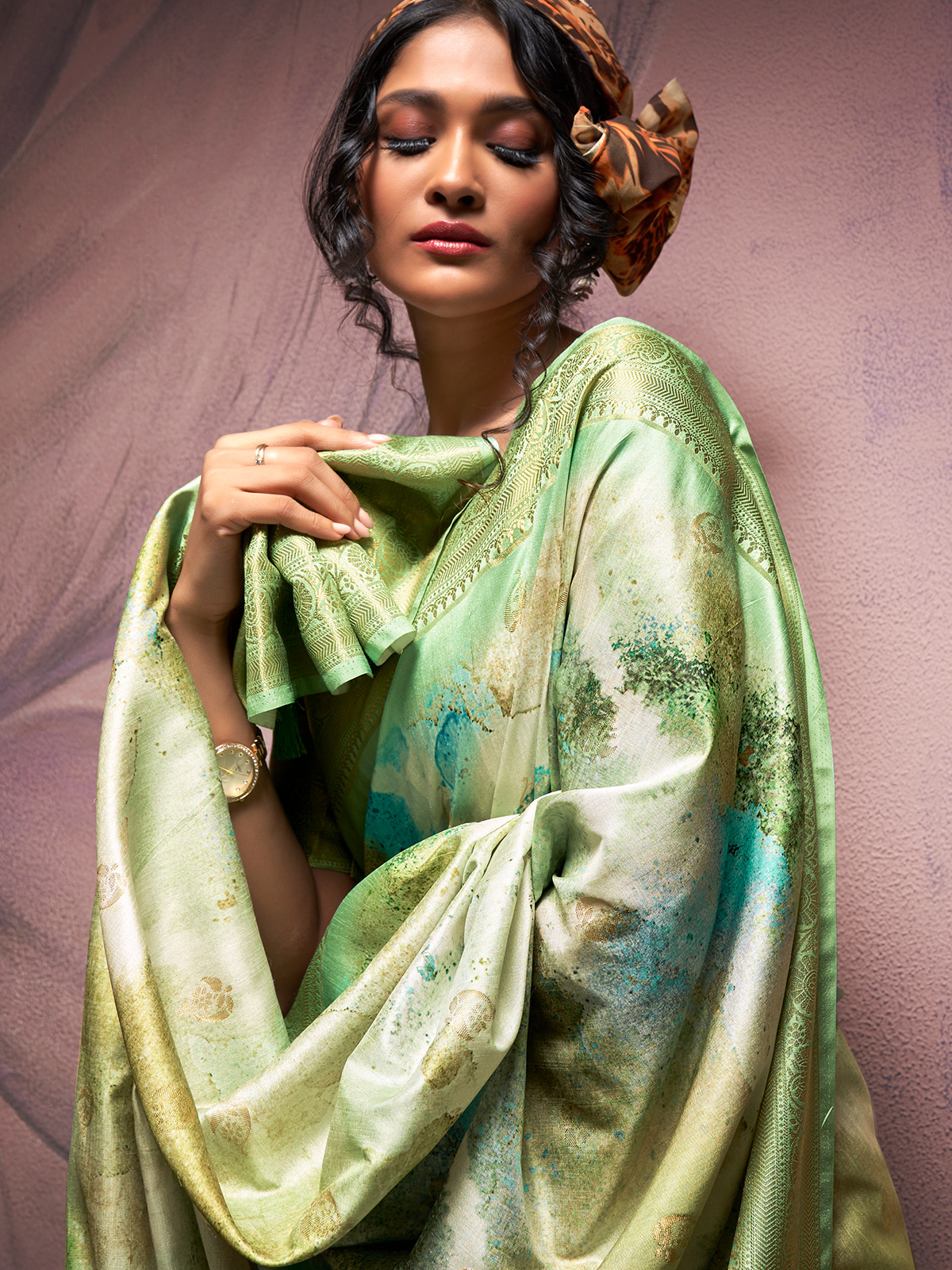 This elegant women saree combination comes with an unstitched blouse crafted in authentic handloom silk. Deep green tones are enriched with painted designs and shimmering zari work, offering a vibrant festive presence. Perfect for weddings and cultural events, it reflects tradition with a luxurious finish.