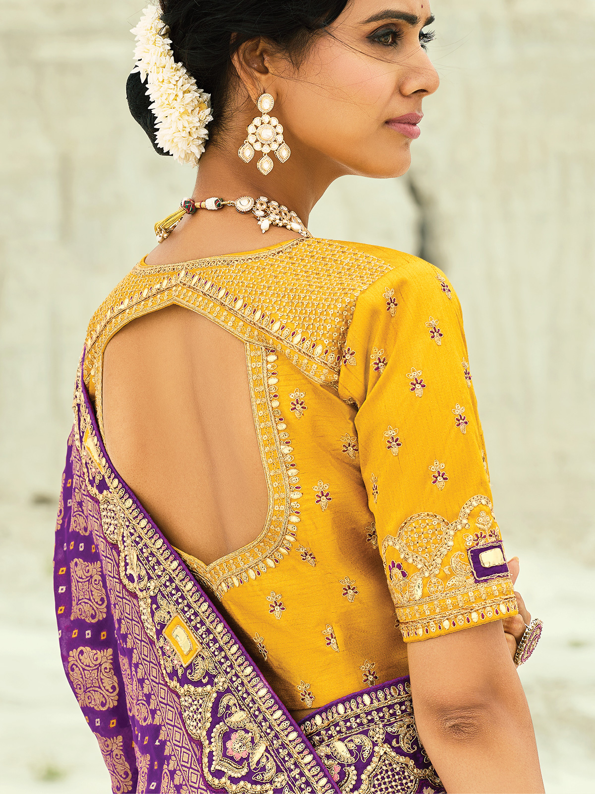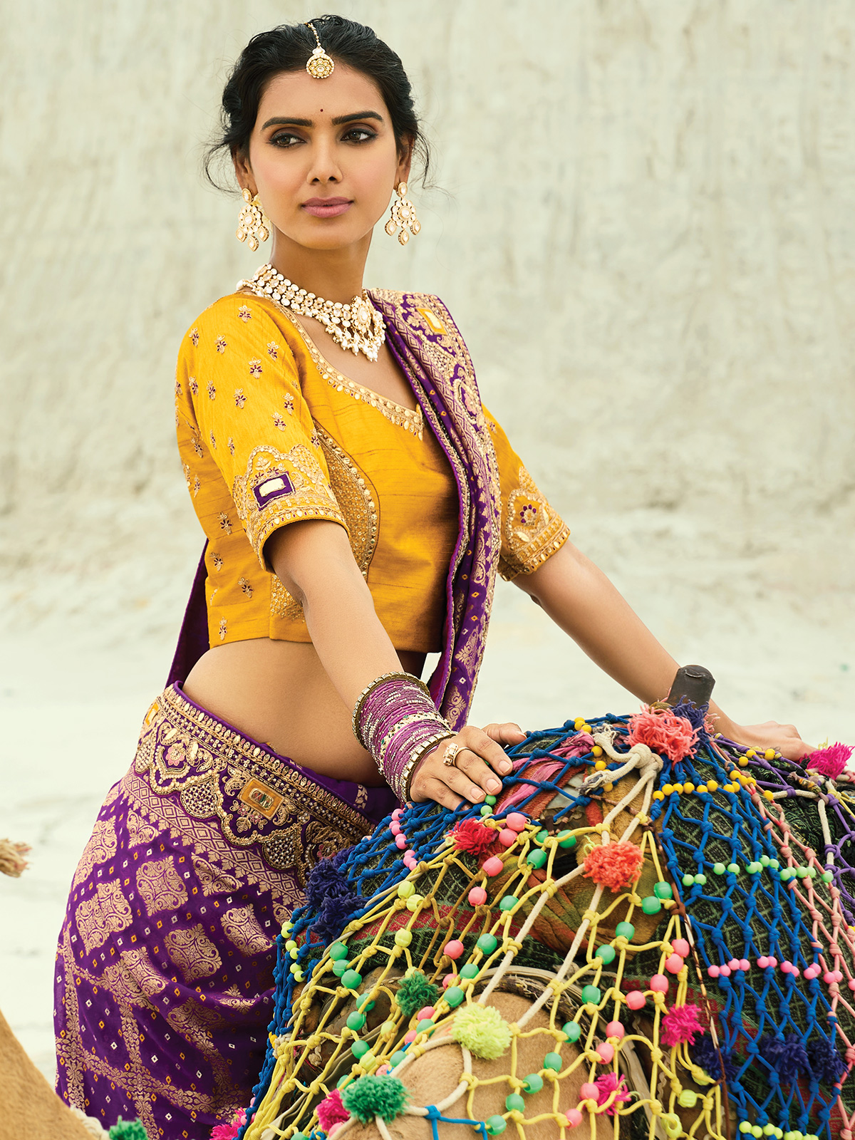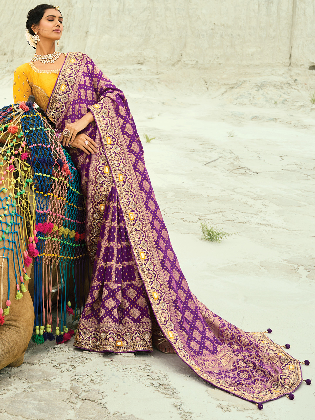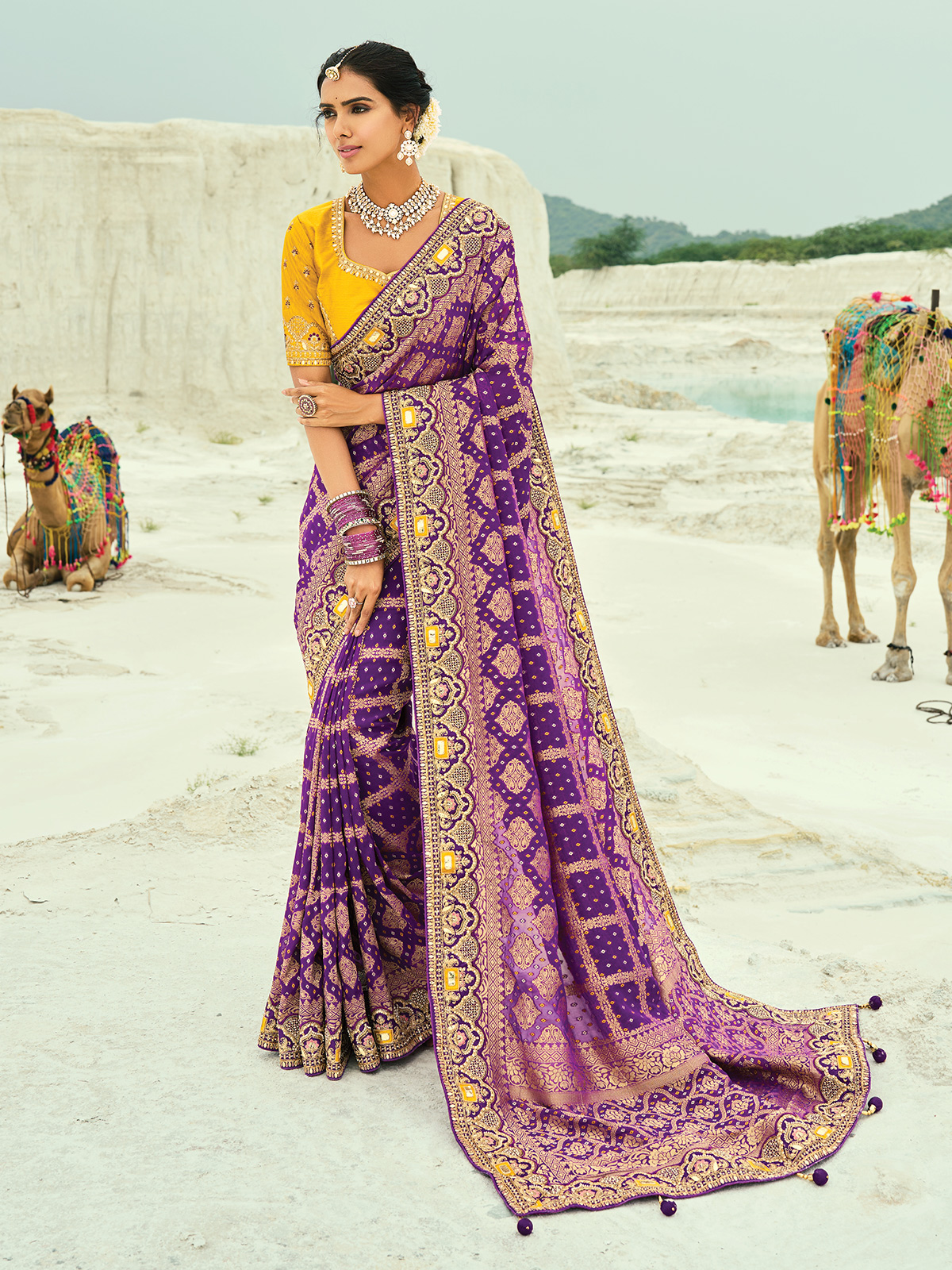 Drape yourself in sophistication with this purple bandhej georgette saree, adorned with resham, sequins, pearls, zari, cutdana, and zardosi. Designed for weddings, it includes an unstitched blouse and exudes pure regal grace.