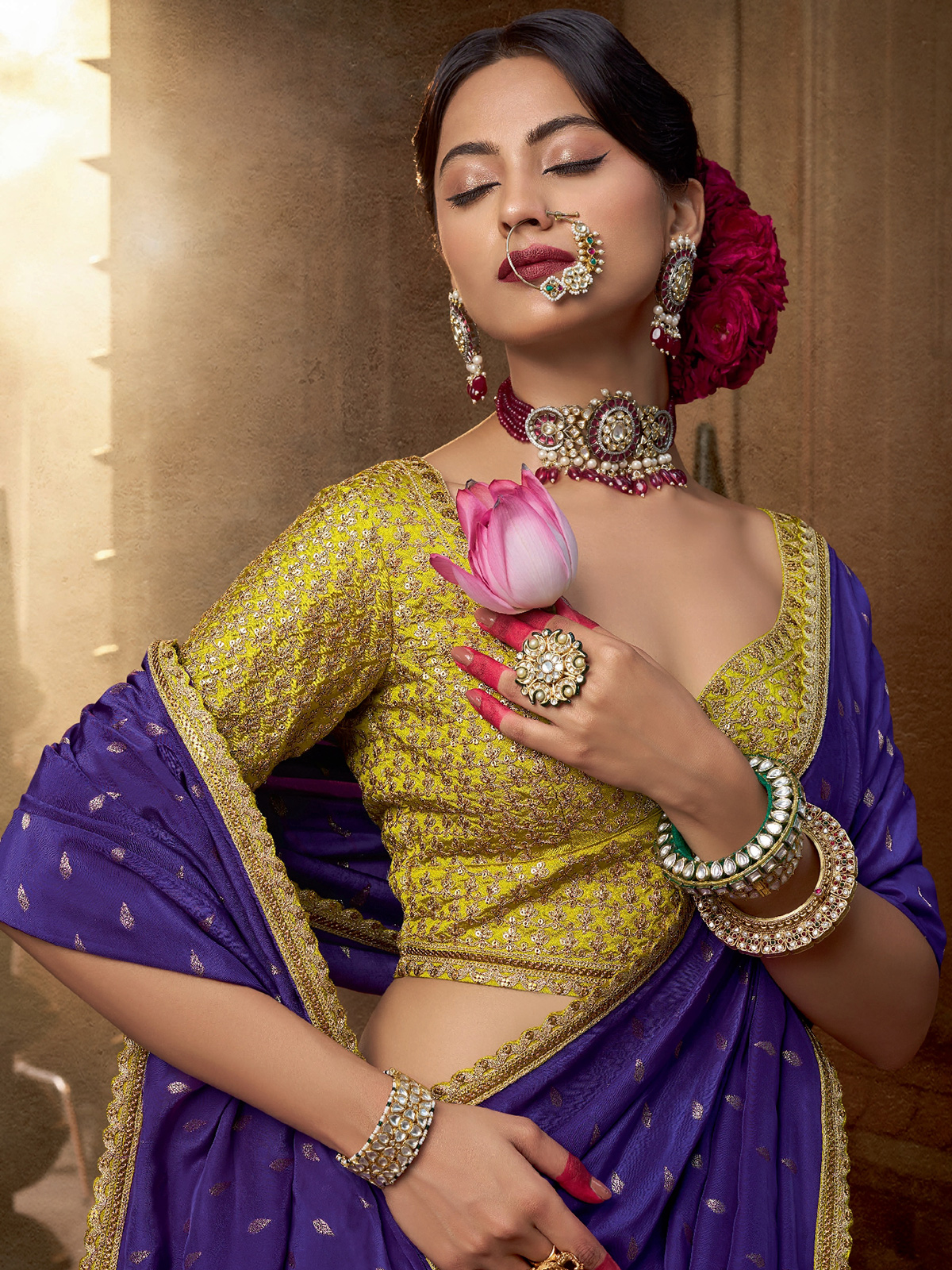 This rich purple viscose crepe silk saree is adorned with resham, sequins, and zari work woven into elegant butti motifs. Perfect for weddings and festive occasions, it embodies timeless sophistication. Comes with an unstitched blouse piece to create a custom, graceful ensemble.