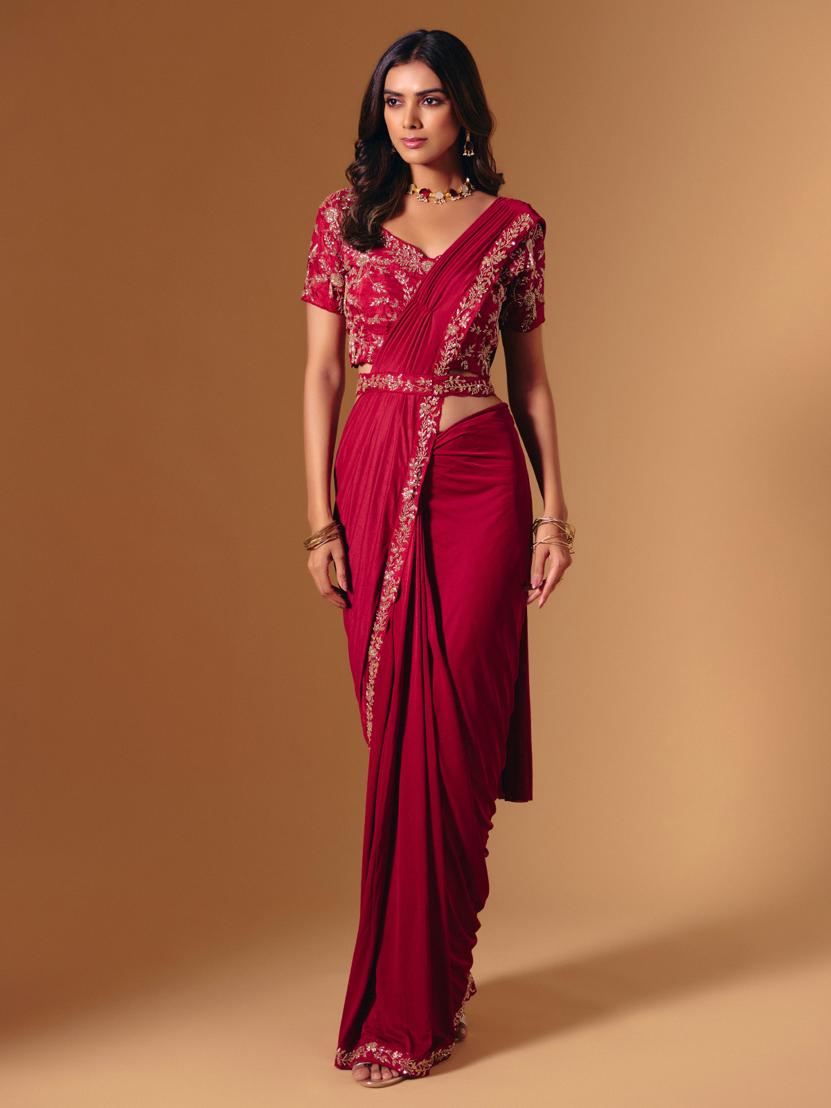 This vibrant red satin lycra saree glows with intricate bead, cutdana, and sequin detailing. The designer waist belt offers contemporary structure, making it an ideal pick for weddings, lively receptions, and festive events where elegance meets comfort.
