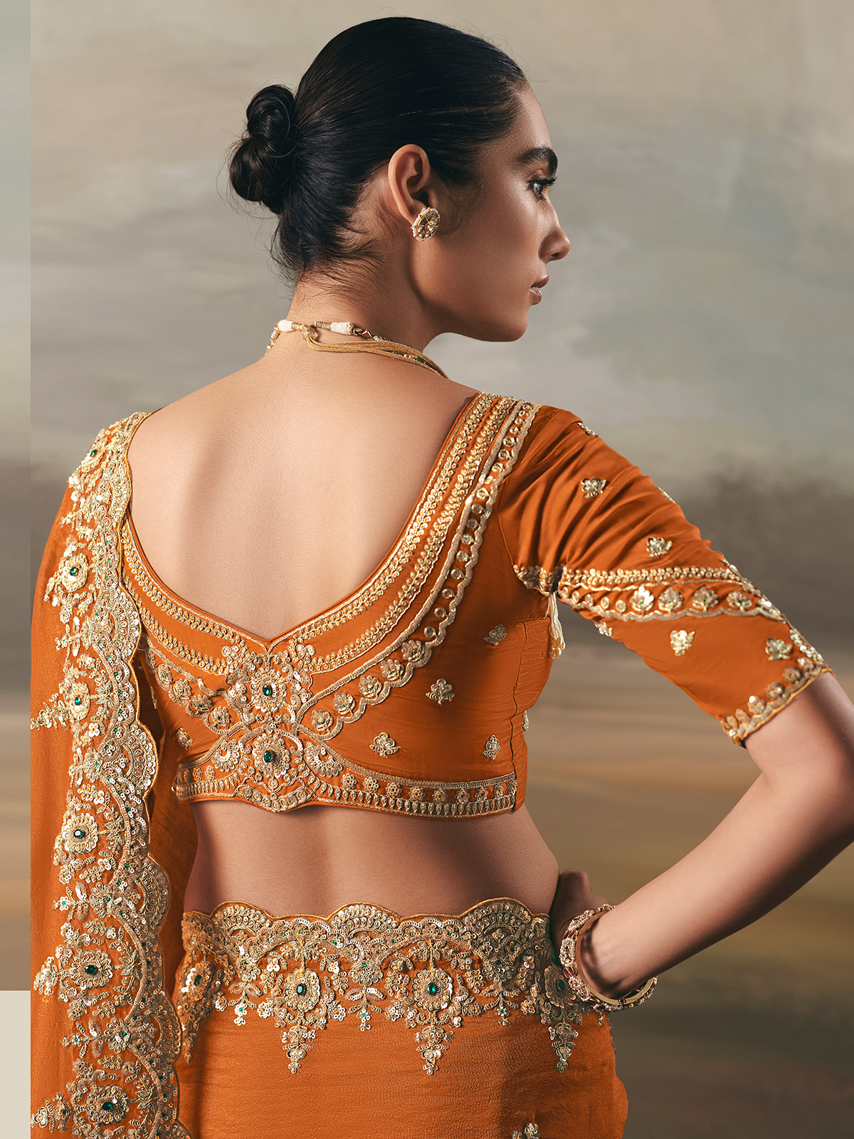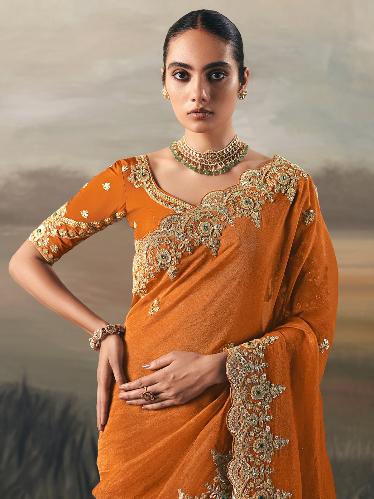 In glowing rust orange tissue silk, this saree unfolds with a warm festive aura and beautifully fluid drape. Intricate resham, sequins and stone accents shimmer gently, casting a refined artistic brightness across every pleat. Paired with an unstitched blouse, it makes a graceful companion for festive gatherings, receptions, wedding functions and polished party occasions.