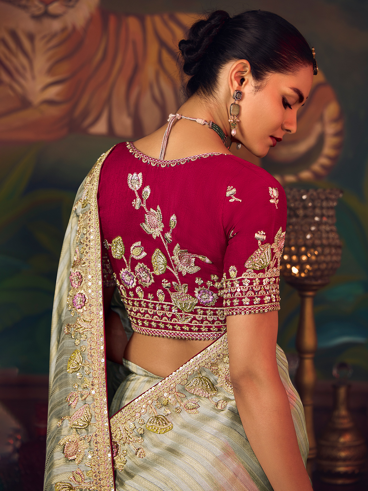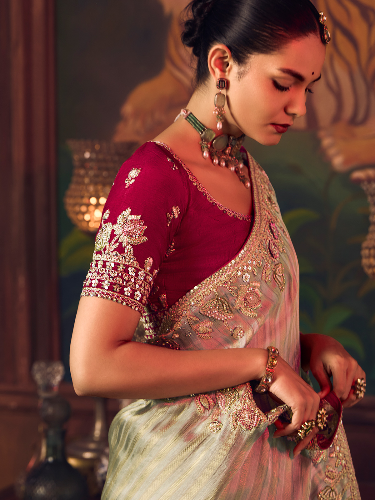Crafted in soothing sage green silk saree. Showcases intricate embroidery enhanced with sequins, pearls, diamond elements and zari work. Completed with a contrast unstitched blouse piece, it offers refined elegance for weddings, festive wear and receptions.