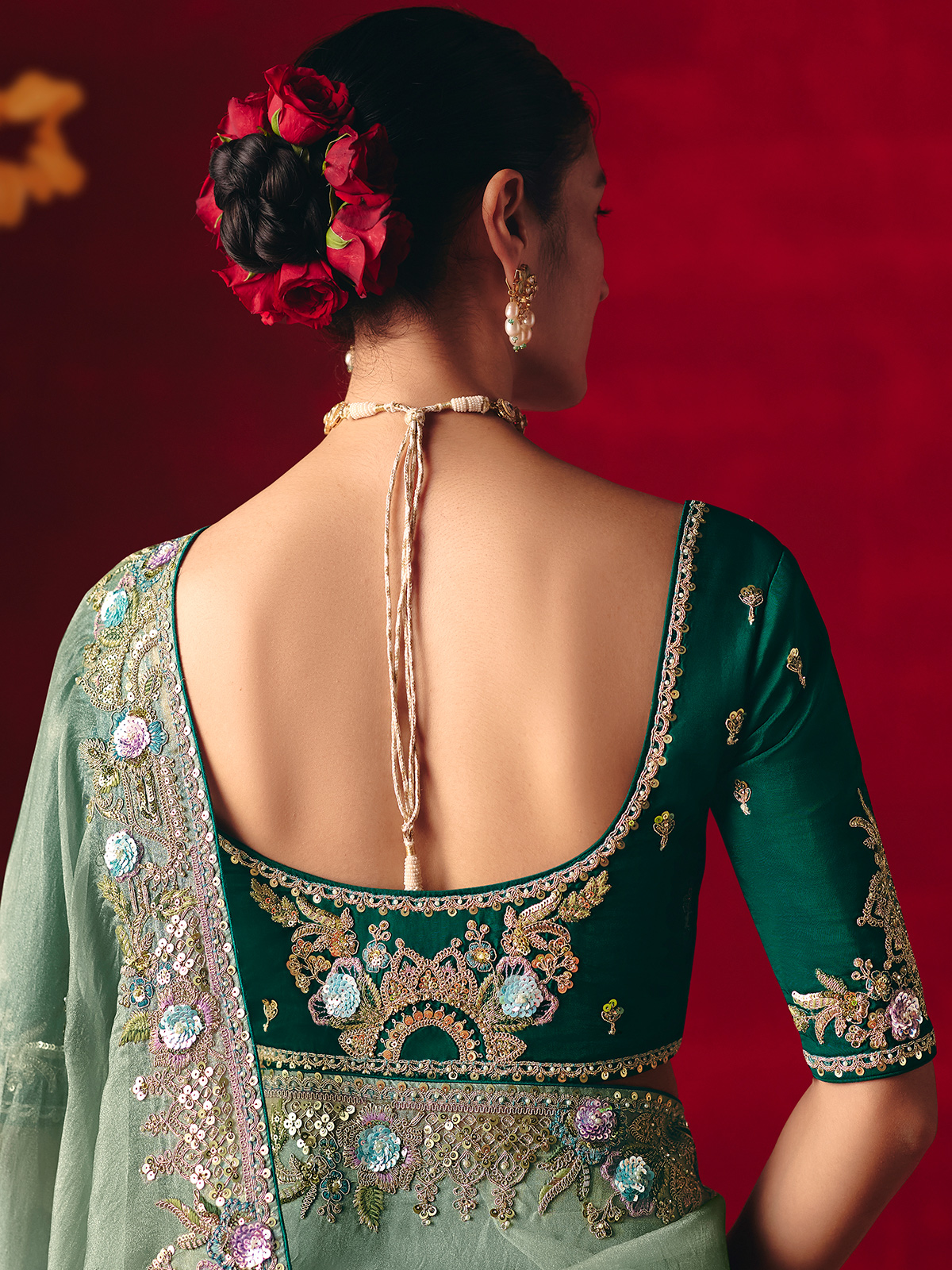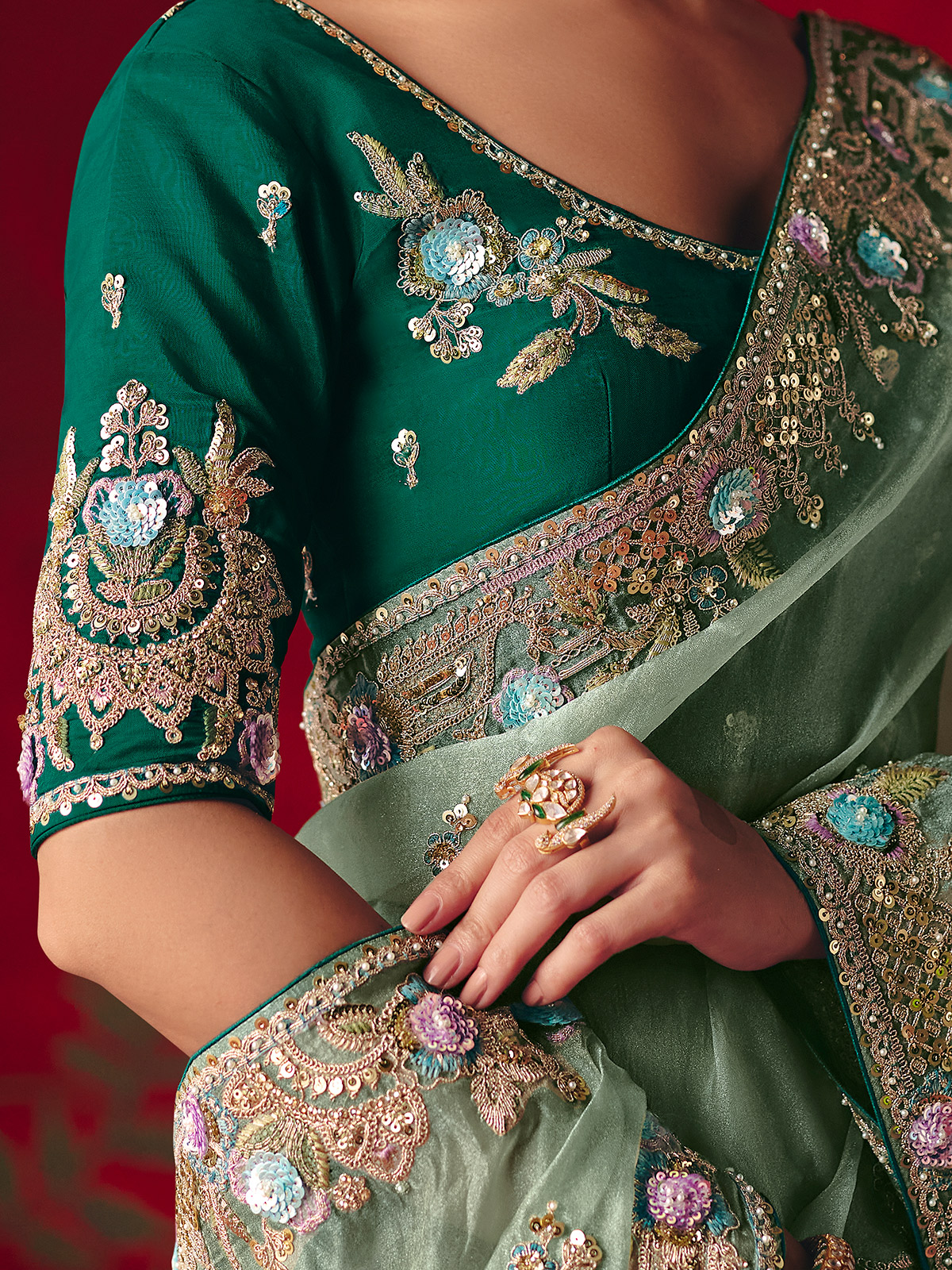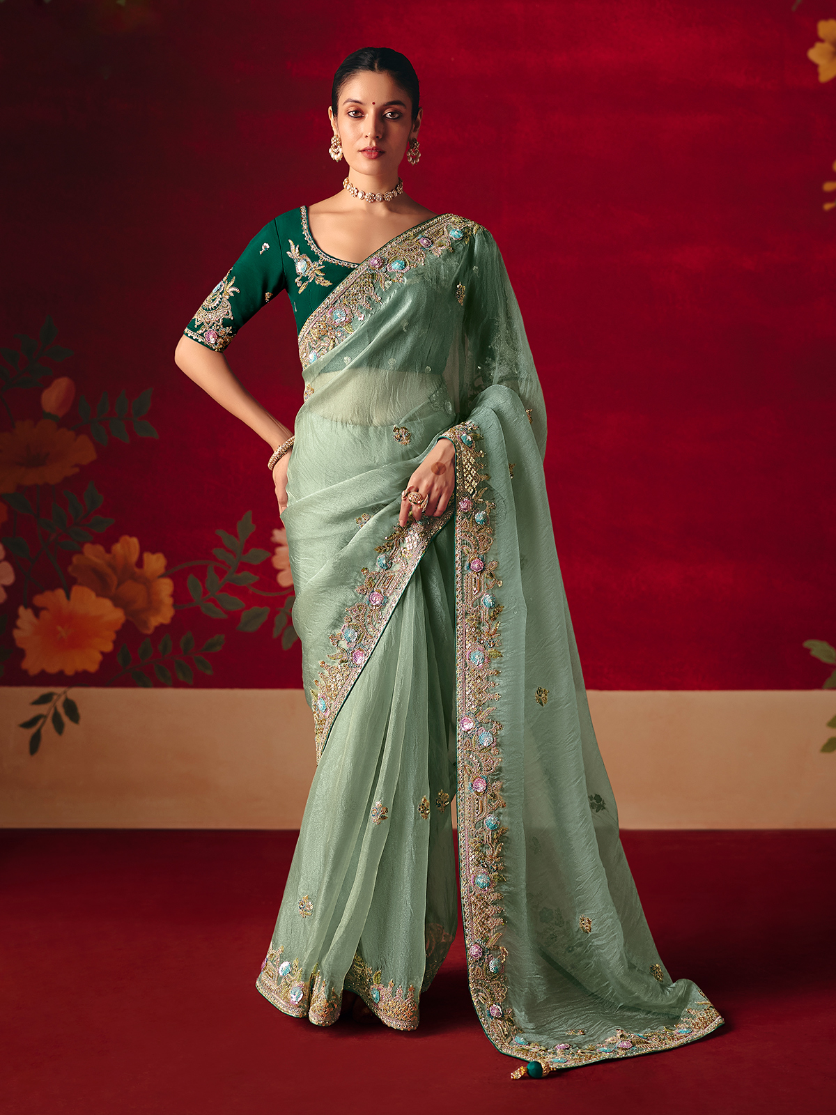 Rendered in soothing sage green tissue organza, this saree is enhanced with fine embroidery accented by sequins, pearls, stone and resham detailing. Paired with a contrast unstitched blouse piece, it is perfect for elegant weddings, festive occasions and refined receptions.