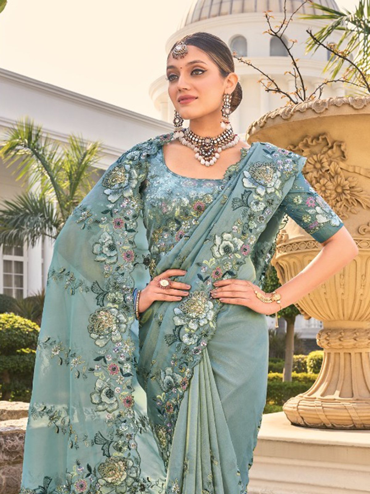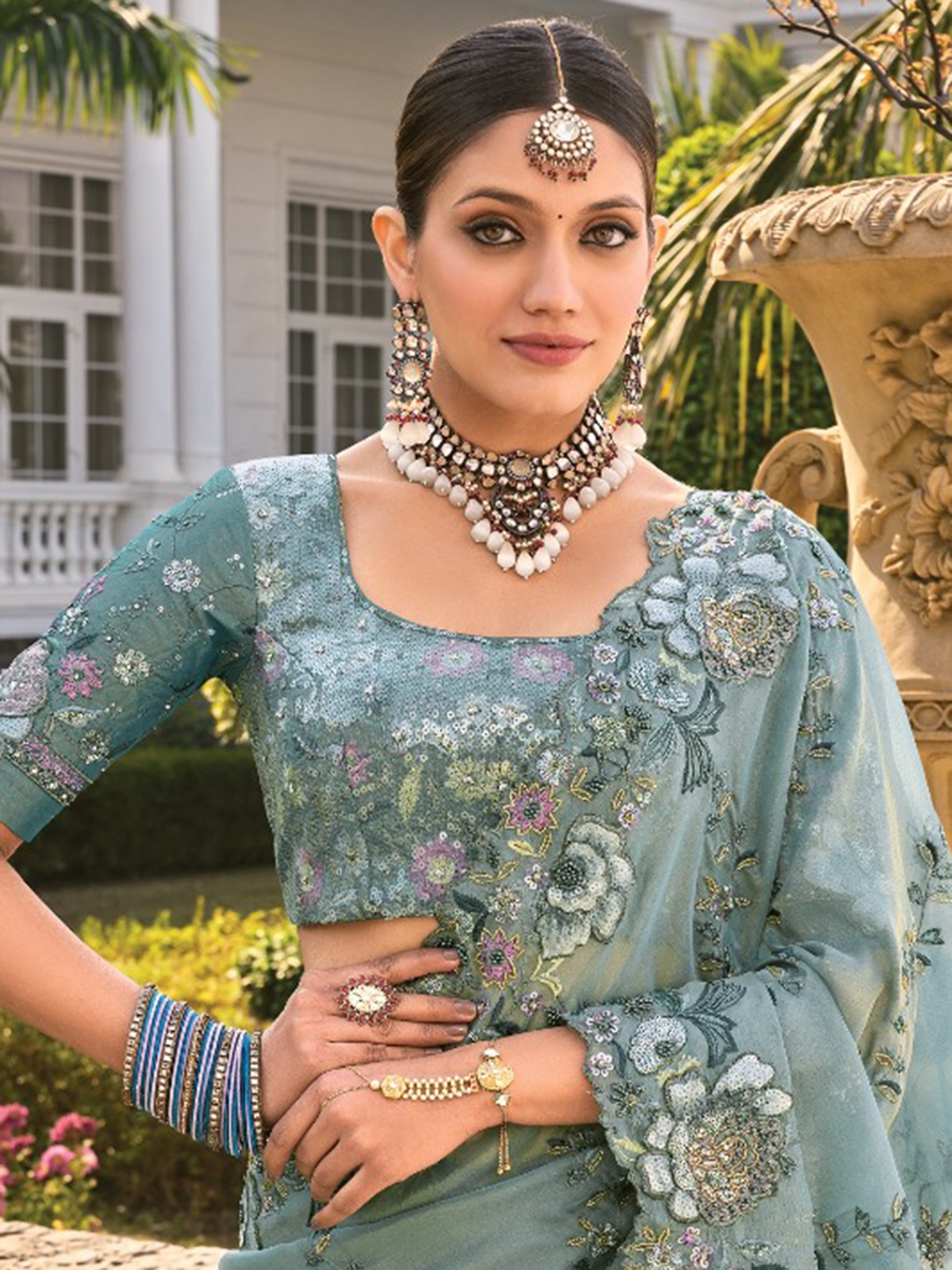 Step into elegance with this sea green silk saree, embellished with intricate sequins, mirror, moti, cutdana, embroidery, and zari work. Perfect for festive and wedding occasions, it includes an unstitched blouse for custom tailoring.
