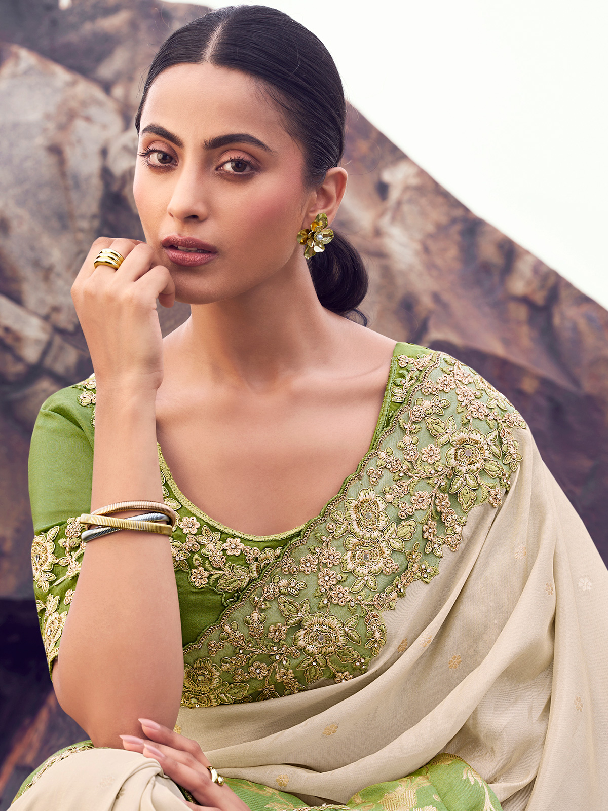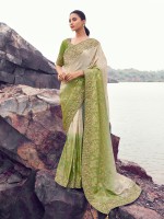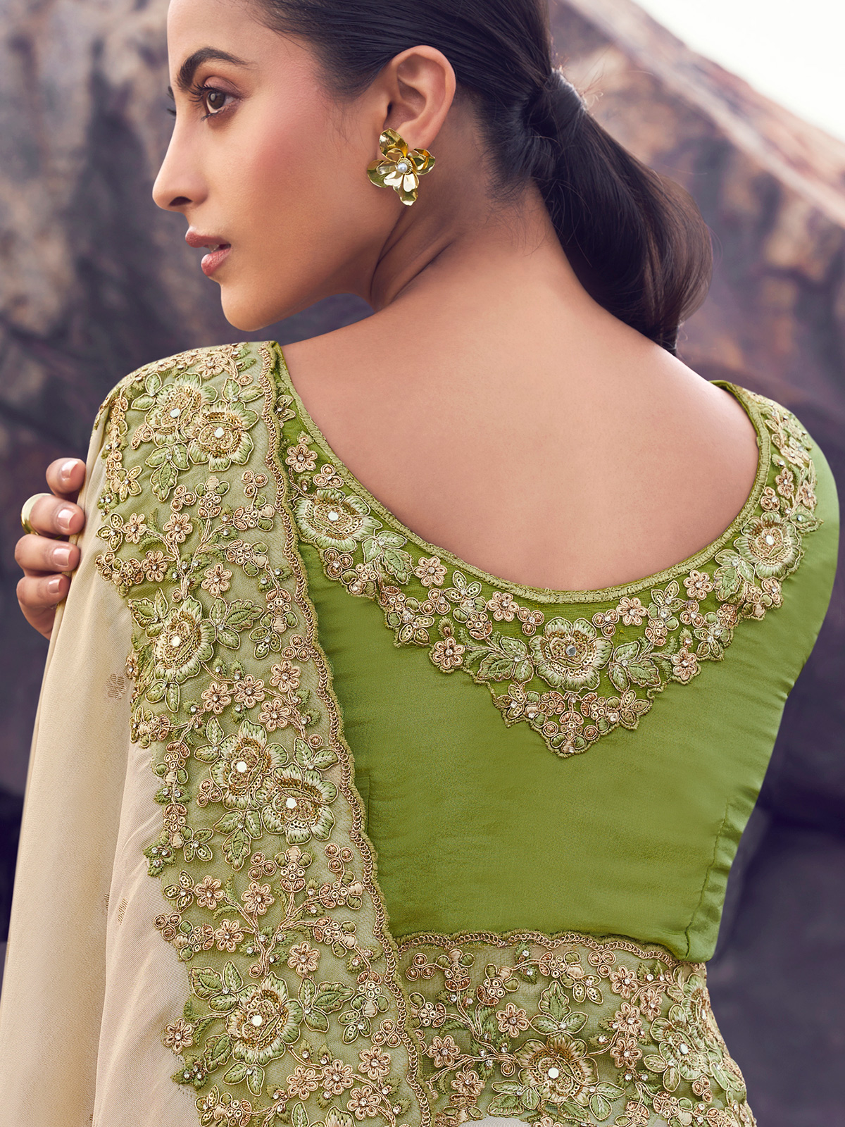 This shaded green tissue silk saree features exquisite zardosi, beads, sequins, zari, embroidery, stone and mirror work. The luxurious drape and unstitched blouse make it ideal for weddings, receptions, sangeet celebrations, festive nights and mehndi functions, offering a beautifully refreshing look.