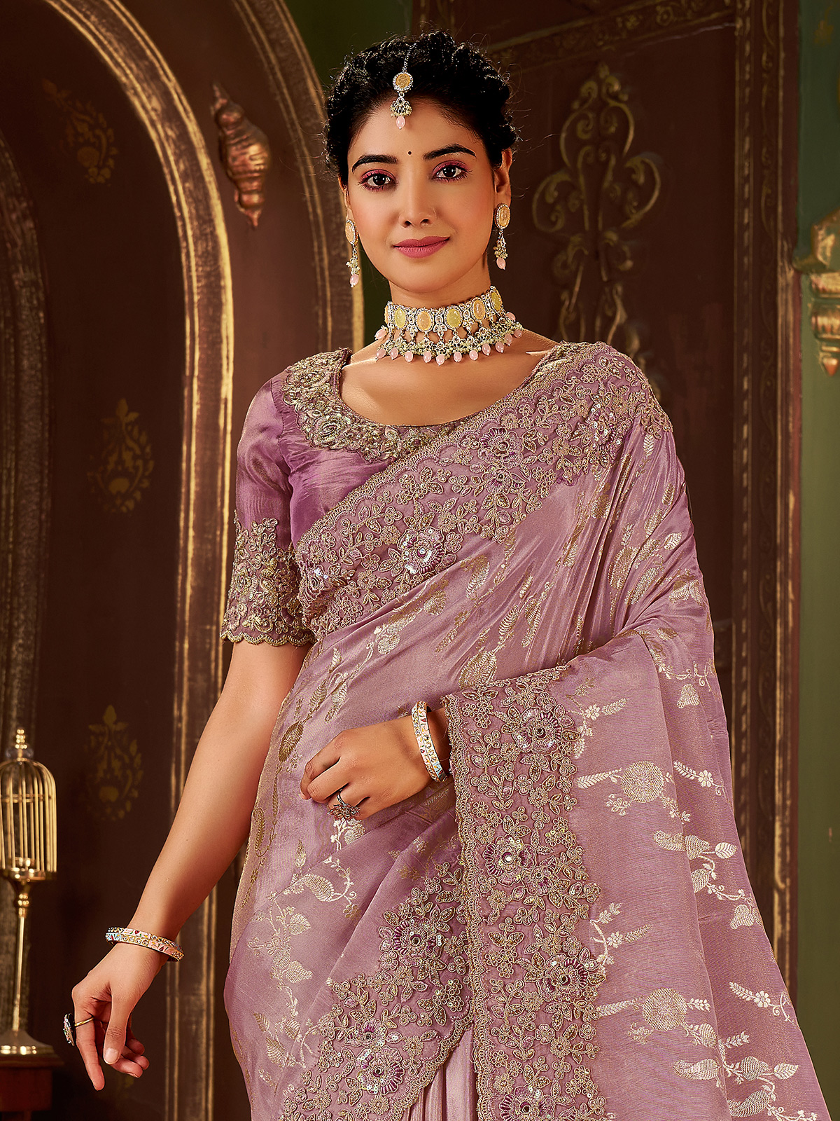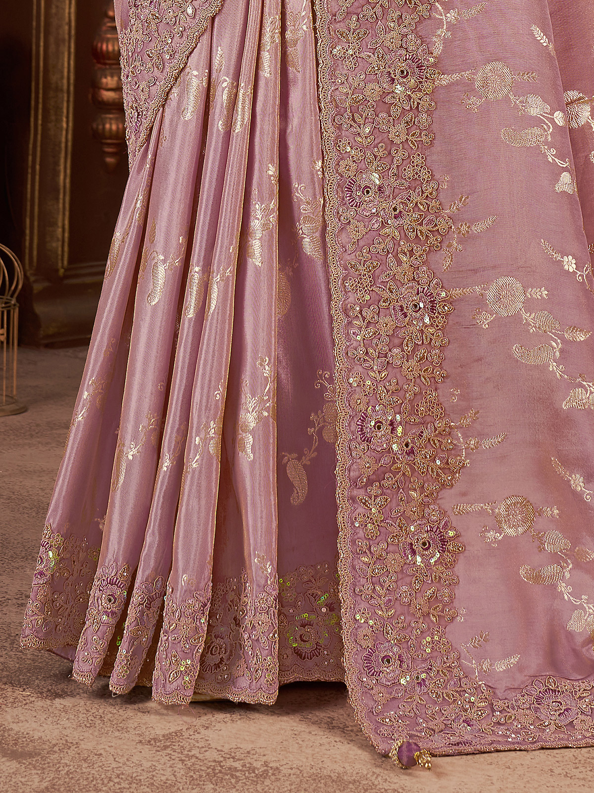 Crafted in shaded lilac purple soft silk, this saree features intricate embroidery with sequins, mirror work, stone, zardosi, and zari. Paired with an unstitched blouse piece, it is ideal for weddings and festive occasions.