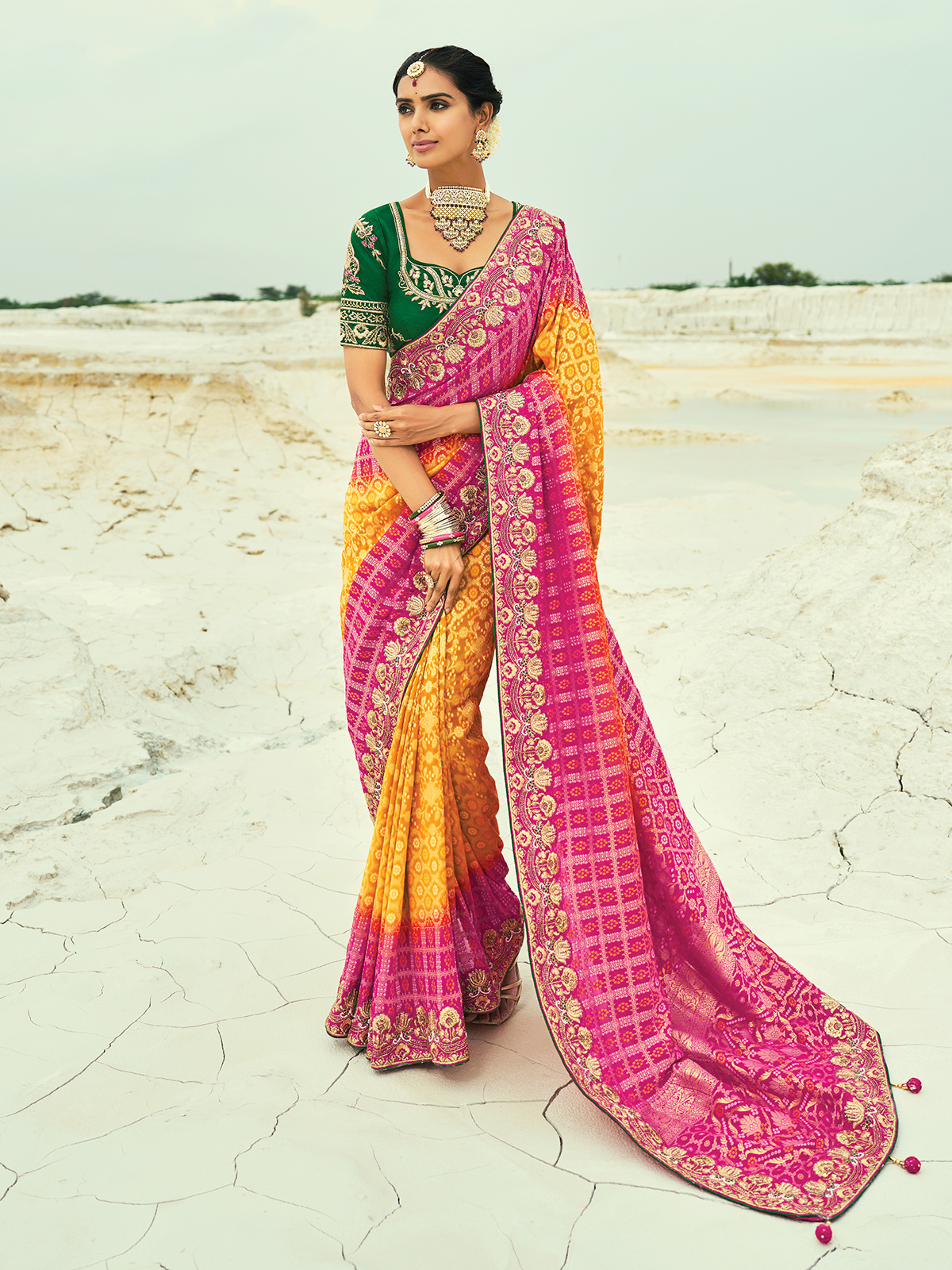 Shaded Mustard Yellow And Rani Bandhej Saree