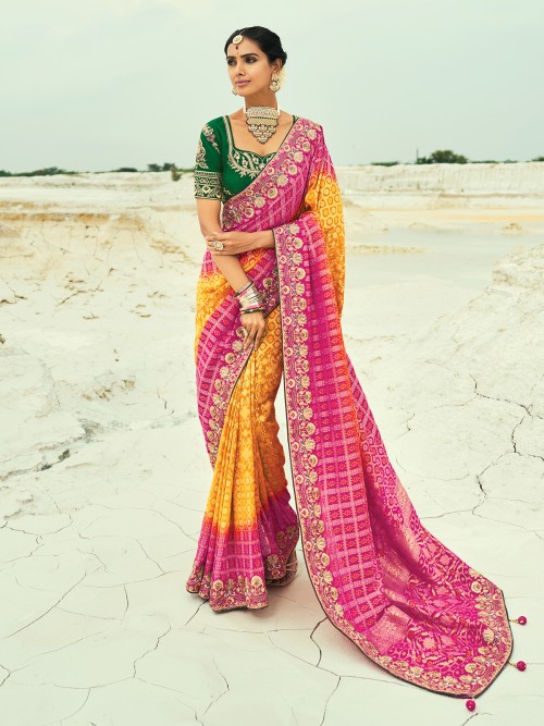 A radiant shaded mustard yellow and rani Bandhej georgette saree, intricately detailed with resham, sequins, cutdana, pearls, thread, zari, and zardosi work. Designed to glow at haldi and wedding ceremonies, it comes with an unstitched blouse, blending elegance and vibrant charm.